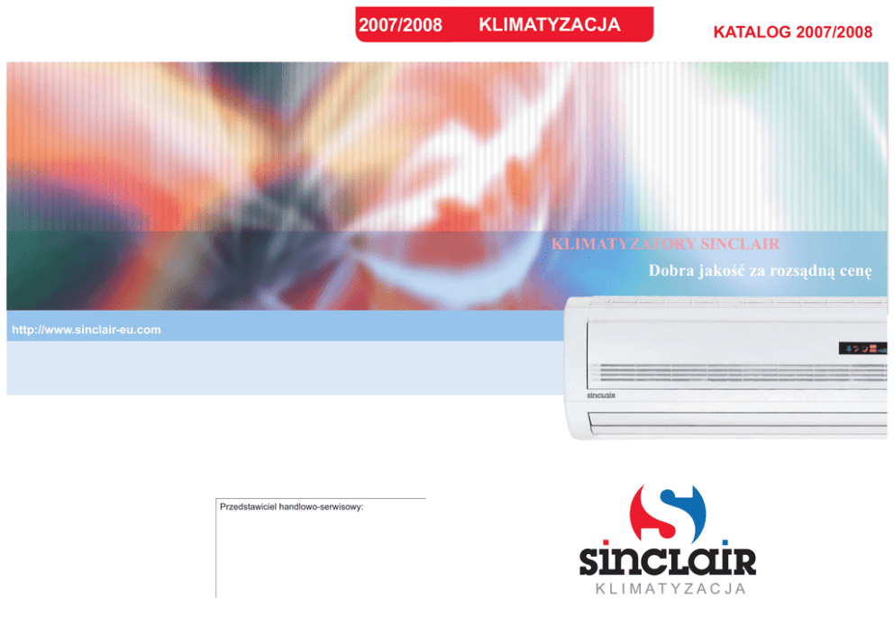 2007/2008 KLIMATYZACJA KATALOG 2007/2008 KLIMATYZATORY SINCLAIR Dobra jakoœæ za rozs¹dn¹ cenê http://www.sinclair-eu.com Przedstawiciel handlowo-serwisowy: K LI MATYZAC JA WITAMY WŒRÓD KLIENTÓW KLIMATYZATORÓW SINCLAIR Dzia³ania firmy i procedury s¹ zgodne z systemem ISO 9001.Produkty SINCLAIR stosuj¹ siê do europejskich standardów w zakresie jakoœci i bezpieczeñstwa. Klimatyzatory SINCLAIR s¹ nowoczesnym i efektywnym rozwi¹zaniem, pozwalaj¹cym tworzyæ komfortowe warunki ¿ycia ludzi. 2007/2008 2007/2008 Od samego pocz¹tku SINCLAIR postawi³ sobie g³ówny cel: dostarczyæ dobry produkt za rozs¹dn¹ cenê. SINCLAIR osi¹gn¹ wysoki poziom jakoœci i niezawodnoœci. Ka¿dy komponent jest starannie dobierany i oceniany, co daje gwarancjê najlepszego wykonania w ca³ym systemie. 2007/2008 2007/2008 KLIMATYZATORY ŒCIENNE SERII QUEEN OSUSZACZE Sprê¿arka japoñskiej jakoœci Antykorozyjna obudowa jedn. zewn. Funkcja AUTO-RESTARTU 24-godzinny programator Ekologiczny i wydajny czynnik ch³odniczy 3-letnia gwarancja Sprê¿arka japoñskiej jakoœci Sterowanie mikroprocesorem Cichy tryb pracy Tryb pracy ci¹g³ej Niski pobór mocy 2-letnia gwarancja ASH - 09AQ ASH - 13AQ ASH - 18AQ ASH - 24AQ ASH - 09+12AQ CFO - 12E CFO - 20E R134A R410A Wysoka skutecznoœæ pompy ciep³a Nastawne ¿aluzje Cichy tryb pracy Filtr biochemiczny Dodatkowa Ekologiczny i warstwa wydajny czynnik ochronna ch³odniczy lameli wymienników Seria QUEEN Typ jednostki Model Wydajnoœæ ASH-13AQ ASH-18AQ ASH-24AQ ASH-09+12AQ Czynnik ch³odniczy R134a Osuszacze Model CFO-12E CFO-20E 3,5 5,3 7 2,5+3,5 Czêstotliwoœæ Hz 50 50 grzanie kW 2,7 3,8 5,6 7,6 2,7+3,7 V 220-240 220-240 50 50 50 50 50 Napiêcie Pobór pr¹du A 0,9 1,8 400 Hz 220-240 220-240 220-240 220-240 220-240 Pobór pr¹du A 4 5,2 8,64 10,2 4,08+6,19 A 4,54 5,6 9,09 10,6 4,4+6,19 Moc wejœciowa ch³odzenie grzanie W 780 1 080 1 950 2 600 860+1200 W 800 1 050 2 000 2 700 860+1200 V ch³odzenie W/W 3,2 3,2 2,9 2,7 2,91 C.O.P Poziom ha³asu - jedn.wew.* grzanie max W/W 3,37 3,6 3,1 2,9 3,1 dB(A) 36 43 43 46 33+40 Poziom ha³asu - jedn.zewn. max dB(A) Przep³yw powietrza m3/h l/h Osuszanie Czynnik ch³odniczy g Iloœæ czynnika ch³odniczego 54 56 55 58 58 480 600 600 850 580 1,3 1,3 1,8 2 1,2+1,3 R410A R410A R410A R410A R410A 1160 1350 1560 1900 900+1250 ciecz cal 1/4 1/4 1/4 3/8 1/4 gaz cal 3/8 1/2 1/2 5/8 3/8+1/2 D³ugoœæ rur max m 15 15 15 15 20 Ró¿nica wysokoœci max m 10 10 10 10 10 Wymiary (d³ x wys x szer) jedn wewn mm 830x285x206 830x285x206 830x285x206 907x290x213 830x285x206 jedn zewn jedn wewn mm 848x540x320 848x540x320 848x540x320 950x700x412 950x700x410 Waga netto kg 11 11 11 12 12 jedn zewn Zakres temperatur pracy max / min kg 40 40 40 59 65 Jednostka wewnêtrzna ch³odzenie °C 32 / 21 32 / 21 32 / 21 32 / 21 32 / 21 grzanie °C 27 / 20 27 / 20 27 / 20 27 / 20 27 / 20 Jednostka zewnêtrzna ch³odzenie °C 43 / 21 43 / 21 43 / 21 43 / 21 43 / 21 grzanie °C 24 / -5 24 / -5 24 / -5 24 / -5 24 / -5 * podany dla œredniej prêdkoœci Cichy tryb pracy 2,5 ch³odzenie grzanie Œrednice rur Tryb pracy ci¹g³ej kW Napiêcie E.E.R Wysokiej jakoœci silnik wentylatora Typ jednostki Seria QUEEN multi ASH-09AQ Rury miedziane o profilu U ch³odzenie Czêstotliwoœæ Dane techniczne Sprê¿arka japoñskiej jakoœci Dane techniczne Sprê¿arka japoñskiej jakoœci Moc wejœciowa W 210 Poziom ha³asu Przep³yw powietrza dB(A) 41 43 m3/h 120 150 Osuszanie Czynnik ch³odniczy l/24h Iloœæ czynnika ch³odniczego Wymiary (d³ x wys x szer) Waga netto 12 20 R134A R134A g 140 170 mm 380 x 545 x 261,5 380 x 545 x 261,5 kg 12,5 14 CICHY TRYB PRACY Mo¿liwoœæ pracy osuszacza w trybie SILENT (niski poziom ha³asu) WYSOKA WYDAJNOŒÆ OSUSZANIA FUNKCJA PRACY NON-STOP Mo¿liwoœæ pracy ci¹g³ej w trybie osuszania NISKI POBÓR MOCY RURY MIEDZIANE W KSZTA£CIE U Dziêki zastosowaniu rur o profilu U (wewnêtrzne karbowanie) uzyskujemy wiêksz¹ wydajnoœæ wymiennika ciep³a, nie zwiêkszaj¹c jego wymiarów zewnêtrznych. WYSOKIEJ JAKOŒCI SILNIK WENTYLATORA Osuszacze s¹ wyposa¿one w wysokiej jakoœci silnik wentylatora, który zapewnia cich¹ pracê i d³u¿sz¹ ¿ywotnoœæ. 2007/2008 2007/2008 Eco DC inverter KLIMATYZATORY PRZENOŒNE KLIMATYZATORY ŒCIENNE SERII QUEEN INVERTER Wydajna sprê¿arka rotacyjna Praca w trybie osuszania Ekologiczny i wydajny czynnik ch³odniczy 24-godzinny programator Wymienny filtr powietrza 2-letnia gwarancja Oszczêdnoœæ energii do 44% Sprê¿arka japoñskiej jakoœci Antykorozyjna obudowa jedn. zewn. Wysoka efektywnoœæ pompy ciep³a Funkcja AUTO-RESTARTU 24-godzinny programator Ekologiczny i wydajny czynnik ch³odniczy 3-letnia gwarancja AMC - 09C AMC - 14Aa AMC - 09C ASH - 09AIQ ASH - 13AIQ ASH - 18AIQ ASH - 09 x 2AIQ ASH - 09 x 3AIQ ASH - 07 x 4AIQ AMC - 14Aa ASH - 07 x 4AIQ Oszczêdnoœæ energii do 44% Sprê¿arka japoñskiej jakoœci Filtr przeciwpleœniowy Mo¿liwy rozruch z niskiego napiêcia R410A R407C R410A Sprê¿arka japoñskiej jakoœci Ekologiczny i wydajny czynnik ch³odniczy Typ jednostki AMC-14Aa 2,6 4,1 Hz 50 50 V 220-240 220-240 A 4,2 5,4 Moc wejœciowa W 1200 1700 E.E.R Poziom ha³asu W/W 2,3 2,0 55 59 m3/h 400 570 l/h 2,2 1,6 R407C R410A Wydajnoœæ Czêstotliwoœæ ch³odzenie Dane techniczne Napiêcie Pobór pr¹du Przep³yw powietrza Osuszanie Czynnik ch³odniczy Iloœæ czynnika ch³odniczego max kW dB(A) Wydajnoœæ Seria QUEEN INVERTER ASH-09x2AIQ ASH-09x3AIQ ASH-7x4AIQ ch³odzenie kW 2,5 (1,0-3,2) 3,5 (2,0-3,8) 4,5 (2,3-5,0) 2,5x2 2,5x3 1,8x4 grzanie kW 2,7 (1,1-4,0) 3,8 (2,0-4,0) 5,0 (2,3-5,3) 2,8x2 2,8x3 2,3x4 50 50 50 50 50 50 220-240 220-240 220-240 220-240 220-240 18,3 ch³odzenie A 4,8 6 10,7 A 5,4 6,2 11,5 10,1 10,9 17,4 grzanie 18,7 18,4 Moc wejœciowa ch³odzenie grzanie W 730 1 270 1 400 1 733 2 680 2 400 W 800 1 300 1 550 1 805 2 750 3 000 E.E.R ch³odzenie grzanie W/W 3,4 4,4 3,21 3,2 2,8 3 W/W 3,4 4,4 3,22 3,3 3 3,7 dB(A) 35 42 45 36 36 36 dB(A) 53 52 56 56 60 60 500 54
