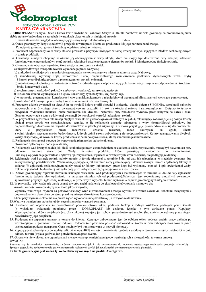 Sprzedawca (dealer) KARTA GWARANCYJNA „DOBROPLAST” Fabryka Okien i Drzwi Pcv z siedzibą w Laskowcu Starym 4, 18-300 Zambrów, udziela gwarancji na produkowaną przez siebie stolarkę budowlaną na zasadach i warunkach określonych w niniejszej umowie: 1. Umowa stanowi bezwzględnie obowiązujący strony załącznik do faktury nr................z dnia..................................... 2. Okres gwarancyjny liczy się od chwili przejęcia towaru przez klienta od producenta lub jego partnera handlowego. Po upływie gwarancji gwarant świadczy odpłatnie usługi serwisowe. 3. Producent odpowiada tylko za wady stolarki powstałe z przyczyn tkwiących w samej rzeczy lub wynikających z błędów technologicznych w czasie produkcji. 4. Gwarancja niniejsza obejmuje w okresie jej obowiązywania: wady ukryte, które nie mogły być dostrzeŜone przy zakupie; właściwe funkcjonowanie mechanizmów i okuć stolarki; właściwe i trwałe połączenie elementów stolarki i ich niezawodne funkcjonowanie. 5. Gwarancja nie obejmuje wyrobów, które uległy uszkodzeniu na skutek: a) nieprawidłowego transportu towaru wykonanego przez Nabywcę, b) uszkodzeń wynikających z niewłaściwego montaŜu wykonywanego we własnym zakresie przez Nabywcę, c) samodzielnej wymiany szyb, uszkodzenie listew, nieprawidłowego rozmieszczona podkładek dystansowych wokół szyby i innych przeróbek niezgodnych z przeznaczeniem stolarki okiennej, d) niewłaściwej eksploatacji - niedroŜności otworów odwadniająco - odpowietrzających, konserwacji i mycia nieodpowiednimi środkami, braku konserwacji okuć, e) mechanicznych uszkodzeń pakietów szybowych – pęknięć, zarysowań, zgnieceń, f) uszkodzeń stolarki wynikających z błędów konstrukcyjnych budynku, złej wentylacji, g) wyroszenia, przemarzania i konsekwencji w/w zjawisk związanych z niewłaściwymi warunkami klimatycznymi wewnątrz pomieszczeń, h) uszkodzeń dokonanych przez osoby trzecie oraz wskutek zdarzeń losowych, 6. Producent udziela gwarancji na okres 5 lat na trwałość koloru profili skrzydeł i ościeŜnic, okucia okienne SIEGENIA, szczelność pakietów szybowych, oraz 3-letniego okresu gwarancyjnego na uszczelki i 1 rok na okucia drzwiowe i samozamykacze. Dotyczy to tylko w przypadku wykonania montaŜu przez producenta lub dealera. Natomiast przy zabudowie wyrobów przez nabywcę na okres 1 roku. Gwarant odpowiada z tytułu udzielonej gwarancji do wysokości wartości zakupionej stolarki. 7. W przypadkach zgłoszenia reklamacji objętych warunkiem gwarancyjnym określonym w pkt. 4, reklamujący zobowiązuje się pokryć koszty obsługi przez serwis wg obowiązującego cennika, o ile reklamacja zostanie odrzucona z winy nieprawidłowej zabudowy lub nieprawidłowego dostosowania wyrobu do warunków w jakich jest uŜywany. Klientowi przysługuje prawo odwołania się do producenta, który w przypadkach braku moŜliwości uznania roszczeń, moŜe skorzystać za zgodą klienta z opinii biegłych rzeczoznawców budowlanych, których opinii strony zobowiązują się podporządkować. Koszty zaangaŜowania biegłych, koszty ekspertyzy, jak równieŜ koszty producenta w pełni pokrywa strona, której stanowisko jest bezzasadne. 8. Reklamacja nie stanowi powodu do wstrzymania płatności za stolarkę okienną. Towar nie opłacony nie podlega reklamacji. 9. Reklamacje wad jawnych takich jak: ilość sztuk niezgodnych z zamówieniem, uszkodzenia szkła, zarysowania, muszą być natychmiast przy odbiorze pisemnie stwierdzone. Wady nieistotne produktu, które pozostają niewidoczne po zamontowaniu i nie mają wpływu na jego wartość uŜytkową np. zarysowania, wgniecenia zewnętrznych stron ościeŜnic, nie podlegają reklamacji. 10. Reklamacje wad i usterek stolarki naleŜy zgłosić w formie pisemnej w terminie 5 dni od daty ich ujawnienia w siedzibie gwaranta lub autoryzowanego przedstawiciela. Warunkiem jej przyjęcia jest okazanie karty gwarancyjnej, dowodu zakupu towaru i opłaconej faktury za stolarkę. W zgłoszeniu reklamacyjnym naleŜy podać nr faktury lub umowy , przez kogo był wykonany montaŜ i opis stwierdzonej wady. Reklamacje stolarki budowlanej nie opłaconej przez nabywcę nie będą przyjmowane i realizowane. 11. Serwis gwarancyjny zapewnia bezpłatne usunięcie wszelkich wad produkcyjnych i materiałowych w terminie 30 dni od daty zgłoszenia (termin moŜe jedynie ulec opóźnieniu z przyczyn niezaleŜnych od producenta).Nabywca jest zobowiązany umoŜliwić gwarantowi sprawdzenie przyczyn zgłoszonej reklamacji, w przeciwnym wypadku termin wykonania napraw gwarancyjnych ulegnie zmianie. 12. W przypadku gdy wada nie da się usunąć a wyrób nadal nadaje się do eksploatacji uŜytkownik ma prawo do: -zwrotu wartości równowaŜącej obniŜenie jakości wyrobu, -wymiany wadliwego wyrobu na pełnowartościowy wraz z wbudowaniem nowego wyrobu w otworze okiennym, robotami związanymi z doprowadzeniem obok okna do stanu przed wymianą-całkowicie na koszt producenta. Klient przy wymianie okna nie ma prawa Ŝądać wykonania innej konstrukcji, niŜ wyrób reklamowany. 13.Wadliwa wymieniona stolarka lub jej części stanowią własność gwaranta. 14. Producent nie odpowiada za prawidłowość pomiaru otworu okna, podziału funkcji i rodzaju oszklenia podanych przez klienta (z wyjątkiem wykonania pomiarów przez DOBROPLAST lub dealera). Ryzyko z tym związane ponosi Kupujący. W przypadku kształtów specjalnych (np. okna łukowe) kupujący jest zobowiązany dostarczyć szablon (lub szkic) sporządzony przez niego i potwierdzony jego podpisem. 15. Producent nie zapewnia transportu towaru do klienta. Kupujący zobowiązany jest do odbioru okien podczas godzin pracy zakładu po wcześniejszym uzgodnieniu terminu odbioru. Jednocześnie powinien posiadać odpowiednie środki w celu zabezpieczenia towaru przed uszkodzeniem podczas transportu. Okna powinny być transportowane w pozycji pionowej. 16. Kupujący jest zobowiązany do zap