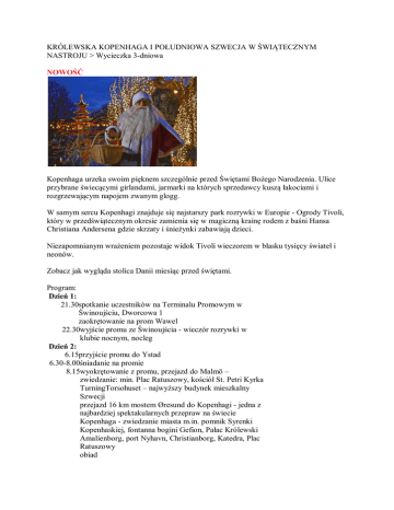 KRÓLEWSKA KOPENHAGA I POŁUDNIOWA SZWECJA W ŚWIĄTECZNYM NASTROJU > Wycieczka 3-dniowa NOWOŚĆ Kopenhaga urzeka swoim pięknem szczególnie przed Świętami Bożego Narodzenia. Ulice przybrane świecącymi girlandami, jarmarki na których sprzedawcy kuszą łakociami i rozgrzewającym napojem zwanym glogg. W samym sercu Kopenhagi znajduje się najstarszy park rozrywki w Europie - Ogrody Tivoli, który w przedświątecznym okresie zamienia się w magiczną krainę rodem z baśni Hansa Christiana Andersena gdzie skrzaty i śnieżynki zabawiają dzieci. Niezapomnianym wrażeniem pozostaje widok Tivoli wieczorem w blasku tysięcy świateł i neonów. Zobacz jak wygląda stolica Danii miesiąc przed świętami. Program: Dzień 1: 21.30spotkanie uczestników na Terminalu Promowym w Świnoujściu, Dworcowa 1 zaokrętowanie na prom Wawel 22.30wyjście promu ze Świnoujścia - wieczór rozrywki w klubie nocnym, nocleg Dzień 2: 6.15przyjście promu do Ystad 6.30-8.00śniadanie na promie 8.15wyokrętowanie z promu, przejazd do Malmö – zwiedzanie: min. Plac Ratuszowy, kościół St. Petri Kyrka TurningTorsohuset – najwyższy budynek mieszkalny Szwecji przejazd 16 km mostem Øresund do Kopenhagi - jedna z najbardziej spektakularnych przepraw na świecie Kopenhaga - zwiedzanie miasta m.in. pomnik Syrenki Kopenhaskiej, fontanna bogini Gefion, Pałac Królewski Amalienborg, port Nyhavn, Christianborg, Katedra, Plac Ratuszowy obiad wizyta w Browarze Carlsberg połaczona z degustacją świątecznego piwa czas wolny na deptaku Strøget 18.30wejście do parku rozrywki Tivoli - świąteczny jarmark 20.30powrót do Ystad 22.15kolacja, nocleg na promie Baltivia Dzień 3: 7.00-9.00śniadanie na promie wyokrętowanie z promu; spacer po Ystad: kościół St.Maria Kykra, klasztor Franciszkanów, Plac Ratuszowy 13.00zaokrętowanie na prom Wawel 14.00wyjście promu z Ystad obiad w restauracji na promie relaks na pokładzie - seans w kinie lub dyskoteka 18.00podwieczorek z niespodzianką 20.00przyjście promu do Świnoujścia, zakończenie imprezy Terminy i cena: SZ/134 06-08.12.2014 655 PLN (osoba) Zamów Oferta zawiera: przejazd promami na trasie Świnoujście –Ystad – Świnoujście miejsce w kabinie 4- osobowej z łazienką w rejsie nocnym przejazd mosto-tunelem przez cieśninę Øresund wyżywienie: na promie: 2 śniadania, obiad, kolacja, podwieczorek w Kopenhadze: obiad nocleg na promie w Ystad opieka pilota – przewodnika zwiedzanie Kopenhagi, Malmo ,Ystad wstęp do Muzeum Browaru Carslsberg oraz do świątecznych ogrodów Tivoli autokar ubezpieczenie KL i NNW TU EUROPA STANDARD Dopłaty:- do kabiny 2-osobowej 50 zł osoba