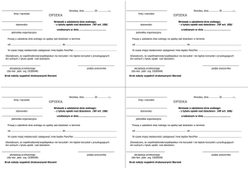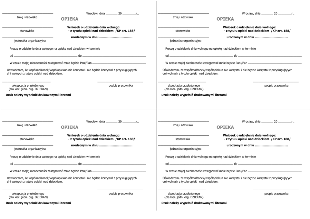——————————————————— Imię i nazwisko Wrocław, dnia ——————— 20 ————————r., OPIEKA ——————————————————— Imię i nazwisko Wrocław, dnia ——————— 20 ————————r., OPIEKA ——————————————————— stanowisko Wniosek o udzielenie dnia wolnego: - z tytułu opieki nad dzieckiem /KP art. 188/ ——————————————————— stanowisko Wniosek o udzielenie dnia wolnego: - z tytułu opieki nad dzieckiem /KP art. 188/ ——————————————————— jednostka organizacyjna urodzonym w dniu .................................... ——————————————————— jednostka organizacyjna urodzonym w dniu .................................... Proszę o udzielenie dnia wolnego na opiekę nad dzieckiem w terminie Proszę o udzielenie dnia wolnego na opiekę nad dzieckiem w terminie od —————————————————————————————————————— do od —————————————————————————————————————— do —————————————————————————————————————— W czasie mojej nieobecności zastępować mnie będzie Pani/Pan ———————————————————————————————— Oświadczam, Ŝe współmałŜonek/współopiekun nie korzystał i nie będzie korzystał z przysługujących dni wolnych z tytułu opieki nad dzieckiem. —————————————————— akceptacja przełoŜonego (dla kier. jedn. org. DZIEKAN) ————————————————— podpis pracownika Druk naleŜy wypełnić drukowanymi literami ——————————————————— Imię i nazwisko —————————————————————————————————————— W czasie mojej nieobecności zastępować mnie będzie Pani/Pan ———————————————————————————————— Oświadczam, Ŝe współmałŜonek/współopiekun nie korzystał i nie będzie korzystał z przysługujących dni wolnych z tytułu opieki nad dzieckiem. —————————————————— akceptacja przełoŜonego (dla kier. jedn. org. DZIEKAN) ————————————————— podpis pracownika Druk naleŜy wypełnić drukowanymi literami Wrocław, dnia ——————— 20 ————————r., OPIEKA ——————————————————— Imię i nazwisko Wrocław, dnia ——————— 20 ————————r., OPIEKA ——————————————————— stanowisko Wniosek o udzielenie dnia wolnego: - z tytułu opieki nad dzieckiem /KP art. 188/ ——————————————————— stanowisko Wniosek o udzielenie dnia wolnego: - z tytułu opieki nad dzieckiem /KP art. 188/ ——————————————————— jednostka organizacyjna urodzonym w dniu .................................... ——————————————————— jednostka organizacyjna urodzonym w dniu .................................... Proszę o udzielenie dnia wolnego na opiekę nad dzieckiem w terminie Proszę o udzielenie dnia wolnego na opiekę nad dzieckiem w terminie od —————————————————————————————————————— do od —————————————————————————————————————— do —————————————————————————————————————— W czasie mojej nieobecności zastępować mnie będzie Pani/Pan ———————————————————————————————— Oświadczam, Ŝe współmałŜonek/współopiekun nie korzystał i nie będzie korzystał z przysługujących dni wolnych z tytułu opieki nad dzieckiem. —————————————————— akceptacja przełoŜonego (dla kier. jedn. org. DZIEKAN) Druk naleŜy wypełnić drukowanymi literami ————————————————— podpis pracownika —————————————————————————————————————— W czasie mojej nieobecności zastępować mnie będzie Pani/Pan ———————————————————————————————— Oświadczam, Ŝe współmałŜonek/współopiekun nie korzystał i nie będzie korzystał z przysługujących dni wolnych z tytułu opieki nad dzieckiem. —————————————————— akceptacja przełoŜonego (dla kier. jedn. org. DZIEKAN) Druk naleŜy wypełnić drukowanymi literami ————————————————— podpis pracownika
