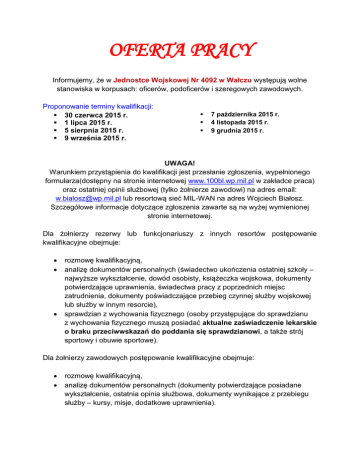 OFERTA PRACY Informujemy, że w Jednostce Wojskowej Nr 4092 w Wałczu występują wolne stanowiska w korpusach: oficerów, podoficerów i szeregowych zawodowych. Proponowanie terminy kwalifikacji: 30 czerwca 2015 r. 1 lipca 2015 r. 5 sierpnia 2015 r. 9 września 2015 r. 7 października 2015 r. 4 listopada 2015 r. 9 grudnia 2015 r. UWAGA! Warunkiem przystąpienia do kwalifikacji jest przesłanie zgłoszenia, wypełnionego formularza(dostępny na stronie internetowej www.100bl.wp.mil.pl w zakładce praca) oraz ostatniej opinii służbowej (tylko żołnierze zawodowi) na adres email: [email protected] lub resortową sieć MIL-WAN na adres Wojciech Białosz. Szczegółowe informacje dotyczące zgłoszenia zawarte są na wyżej wymienionej stronie internetowej. Dla żołnierzy rezerwy lub funkcjonariuszy z innych resortów postępowanie kwalifikacyjne obejmuje: rozmowę kwalifikacyjną, analizę dokumentów personalnych (świadectwo ukończenia ostatniej szkoły – najwyższe wykształcenie, dowód osobisty, książeczka wojskowa, dokumenty potwierdzające uprawnienia, świadectwa pracy z poprzednich miejsc zatrudnienia, dokumenty poświadczające przebieg czynnej służby wojskowej lub służby w innym resorcie), sprawdzian z wychowania fizycznego (osoby przystępujące do sprawdzianu z wychowania fizycznego muszą posiadać aktualne zaświadczenie lekarskie o braku przeciwwskazań do poddania się sprawdzianowi, a także strój sportowy i obuwie sportowe). Dla żołnierzy zawodowych postępowanie kwalifikacyjne obejmuje: rozmowę kwalifikacyjną, analizę dokumentów personalnych (dokumenty potwierdzające posiadane wykształcenie, ostatnia opinia służbowa, dokumenty wynikające z przebiegu służby – kursy, misje, dodatkowe uprawnienia). Sprawy organizacyjne: 1. W czasie trwania kwalifikacji istnieje możliwość zakwaterowania. 2. Terminy kwalifikacji są uzgadniane indywidualnie. 3. Istnieje możliwość wydania zaświadczenia szeregowym zawodowym o możliwości wyznaczenia na stanowisko podoficerskie o STE: podoficer młodszy. ZESTAWIENIE WOLNYCH STANOWISK SŁUŻBOWYCH Nazwa stanowiska Stopień etatowy stanowiska 1 specjalność wojskowa 2 specjalność wojskowa Wymagane pośw. bezpieczeństwa Uwagi W KORPUSIE OFICERÓW LEKARZ podporucznik porucznik medycyna ogólna TAJNE DOWÓDCA PLUTONU podporucznik porucznik eksploatacja systemów łączności i informatyki TAJNE ASYSTENT FINANSOWY DOWÓDCY podporucznik porucznik ogólnoekonomiczna TAJNE W KORPUSIE PODOFICERÓW DOWÓDCA APARATOWNI RWŁC sierżant starszy sierżant młodszy chorąży obsługa urządzeń kryptograficznych STARSZY OPERATOR kapral starszy kapral plutonowy obsługa urządzeń kryptograficznych ADMINISTRATOR SIECI INFORMATYCZNEJ kapral starszy kapral plutonowy ADMINISTRATOR SIECI INFORMATYCZNYCH sierżant starszy sierżant młodszy chorąży STARSZY ADMINISTRATOR SYSTEMU sierżant starszy sierżant młodszy chorąży STARSZY TECHNIK sierżant starszy sierżant młodszy chorąży obsługa urządzeń i aparatowni transmisyjnych obsługa urządzeń i aparatowni transmisyjnych zarządzanie i administrowanie lokalnymi sieciami komputerowymi zarządzanie i administrowanie lokalnymi sieciami komputerowymi zarządzanie i administrowanie lokalnymi sieciami komputerowymi obsługa urządzeń satelitarnych TAJNE TAJNE ŚCIŚLE TAJNE obowiązuje test kwalifikacyjny ŚCIŚLE TAJNE obowiązuje test kwalifikacyjny ŚCIŚLE TAJNE obowiązuje test kwalifikacyjny POUFNE W KORPUSIE SZEREGOWYCH ZAWODOWYCH MONTER szeregowy starszy szeregowy budowa i obsługa polowych sieci kablowych brak MŁODSZY KIEROWCA szeregowy starszy szeregowy kierowca kat. C brak KIEROWCA ELEKTROMECHANIK szeregowy starszy szeregowy MŁODSZY KIEROWCA MAGAZYNIER szeregowy starszy szeregowy szeregowy starszy szeregowy szeregowy starszy szeregowy MŁODSZY KUCHARZ RATOWNIK kierowca kat. C+E kierowca kat. C obsługa urządzeń zasilających obsługa magazynu brak brak kucharz brak ratownik brak UWAGA! Przed udaniem się na kwalifikacje należy upewnić się o celowości wyjazdu – informacje można otrzymać w WKU w Garwolinie: pokój nr 9, tel. 25 682 23 15 w. 9259 lub 261 518 959 oraz w jednostce wojskowej: tel. 261 472 027.