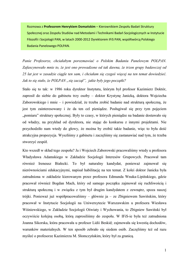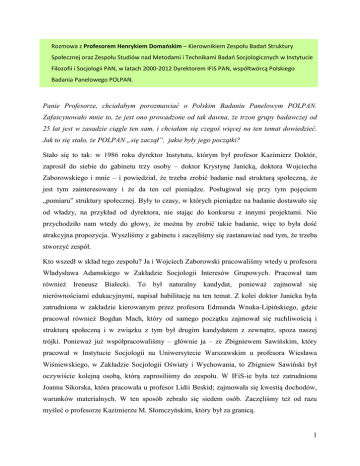 Rozmowa z Profesorem Henrykiem Domańskim – Kierownikiem Zespołu Badań Struktury Społecznej oraz Zespołu Studiów nad Metodami i Technikami Badań Socjologicznych w Instytucie Filozofii i Socjologii PAN, w latach 2000-2012 Dyrektorem IFiS PAN, współtwórcą Polskiego Badania Panelowego POLPAN. Panie Profesorze, chciałabym porozmawiać o Polskim Badaniu Panelowym POLPAN. Zafascynowało mnie to, że jest ono prowadzone od tak dawna, że trzon grupy badawczej od 25 lat jest w zasadzie ciągle ten sam, i chciałam się czegoś więcej na ten temat dowiedzieć. Jak to się stało, że POLPAN „się zaczął”, jakie były jego początki? Stało się to tak: w 1986 roku dyrektor Instytutu, którym był profesor Kazimierz Doktór, zaprosił do siebie do gabinetu trzy osoby – doktor Krystynę Janicką, doktora Wojciecha Zaborowskiego i mnie – i powiedział, że trzeba zrobić badanie nad strukturą społeczną, że jest tym zainteresowany i że da ten cel pieniądze. Posługiwał się przy tym pojęciem „pomiaru” struktury społecznej. Były to czasy, w których pieniądze na badanie dostawało się od władzy, na przykład od dyrektora, nie stając do konkursu z innymi projektami. Nie przychodziło nam wtedy do głowy, że można by zrobić takie badanie, więc to była dość atrakcyjna propozycja. Wyszliśmy z gabinetu i zaczęliśmy się zastanawiać nad tym, że trzeba stworzyć zespół. Kto wszedł w skład tego zespołu? Ja i Wojciech Zaborowski pracowaliśmy wtedy u profesora Władysława Adamskiego w Zakładzie Socjologii Interesów Grupowych. Pracował tam również Ireneusz Białecki. To był naturalny kandydat, ponieważ zajmował się nierównościami edukacyjnymi, napisał habilitację na ten temat. Z kolei doktor Janicka była zatrudniona w zakładzie kierowanym przez profesora Edmunda Wnuka-Lipińskiego, gdzie pracował również Bogdan Mach, który od samego początku zajmował się ruchliwością i strukturą społeczną i w związku z tym był drugim kandydatem z zewnątrz, spoza naszej trójki. Ponieważ już współpracowaliśmy – głównie ja – ze Zbigniewem Sawińskim, który pracował w Instytucie Socjologii na Uniwersytecie Warszawskim u profesora Wiesława Wiśniewskiego, w Zakładzie Socjologii Oświaty i Wychowania, to Zbigniew Sawiński był oczywiście kolejną osobą, którą zaprosiliśmy do zespołu. W IFiS-ie była też zatrudniona Joanna Sikorska, która pracowała u profesor Lidii Beskid; zajmowała się kwestią dochodów, warunków materialnych. W ten sposób zebrało się siedem osób. Zaczęliśmy też od razu myśleć o profesorze Kazimierzu M. Słomczyńskim, który był za granicą. 1 Tak to się zaczęło kształtować, tak się zarysował zespół. Zaczęliśmy się spotykać i zastanawiać, jak to badanie przeprowadzić. Zdawaliśmy sobie sprawę, że pieniądze na to badanie byłyby spore i trzeba je zrobić z pewnym rozmachem. Na początku ja byłem kierownikiem tej grupy, a później profesor Słomczyński. Czy to była grupa formalnie powołana, czy po prostu osoby, które ze sobą współpracowały? Nie pamiętam jakiegoś konkretnego momentu formalizacji. Na pewno dyrekcja wiedziała, że taka grupa już jest i że ona przeprowadzi to badanie. Zaczęto też o tym mówić w Instytucie – pamiętam to dlatego, że w zasadzie powstało pytanie: dlaczego oni mają robić? Dlaczego oni mają wziąć pieniądze na to badanie, podczas gdy można by robić inne badania? To, że my się „nadajemy” do robienia badań nad strukturą społeczną nie było dyskutowane, natomiast mówiono, że można przecież zrobić jakieś inne badania, więc dlaczego akurat to? W każdym razie grupa zaistniała, ukonstytuowała się i osoby z Instytutu, które interesowały się badaniami – socjologowie, bo filozofowie raczej nie – miały tego świadomość. Po kilku miesiącach przyjechał profesor Słomczyński i wtedy od razu doszliśmy do wniosku, że on powinien tym kierować. Nie jestem pewien, czy był już wtedy pracownikiem Instytutu, czy nie. Zaczęliśmy się spotykać w gronie tych osób, które wymieniłem – chyba nikogo nie pominąłem. Czy wie Pan, dlaczego zostały przyznane pieniądze akurat na to badanie? Nie. Myślę, że problematyka struktury społecznej – tak jak to widzę z perspektywy tych dziesięcioleci – jest czymś, co po prostu budzi zainteresowanie. Co jakiś czas socjologowie, którzy się nie zajmują strukturą – i nie tylko zresztą socjologowie – stawiają takie pytanie: jak ta struktura społeczna wygląda? Kazimierz Doktór powiedział wtedy, że właściwie nie wiadomo, jak ona w Polsce wygląda, bo rzeczywiście nikt tego nie badał przedtem w skali ogólnopolskiej, nie powstała żadna książka na ten temat. Myślę, że to mógł być powód. Nie można też wykluczyć – pojawiły się takie interpretacje – pewnego rodzaju rozgrywek polityczno-personalnych. Znam na przykład takie wyjaśnienie, że chodziło o rozbicie Zakładu Socjologii Interesów Grupowych, kierowanego przez profesora Adamskiego – tego, w którym pracowałem ja, Zaborowski i Białecki. Ten Zakład z perspektywy ówczesnych władz mógł być postrzegany w pewnym stopniu jako ośrodek kontestacji, ponieważ trzeba pamiętać, że profesor Adamski kierował badaniem „Polacy”, które zostało zainicjowane w 80. roku, a następnie było kontynuowane w roku osiemdziesiątym pierwszym, czwartym i później. Osobliwe, że można było badanie traktować jako coś takiego, co mogło pobudzać do 2 kontestacji. W kwestionariuszu „Polaków” były pytania dotyczące m. in. stosunku do władzy. Badanie to było kojarzone z „Solidarnością”. Z kolei badania nad strukturą społeczną są raczej postrzegane jako coś neutralnego, a nawet przypisanego do teorii funkcjonalnej, jako coś, co sprzyja konserwacji systemu. Może rzeczywiście coś takiego było, trzeba byłoby zapytać o to Kazimierza Doktora. Czy jesz