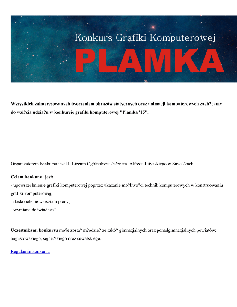 Wszystkich zainteresowanych tworzeniem obrazów statycznych oraz animacji komputerowych zach?camy do wzi?cia udzia?u w konkursie grafiki komputerowej "Plamka '15". Organizatorem konkursu jest III Liceum Ogólnokszta?c?ce im. Alfreda Lity?skiego w Suwa?kach. Celem konkursu jest: - upowszechnienie grafiki komputerowej poprzez ukazanie mo?liwo?ci technik komputerowych w konstruowaniu grafiki komputerowej, - doskonalenie warsztatu pracy, - wymiana do?wiadcze?. Uczestnikami konkursu mo?e zosta? m?odzie? ze szkó? gimnazjalnych oraz ponadgimnazjalnych powiatów: augustowskiego, sejne?skiego oraz suwalskiego. Regulamin konkursu