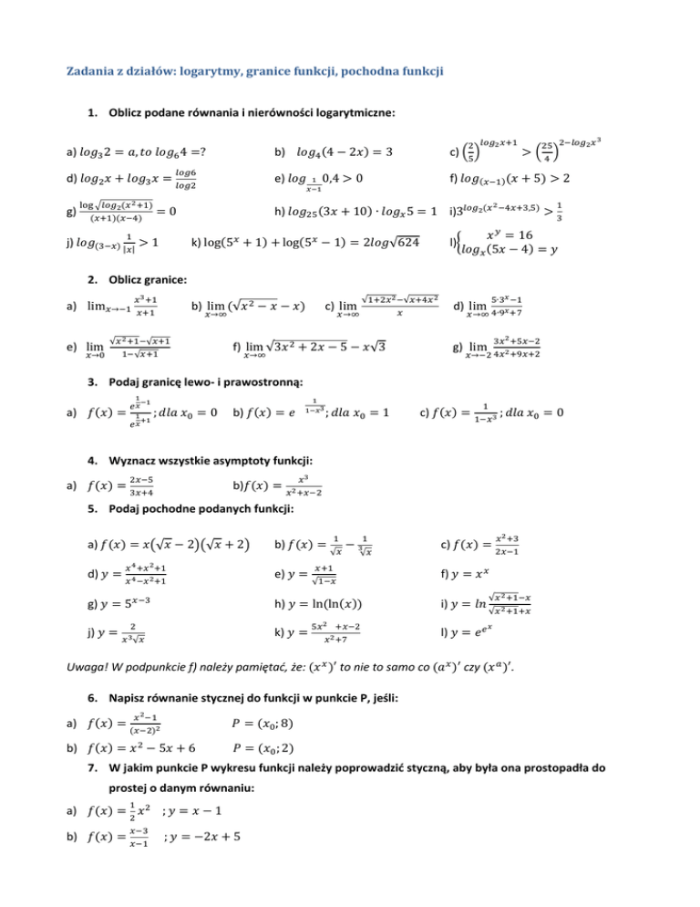 Zadania z działów: logarytmy, granice funkcji, pochodna funkcji