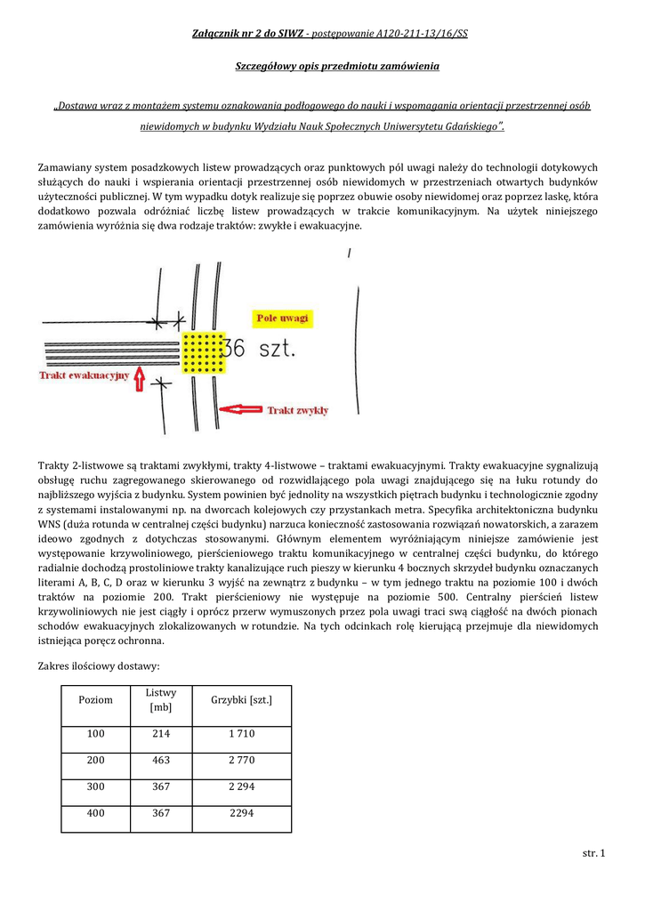 Załącznik nr 2 do SIWZ - postępowanie A120-211-13/16/SS Szczegółowy opis przedmiotu zamówienia „Dostawa wraz z montażem systemu oznakowania podłogowego do nauki i wspomagania orientacji przestrzennej osób niewidomych w budynku Wydziału Nauk Społecznych Uniwersytetu Gdańskiego ”. Zamawiany system posadzkowych listew prowadzących oraz punktowych pól uwagi należy do technologii dotykowych służących do nauki i wspierania orientacji przestrzennej osób niewidomych w przestrzeniach otwartych budynków użyteczności publicznej. W tym wypadku dotyk realizuje się poprzez obuwie osoby niewidomej oraz poprzez laskę, która dodatkowo pozwala odróżniać liczbę listew prowadzących w trakcie komunikacyjnym. Na użytek niniejszego zamówienia wyróżnia się dwa rodzaje traktów: zwykłe i ewakuacyjne. Trakty 2-listwowe są traktami zwykłymi, trakty 4-listwowe – traktami ewakuacyjnymi. Trakty ewakuacyjne sygnalizują obsługę ruchu zagregowanego skierowanego od rozwidlającego pola uwagi znajdującego się na łuku rotundy do najbliższego wyjścia z budynku. System powinien być jednolity na wszystkich piętrach budynku i technologicznie zgodny z systemami instalowanymi np. na dworcach kolejowych czy przystankach metra. Specyfika architektoniczna budynku WNS (duża rotunda w centralnej części budynku) narzuca konieczność zastosowania rozwiązań nowatorskich, a zarazem ideowo zgodnych z dotychczas stosowanymi. Głównym elementem wyróżniającym niniejsze zamówienie jest występowanie krzywoliniowego, pierścieniowego traktu komunikacyjnego w centralnej części budynku, do którego radialnie dochodzą prostoliniowe trakty kanalizujące ruch pieszy w kierunku 4 bocznych skrzydeł budynku oznaczanych literami A, B, C, D oraz w kierunku 3 wyjść na zewnątrz z budynku – w tym jednego traktu na poziomie 100 i dwóch traktów na poziomie 200. Trakt pierścieniowy nie występuje na poziomie 500. Centralny pierścień listew krzywoliniowych nie jest ciągły i oprócz przerw wymuszonych przez pola uwagi traci swą ciągłość na dwóch pionach schodów ewakuacyjnych zlokalizowanych w rotundzie. Na tych odcinkach rolę kierującą przejmuje dla niewidomych istniejąca poręcz ochronna. Zakres ilościowy dostawy: Poziom Listwy [mb] Grzybki [szt.] 100 214 1 710 200 463 2 770 300 367 2 294 400 367 2294 str. 1 Załącznik nr 2 do SIWZ - postępowanie A120-211-13/16/SS 500 29 434 Łącznie 1 440 mb 9 502 szt. Promienie okręgów wyznaczających łuki gięcia listew wynoszą odpowiednio: 11 740 mm (okrąg zewnętrzny) 11 440 mm (okrąg wewnętrzny). W przypadku ścieżki składającej się z czterech listew odległość osiowa między listwami wynosi 100 mm (odległość w osiach między skrajnymi listwami to 300 mm), w przypadku ścieżki składającej się z dwóch listew odległość osiowa między nimi to 300 mm. Pozostałe szczegóły podane są na rysunkach każdej kondygnacji (poziomu) oddzielnie. Wymagania technologiczne odnoszące się do montowanych elementów. Podłoże w budynku WNS UG. Pasy, lub szachownica granitowa dwubarwna. Grubość płyty granitowej 10 mm. Widok posadzki rotundy budynku WNS na poziomie 100. Materiał montowanego oznakowania. Stal nierdzewna gatunku 1.4305 (X5CrNi18-10 / A2 304L) lub gatunki wyższe. Norma referencyjna: PN-EN 100881:2007 Stale odporne na korozję – Część 1: Gatunki stali odpornych na korozję. str. 2 Załącznik nr 2 do SIWZ - postępowanie A120-211-13/16/SS Wymiary. Listwy: profil czołowy trójkątny z zaokrąglonym lub ściętym wierzchołkiem, szerokość listwy od 19 mm do 25 mm, wysokość profilu 3,9 - 5,5 mm, grubość blachy min. 1,5 mm. Maksymalna wysokość profilu ponad posadzką nie może przekraczać 5,5 mm. Grzybki okrągłe: stożek ścięty - wysokość „grzybka” wystająca ponad powierzchnię posadzki powinna mieścić się w granicach h= 4mm-6mm, średnica dolna: R=28 - 34 mm, średnica górna: r=17-21 mm, przekrój części wystającej nad posadzką: trapez z narożami skosowanymi lub zeszlifowanymi, styk tworzącej grzybka z górną podstawą powinien być zaokrąglony: promień zaokrąglenia w przedziale 1mm-3mm. Proporcje: h/(R-r) = 1 ± 10% (kąt tworzącej stożka z promieniem podstawy powinien wynosić 45° z tolerancją 10%). Trzpienie kotwiące: długość 10 mm-20 mm, średnica minimum 6 mm. Powierzchnia boczna trzpienia musi być profilowana – może być gwint. Technologia łączenia trzpieni kotwiących. Spawanie. Uwagi montażowe. 1. Przed wykonaniem spawania trzpieni do listew Wykonawca sporządzi szablony listew w skali 1:1 wraz z wyraźnymi zaznaczeniami miejsc projektowanych trzpieni i przedstawi je Zamawiającemu do zatwierdzenia. 2. Zamawiający wymaga, by trzpienie były kotwione w nawierceniach, których krawędź będzie odległa minimum 20 mm od najbliższej krawędzi płyty posadzkowej. 3. Montaż listew na styk. Grzybki muszą być montowane w węzłach siatki kwadratowej o boku 100 mm. 4. Odległości między sąsiadującymi trzpieniami w listwach powinny się mieścić w przedziale 150 mm - 200 mm (w osiach trzpieni) lub w odległościach uzgodnionych z przedstawicielem Zamawiającego, jeśli wymaga tego specyfika montażu w danym miejscu, 5. Skrajne trzpienie nie mogą być zlokalizowane dalej od najbliższego końca listwy niż 50 mm. 6. Czas wiązania żywicy służącej do wklejania trzpieni w temperaturze 11˚C - 20˚C powinien zawierać się w przedziale 30 min. – 90 min. Czas dopuszczenia do użytkowania nie może przekraczać 24h od chwili zakończenia etapu. Uwagi eksploatacyjne. 1. Brak przeciwwskazań do stosowania wszystkich powszechnie dostępnych środków czyszczących do czyszczenia zamontowanego oznakowania. 2. Brak przeciwwskazań do czyszczenia maszynowego powierzchni z zamontowanym oznakowaniem. str. 3