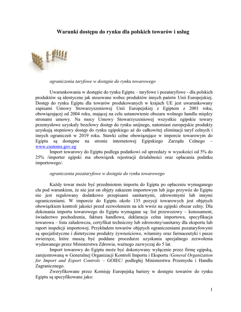 Warunki dostępu do rynku dla polskich towarów i usług ograniczenia taryfowe w dostępie do rynku towarowego Uwarunkowania w dostępie do rynku Egiptu – taryfowe i pozataryfowe - dla polskich produktów są identyczne jak stosowane wobec produktów innych państw Unii Europejskiej. Dostęp do rynku Egiptu dla towarów produkowanych w krajach UE jest uwarunkowany zapisami Umowy Stowarzyszeniowej Unii Europejskiej z Egiptem z 2001 roku, obowiązującej od 2004 roku, mającej na celu ustanowienie obszaru wolnego handlu między stronami umowy. Na mocy Umowy Stowarzyszeniowej wszystkie egipskie towary przemysłowe uzyskały bezcłowy dostęp do rynku unijnego, natomiast europejskie produkty uzyskują stopniowy dostęp do rynku egipskiego aż do całkowitej eliminacji taryf celnych i innych ograniczeń w 2019 roku. Stawki celne obowiązujące w imporcie towarowym do Egiptu są dostępne na stronie internetowej Egipskiego Zarządu Celnego – www.customs.gov.eg Import towarowy do Egiptu podlega podatkowi od sprzedaży w wysokości od 5% do 25% /importer egipski ma obowiązek rejestracji działalności oraz opłacania podatku importowego/. ograniczenia pozataryfowe w dostępie do rynku towarowego Każdy towar może być przedmiotem importu do Egiptu po opłaceniu wymaganego cła pod warunkiem, że nie jest on objęty zakazem importowym lub jego przywóz do Egiptu nie jest regulowany dodatkowo przepisami sanitarnymi, zdrowotnymi lub innymi ograniczeniami. W imporcie do Egiptu około 135 pozycji towarowych jest objętych obowiązkiem kontroli jakości przed zezwoleniem na ich wwóz na egipski obszar celny. Dla dokonania importu towarowego do Egiptu wymagane są: list przewozowy – konosament, świadectwo pochodzenia, faktura handlowa, deklaracja celna importowa, specyfikacja towarowa – lista załadowcza, certyfikat techniczny lub zdrowotny/sanitarny dla eksportu lub raport inspekcji importowej. Przykładem towarów objętych ograniczeniami pozataryfowymi są specjalistyczne i dietetyczne produkty żywnościowe, witaminy oraz farmaceutyki i pasze zwierzęce, które muszą być poddane procedurze uzyskania specjalnego zezwolenia wydawanego przez Ministerstwa Zdrowia, ważnego zazwyczaj do 5 lat. Import towarowy do Egiptu może być dokonywany wyłącznie przez firmę egipską, zarejestrowaną w Generalnej Organizacji Kontroli Importu i Eksportu /General Organization for Import and Export Controls – GOIEC/ podległej Ministerstwu Przemysłu i Handlu Zagranicznego. Zweryfikowane przez Komisję Europejską bariery w dostępie towarów do rynku Egiptu są specyfikowane jako: 1 - opłaty i ograniczenia w eksporcie – Egipt stosuje opłaty i ograniczenia eksportowe z uwagi na inflację oraz w celu ochrony interesów krajowych konsumentów /ryż, marmur, granit i rudy metali są przedmiotem opłat eksportowych/; - ograniczenia sanitarne w imporcie drobiu i produktów drobiarskich w związku z ptasią grypą A1 – Egipt stosuje w imporcie ograniczenia niezgodnie ze standardami i zaleceniami Światowej Organizacji Zdrowia Zwierząt /OIE/ poprzez wprowadzanie 3 miesięcznego zakazu importu z wszystkich państw członkowskich UE w przypadku zgłoszenia ogniska ptasiej grypy /A1/ bez przestrzegania zasady regionalizacji oraz bez różnicowania między wysoko /HPA1/ i nisko /LPA1/ patogenicznymi wirusami A1. Ponadto administracja Egiptu wymaga, aby dla posiadania certyfikatu rytualnego halal każdego roku dokonywana była inspekcja, co jest działaniem nieuzasadnionym i nadmiernym. - ograniczenia sanitarne w imporcie wołowiny, baraniny oraz zwierząt żywych i materiału genetycznego w związku z zakażeniami BSE, wirusem Schmallenberga i wymogami halal – Egipt zezwala na import mięsa wołowego pochodzącego wyłącznie ze sztuk nie starszych niż 30 miesięcy, co jest niezgodne ze standardem OIE. Podobnie ograniczenie Egipt stosuje w imporcie baraniny z uwagi na TSE /gąbczastą encefalopatię/. Egipt nie przedstawił jednoznacznie czytelnych reguł w zakresie procedury, ubojni i wyposażenia dla uboju rytualnego halal oraz nie akceptuje certyfikatów zgodności w tym zakresie wydanych przez władze religijne w krajach eksportujących. Egipt stosuje ograniczenia w imporcie żywego bydła i materiału genetycznego z uwagi na występowanie wirusa Schmallenberga. - wymóg metkowania produktów tekstylnych – dekret ministerialny nr 770/2005 nakłada na eksporterów odzieży i obuwia obowiązek opatrzenia każdej sztuki importowanej do Egiptu etykietką informującą w j. arabskim o rozmiarze produktu, marce handlowej, nazwie firmy eksportera i importera, składnikach produktu, kraju pochodzenia produktu, sposobie przechowywania. Ograniczenie to zwiększa koszty produktu oraz opóźnia dostawy produktów, a ręczne przyszywanie etykietek przed wejściem produktu na obszar celny Egiptu jest kosztowne i czasochłonne. Poza tym umieszczanie nazwy importera na etykietkach jest problematyczne w kontekście globalnych sieci zaopatrzenia funkcjonujących w branży tekstylnej. ograniczenia w pozostałych obszarach współpracy Egipt eliminuje świadczenie usług przez przedsiębiorców zagranicznych w zakresie usług morskich, w budownictwie, transporcie lotniczym. Import towarowy do Egiptu może odbywać się wyłącznie za pośrednictwem egipskich firm brokerskich stanowiących w 100% własność obywateli Egiptu. Udział firm zagranicznych w przetargach publicznych może odbywać się poprzez egipskich przedstawicieli, zaś egipska firma jest w przetargu preferowana jeśli jej oferta przewyższa nie więcej niż 15% wartość najniższej oferty zagranicznej. Z warunków równej konkurencji wyłączone są sektory telekomunikacji ziemnej, produkcji i dystrybucji energii elektrycznej, dystrybucji gazu, transportu kolejowego, usług pocztowych – w sektorach tych w Egipcie operują państwowe monopole. specjalne ułatwienia w dostępie do rynku W Egipcie utworzone zostały specjalne strefy ekonomiczne /SEZ