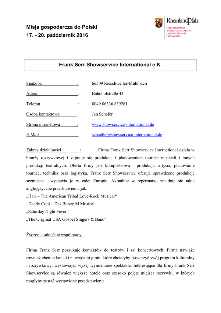 Misja gospodarcza do Polski 17. - 20. październik 2016 Frank Serr Showservice International e.K. Siedziba : 66509 Rieschweiler-Mühlbach Adres : Bahnhofstraße 43 Telefon : 0049 06336 839281 Osoba kontaktowa : Jan Schäfer Strona internetowa : www.showservice-international.de E-Mail : [email protected] Zakres działalności : Firma Frank Serr Showservice International działa w branży rozrywkowej i zajmuje się produkcją i planowaniem tournée musicali i innych produkcji teatralnych. Oferta firmy jest kompleksowa - produkcja, artyści, planowanie tournée, technika oraz logistyka. Frank Serr Showservice oferuje sprawdzone produkcje sceniczne i wystawia je w całej Europie. Aktualnie w repertuarze znajdują się takie anglojęzyczne przedstawienia jak: „Hair – The American Tribal Love-Rock Musical“ „Daddy Cool – Das Boney M Musical“ „Saturday Night Fever“ „The Original USA Gospel Singers & Band“ Życzenia odnośnie współpracy: Firma Frank Serr poszukuje kontaktów do teatrów i sal koncertowych. Firma nawiąże również chętnie kontakt z urzędami gmin, które chciałyby poszerzyć swój program kulturalny i rozrywkowy, wystawiając wyżej wymienione spektakle. Interesujące dla firmy Frank Serr Showservice są również większe hotele oraz szeroko pojęte miejsca rozrywki, w których mogłyby zostać wystawione przedstawienia.