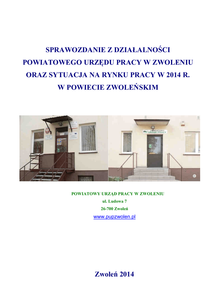 SPRAWOZDANIE Z DZIAŁALNOŚCI POWIATOWEGO URZĘDU PRACY W ZWOLENIU ORAZ SYTUACJA NA RYNKU PRACY W 2014 R. W POWIECIE ZWOLEŃSKIM POWIATOWY URZĄD PRACY W ZWOLENIU ul. Ludowa 7 26-700 Zwoleń www.pupzwolen.pl Zwoleń 2014 I. STAN I STRUKTURA OSÓB BEZROBOTNYCH I POSZUKUJĄCYCH PRACY Liczba bezrobotnych w powiecie zwoleńskim na dzień 31.12.2014r. wyniosła 3 185 osób, w tym 1 471 kobiet (46,2% ogółu bezrobotnych). Zasiłek dla bezrobotnych pobierało 349 osób (11,0%). Zdecydowana większość bezrobotnych to mieszkańcy wsi – 2 501 osób, tj. 78,5% ogółu. W okresie od 1 stycznia do 31 grudnia 2014 roku Powiatowy Urząd Pracy włączył do ewidencji 3 252 osoby i wyłączył z ewidencji 3 633 osoby. Większość (69,7%) ogółu włączonych do ewidencji to poprzednio pracujący – 2 219 osób. W stosunku do analogicznego okresu ubiegłego nastąpił spadek liczby bezrobotnych o 381 osób. Liczba poszukujących pracy na koniec 2014 roku wyniosła 47 osób, w tym 19 kobiet (40,4%). Stopa bezrobocia w miesiącach w 2014 roku na tle województwa i kraju przedstawia się następująco (w %): Stopa bezrobocia w latach 2010 – 2014 (stan na koniec grudnia) na tle województwa i kraju przedstawia się następująco: Lp. Lata 1. Stopa bezrobocia w % Powiat Województwo Kraj 2014 20.7 9,8 11,5 2. 2013 22,8 11,0 13,4 3. 2012 21,8 10,8 13,4 4. 2011 20,2 9,9 12,5 5. 2010 18,9 9,4 12,3 -2- Bezrobotni w poszczególnych miesiącach w 2014 roku Stan bezrobocia w poszczególnych gminach na dzień 31.12.2014 i 31.12.2013 Liczba bezrobotnych Lp. Gmina Ogółem Kobiety Bezrobotni z prawem do zasiłku Ogółem Kobiety 2014 2013 2014 2013 2014 2013 2014 2013 1 Gmina Zwoleń (bez miasta) 650 709 296 321 86 77 36 32 2 Miasto Zwoleń 671 761 331 363 72 109 38 46 3 Kazanów 416 453 176 190 33 43 8 13 4 Policzna 523 626 259 316 59 83 23 38 5 Przyłęk 469 486 210 199 60 61 19 14 6 Tczów 456 531 199 230 42 46 24 16 3 185 3 566 1 471 1 619 349 419 148 159 Ogółem -3- Stan bezrobocia w gminach na dzień: 31.12.2010, 31.12.2011, 31.12.2012, 31.12.2013 i 31.12.2014. Struktura bezrobotnych osób w szczególnej sytuacji na rynku pracy W ogólnej liczbie zarejestrowanych bezrobotnych na koniec 2014r. w szczególnej sytuacji na rynku pracy przeważają osoby długotrwale bezrobotne – 65,1% (2 075 osób). Osoby bez doświadczenia zawodowego stanowią 39,1% (1 246 osób) wszystkich bezrobotnych, osoby bez kwalifikacji zawodowych stanowią 37,6% (1 199 osób), osoby do 25 roku życia stanowią – 24,5% (779 osób). Osoby powyżej 50 roku życia – 19,5% (622 osoby), osoby samotnie wychowujące co najmniej jedno dziecko do 18 roku życia – 4,7% (150 osób), osoby niepełnosprawne – 2,3% (74 osoby) oraz osoby, które ukończyły szkołę wyższą do 27 roku życia – 1,6% (51 osób). Osoba bezrobotna może jednocześnie należeć do więcej niż jednej grupy bezrobotnych w szczególnej sytuacji na rynku pracy. -4- Struktura bezrobotnych wg wieku Najwięcej zarejestrowanych osób jest w wieku mobilnym zawodowo pomiędzy 18 a 44 rokiem życia, które stanowią 74,1 % (2 359 osób). Osoby w wieku 18 – 24 lata stanowią 24,4% (779 osób), w wieku 25 – 34 lata 30,4% (970 osób), w wieku 35 – 44 lata 19,2% (610 osób), w wieku 45 – 54 lata 14,5% (461 osób), w wieku 55 – 59 lat 8,2% (261 osób) wszystkich zarejestrowanych. Najmniejszą grupę stanowią osoby powyżej 60 roku życia – 3,3% (104 osoby). -5- Struktura bezrobotnych według wykształcenia W ogólnej liczbie bezrobotnych pozostających w ewidencji na koniec 2014r. przeważają osoby z wykształceniem gimnazjalnym i poniżej – 29,1% (927 osób) oraz z zasadniczym zawodowym – 27,9% (890 osób). Osoby z wykształceniem wyższym stanowią 10,7% (340 osób) wszystkich zarejestrowanych. Znaczny odsetek stanowią osoby z wykształceniem policealnym i średnim zawodowym – 20,2% (643 osoby). Z wykształceniem średnim ogólnym – 12,1% (385 osób). Lp. 1 2 3 4 5 Poziom wykształcenia Liczba bezrobotnych gimnazjalne i poniżej zasadnicze zawodowe policealne i średnie zawodowe średnie ogólne wyższe 927 890 643 385 340 Procent ogólnej liczby bezrobotnych 29,1% 27,9% 20,2% 12,1% 10,7% Ponad połowa ogółu bezrobotnych (57,0%) pozostających w rejestrze to osoby z wykształceniem poniżej średniego. -6- Struktura bezrobotnych wg stażu pracy Spośród bezrobotnych pozostających w ewidencji na koniec omawianego okresu osoby posiadające staż pracy do 1 roku stanowiły – 12,5% (398 osób), z 1 – 5 letnim stażem pracy – 25,2% (803 osoby), 5 – 10 letnim stażem – 12,7% (404 osoby), 10 – 20 letnim stażem pracy – 12,6% (400 osób), oraz 20 – 30 letni stażem – 5,0% (159 osób). Najmniejszą grupą bezrobotnych są osoby, które przepracowały ponad 30 lat tj. 1,4 % (43 osoby). Najliczniejszą grupę stanowiły osoby bez stażu pracy – 978 osób, tj. 30,7%. Większość bezrobotnych zarejestrowanych na koniec okresu sprawozdawczego to osoby, które poprzednio pracowały zawodowo – 69,3% (2 207 osób). -7- Struktura bezrobotnych wg czasu pozostawania bez pracy Najliczniejszą grupę bezrobotnych stanowią osoby, które pozostają bez pracy ponad 24 miesiące – 877 osób (27,5% ogółu). Również dużą grupę stanowią osoby pozostające bez pracy od 12 do 24 miesięcy – 617 osób (19,4%). Osób pozostających bez pracy od 6 do 12 miesięcy jest 440 (13,8%), od 3 do 6 miesięcy 418 (13,1%), od 1 do 3 miesięcy 572 (18,0%), do 1 miesiąca 261 (8,2%). Strukturę bezrobotnych wg czasu pozostawania bez pracy w miesiącach przedstawia poniższy wykres. Łącznie bez pracy ponad rok pozostaje prawie połowa (46,9%) zarejestrowanych bezrobotnych. -8- II. AKTYWIZACJA ZAWODOWA OSÓB NIEPEŁNOSPRAWNYCH Na koniec roku zarejestrowanych było 93 osoby niepełnosprawne (52 mężczyzn i 41 kobiet), w tym 74 osób bezrobotnych (43 mężczyzn i 31 kobiet) oraz 19 osób poszukujących pracy (9 mężczyzn i 10 kobiet) Większość to mies