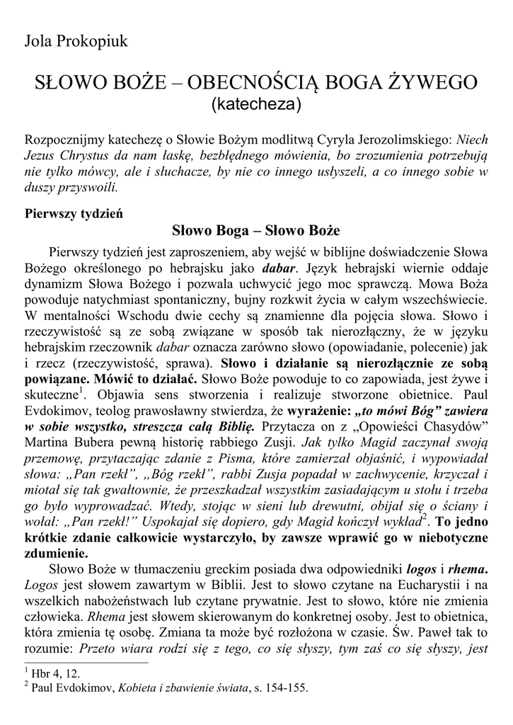 Jola Prokopiuk SŁOWO BOŻE – OBECNOŚCIĄ BOGA ŻYWEGO (katecheza) Rozpocznijmy katechezę o Słowie Bożym modlitwą Cyryla Jerozolimskiego: Niech Jezus Chrystus da nam łaskę, bezbłędnego mówienia, bo zrozumienia potrzebują nie tylko mówcy, ale i słuchacze, by nie co innego usłyszeli, a co innego sobie w duszy przyswoili. Pierwszy tydzień Słowo Boga – Słowo Boże Pierwszy tydzień jest zaproszeniem, aby wejść w biblijne doświadczenie Słowa Bożego określonego po hebrajsku jako dabar. Język hebrajski wiernie oddaje dynamizm Słowa Bożego i pozwala uchwycić jego moc sprawczą. Mowa Boża powoduje natychmiast spontaniczny, bujny rozkwit życia w całym wszechświecie. W mentalności Wschodu dwie cechy są znamienne dla pojęcia słowa. Słowo i rzeczywistość są ze sobą związane w sposób tak nierozłączny, że w języku hebrajskim rzeczownik dabar oznacza zarówno słowo (opowiadanie, polecenie) jak i rzecz (rzeczywistość, sprawa). Słowo i działanie są nierozłącznie ze sobą powiązane. Mówić to działać. Słowo Boże powoduje to co zapowiada, jest żywe i skuteczne1. Objawia sens stworzenia i realizuje stworzone obietnice. Paul Evdokimov, teolog prawosławny stwierdza, że wyrażenie: „to mówi Bóg” zawiera w sobie wszystko, streszcza całą Biblię. Przytacza on z „Opowieści Chasydów” Martina Bubera pewną historię rabbiego Zusji. Jak tylko Magid zaczynał swoją przemowę, przytaczając zdanie z Pisma, które zamierzał objaśnić, i wypowiadał słowa: „Pan rzekł”, „Bóg rzekł”, rabbi Zusja popadał w zachwycenie, krzyczał i miotał się tak gwałtownie, że przeszkadzał wszystkim zasiadającym u stołu i trzeba go było wyprowadzać. Wtedy, stojąc w sieni lub drewutni, obijał się o ściany i wołał: „Pan rzekł!” Uspokajał się dopiero, gdy Magid kończył wykład 2. To jedno krótkie zdanie całkowicie wystarczyło, by zawsze wprawić go w niebotyczne zdumienie. Słowo Boże w tłumaczeniu greckim posiada dwa odpowiedniki logos i rhema. Logos jest słowem zawartym w Biblii. Jest to słowo czytane na Eucharystii i na wszelkich nabożeństwach lub czytane prywatnie. Jest to słowo, które nie zmienia człowieka. Rhema jest słowem skierowanym do konkretnej osoby. Jest to obietnica, która zmienia tę osobę. Zmiana ta może być rozłożona w czasie. Św. Paweł tak to rozumie: Przeto wiara rodzi się z tego, co się słyszy, tym zaś co się słyszy, jest 1 2 Hbr 4, 12. Paul Evdokimov, Kobieta i zbawienie świata, s. 154-155. Przystanek Słowo Boże Katecheza słowo (rhema) Chrystusa. Rhema jest słowem, które tworzy się podczas słuchania słowa logos3. Aby słowo rhema dotarło do człowieka, potrzebny jest Duch Święty i człowiek z postawą nawrócenia. Drugi tydzień Słuchanie Słowa Bożego Zadaniem człowieka jest karmienie się Słowem Bożym logos. Dawni mnisi rozwinęli metodę, dzięki której mogli żyć całkowicie zanurzeni w Słowie Bożym. Była to metoda medytacji nazywana ruminatio. Ruminari znaczy przeżuwać. Mnisi czytali Słowo Boże i ciągle je przeżuwali. Powtarzali je w swoim sercu, zastanawiali się nad nim, przypatrywali się mu ciągle na nowo. Nad pojedynczym zdaniem z Biblii mogli rozmyślać cały dzień. Takie karmienie się Słowem zmieniało ich. Anselm Grün przytacza przypowieść, w której porównywane jest nasze obcowanie ze słowem z zachowaniem się konia i wielbłąda. Wielbłąd zadowala się niewielką ilością pożywienia, które ciągle przeżuwa. Natomiast koń potrzebuje wiele pożreć. Nigdy nie jest syty. Ojciec Kościoła, Antoniusz przypomina nam, żebyśmy nie obchodzili się ze słowem Bożym jak konie, ale jak wielbłądy. Nie powinniśmy nienasycenie objadać się ciągle czymś nowym, ale zachowywać w swoim sercu tę odrobinę, którą usłyszeliśmy i przeczytaliśmy. Wtedy słowo może nas zmienić4. Podstawowym i zarazem pierwszym przykazaniem Izraelity było słuchaj Izraelu5. Człowiek stworzony na podobieństwo Boże, to osoba powołana do relacji z drugą osobą, do dialogu. Pierwszym założeniem dialogu jest to, iż odpowiedzieć wymaga najpierw słuchania. Osoba stworzona na podobieństwo Boże to byt w relacji do innej osoby, byt stworzony do dialogu. W praktyce okazuje się to nie takie proste, nie tylko w stosunku do człowieka, ale także do Boga. Słuchanie wymaga nie tylko słuchu, ale i nauki. A nauka wymaga czasu. 3 Rz 10, 17. Anselm Grün, 50 aniołów na cały rok, s. 22-23. 5 Pwt 6, 4. 4 2 Przystanek Słowo Boże Katecheza Mistrzem życia wewnętrznego dla chrześcijanina jest Duch Święty. To On właśnie prowadzi naukę słuchania i sam uzdalnia do słuchania, odpowiedzi i wypełnienia tego co się usłyszało. Księga Powtórzonego Prawa ukazuje kierunek słuchania: Słuchaj, Izraelu, Pan jest naszym Bogiem – Panem jedynym6. Ukazuje kto ma być pierwszy w naszej hierarchii wartości – Bóg w Jezusie Chrystusie. List do Rzymian ukazuje drogę wiary: wiara rodzi się ze słuchania słowa (rhema) Chrystusa 7. Słuchanie jest czymś więcej niż tylko czytaniem Słowa Bożego. Słuchanie zakłada rozumienie. Bez rozumienia nie ma możliwości odpowiadania. Biblia ukazuje, że słuchanie bez zrozumienia prowadzi do zatwardziałości serca 8. Ewangelista Mateusz ukazuje w jaki sposób dokonuje się ten proces. Do każdego, kto słucha słowa o królestwie, a nie rozumie go, przychodzi Zły i porywa to, co zasiane jest w jego sercu9. Słowo, które zostaje na poziomie informacji, wiedzy, nie uzdrawia serca człowieka. Rozumienie Słowa Bożego i aktualizowanie go w życiu konkretnego człowieka daje Duch Święty. Duch Święty opuszcza człowieka, w którym nie ma postawy nawrócenia. Jan Paweł II postawę z radykalną odmową nawrócenia się określa grzechem przeciwko Duchowi Świętemu10. Postawa nawrócenia zakłada najpierw modlitwę o nawrócenie oraz rodzące się pragnienie nawrócenia. Nawrócenie w pierwszym rzęd