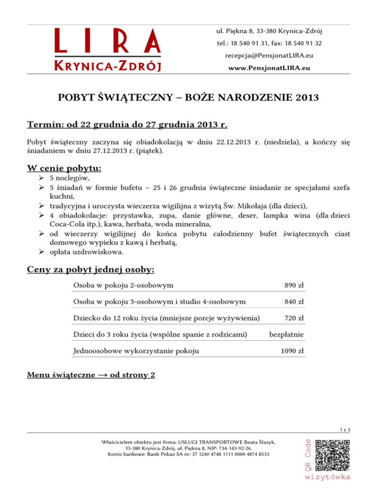ul. Piękna 8, 33-380 Krynica-Zdrój tel.: 18 540 91 31, fax: 18 540 91 32 [email protected] www.PensjonatLIRA.eu POBYT ŚWIĄTECZNY – BOŻE NARODZENIE 2013 Termin: od 22 grudnia do 27 grudnia 2013 r. Pobyt świąteczny zaczyna się obiadokolacją w dniu 22.12.2013 r. (niedziela), a kończy się śniadaniem w dniu 27.12.2013 r. (piątek). W cenie pobytu: ➢ 5 noclegów, ➢ 5 śniadań w formie bufetu – 25 i 26 grudnia świąteczne śniadanie ze specjałami szefa kuchni, ➢ tradycyjna i uroczysta wieczerza wigilijna z wizytą Św. Mikołaja (dla dzieci), ➢ 4 obiadokolacje: przystawka, zupa, danie główne, deser, lampka wina (dla dzieci Coca-Cola itp.), kawa, herbata, woda mineralna, ➢ od wieczerzy wigilijnej do końca pobytu całodzienny bufet świątecznych ciast domowego wypieku z kawą i herbatą, ➢ opłata uzdrowiskowa. Ceny za pobyt jednej osoby: Osoba w pokoju 2-osobowym 890 zł Osoba w pokoju 3-osobowym i studio 4-osobowym 840 zł Dziecko do 12 roku życia (mniejsze porcje wyżywienia) 720 zł Dzieci do 3 roku życia (wspólne spanie z rodzicami) bezpłatnie Jednoosobowe wykorzystanie pokoju 1090 zł Menu świąteczne → od strony 2 1z3 Właścicielem obiektu jest firma: USŁUGI TRANSPORTOWE Beata Ślazyk, 33-380 Krynica-Zdrój, ul. Piękna 8, NIP: 734-143-92-26. Konto bankowe: Bank Pekao SA nr: 37 1240 4748 1111 0000 4874 8533 ul. Piękna 8, 33-380 Krynica-Zdrój tel.: 18 540 91 31, fax: 18 540 91 32 [email protected] www.PensjonatLIRA.eu MENU ŚWIĄTECZNE 24 grudnia WIECZERZA WIGILIJNA Barszcz czerwony z uszkami grzybowymi Żurek staropolski na zakwasie żytnim z ziemniakiem i grzybkiem Pierogi z kapustą Pierogi ze suszonymi śliwkami Kapusta z grochem Ryba smażony sauté na warzywach julienne w sosie chrzanowym ze ziemniakami gotowanymi Smażony karp z surówką z kiszonej kapusty Groch jasiek z masełkiem Karp w galarecie Kasza ze śliwkami suszonymi Zupa migdałowa Wigilijny kompot ze suszonych owoców Bufet świątecznych ciast domowego wypieku Lampka białego wina Sok Woda mineralna Herbata Kawa 2z3 Właścicielem obiektu jest firma: USŁUGI TRANSPORTOWE Beata Ślazyk, 33-380 Krynica-Zdrój, ul. Piękna 8, NIP: 734-143-92-26. Konto bankowe: Bank Pekao SA nr: 37 1240 4748 1111 0000 4874 8533 ul. Piękna 8, 33-380 Krynica-Zdrój tel.: 18 540 91 31, fax: 18 540 91 32 [email protected] www.PensjonatLIRA.eu 25 grudnia 26 grudnia ŚNIADANIE ŚNIADANIE Specjalności Szefa Kuchni Rolada z karkówki z papryką Boczek zawijany z rozmarynem Kurczak faszerowany mięsem z grzybami Specjalności Szefa Kuchni Roladki z ciasta ziemniaczanego z mięsem i grzybami Łosoś wędzony w auszpiku, nadziewany serem borówkowym Pieczeń wieprzowa z pistacjami Szynka pieczona w miodzie OBIADOKOLACJA Przystawka Kwiat z łososia na pieczonym jabłku z bazylią i sosem paprykowym, okryty ciastem tymiankowym Zupa Rosół królewski z warzywami i kuleczkami mięsnymi Danie główne Polędwiczki wieprzowe flambirowane brandy, podane z pierożkami francuskimi i brokułami, oblane sosem borowikowym Deser Włoskie Tiramisu z serka Mascarpone Napoje Lampka wytrawnego czerwonego wina Soki owocowe Woda mineralna Herbata Kawa OBIADOKOLACJA Przystawka Rolada szpinakowa nadziewana serem orzechowym z kurczakiem, podana z borówkowym sosem vinaigrette Zupa Gulaszowa Danie główne – bufet Jagnięcina pieczona w ziołach Ziemniaki faszerowane Gołąbki ziemniaczane Kapusta Zasmażana Sałatka wiosenna Sałatka szwedzka Deser Ciasto orzechowo-śliwkowe Napoje Lampka wytrawnego czerwonego wina Soki owocowe Woda mineralna Herbata Kawa 3z3 Właścicielem obiektu jest firma: USŁUGI TRANSPORTOWE Beata Ślazyk, 33-380 Krynica-Zdrój, ul. Piękna 8, NIP: 734-143-92-26. Konto bankowe: Bank Pekao SA nr: 37 1240 4748 1111 0000 4874 8533
