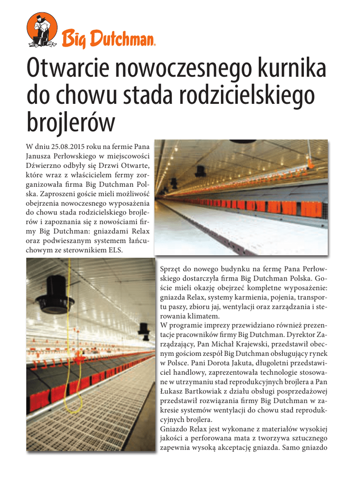 Otwarcie nowoczesnego kurnika do chowu stada rodzicielskiego brojlerów W dniu 25.08.2015 roku na fermie Pana Janusza Perłowskiego w miejscowości Dźwierzno odbyły się Drzwi Otwarte, które wraz z właścicielem fermy zorganizowała firma Big Dutchman Polska. Zaproszeni goście mieli możliwość obejrzenia nowoczesnego wyposażenia do chowu stada rodzicielskiego brojlerów i zapoznania się z nowościami firmy Big Dutchman: gniazdami Relax oraz podwieszanym systemem łańcuchowym ze sterownikiem ELS. Sprzęt do nowego budynku na fermę Pana Perłowskiego dostarczyła firma Big Dutchman Polska. Goście mieli okazję obejrzeć kompletne wyposażenie: gniazda Relax, systemy karmienia, pojenia, transportu paszy, zbioru jaj, wentylacji oraz zarządzania i sterowania klimatem. W programie imprezy przewidziano również prezentacje pracowników firmy Big Dutchman. Dyrektor Zarządzający, Pan Michał Krajewski, przedstawił obecnym gościom zespół Big Dutchman obsługujący rynek w Polsce. Pani Dorota Jakuta, długoletni przedstawiciel handlowy, zaprezentowała technologie stosowane w utrzymaniu stad reprodukcyjnych brojlera a Pan Łukasz Bartkowiak z działu obsługi posprzedażowej przedstawił rozwiązania firmy Big Dutchman w zakresie systemów wentylacji do chowu stad reprodukcyjnych brojlera. Gniazdo Relax jest wykonane z materiałów wysokiej jakości a perforowana mata z tworzywa sztucznego zapewnia wysoką akceptację gniazda. Samo gniazdo nie posiada drewnianych elementów a jego słupki zrobione z tworzywa sztucznego, pozwalają utrzymać optymalna higienę i ułatwiają czyszczenie. Głębokość gniazda 47 cm zapewnia krótką drogę toczenia jaj. Dostają się one bezpośrednio na taśmę do zbioru jaj o szerokości 400 lub 500 mm. Nowością jest dwuczęściowy dach gniazda, który znacznie ułatwia kontrolę gniazda oraz taśmy zbioru jaj. Całość dopełnia szybki i łatwy montaż ponieważ gniazdo bazuje na systemie złączek i można je składać prawie bez użycia śrub. Wyposażenie uzupełniły systemy karmienia z karmidłami dla kogutów MalePan, system zadawania paszy Flex-Vey, wagi tarczowo-dźwigowe dla kogutów oraz silosy. Zamontowana wentylacja w kurniku opiera się na wlotach CL-1220, wentylatorach z tubą, kominach wentylacyjnych CL-600 oraz nagrzewnicach. Całością steruje komputer Viper Touch. Po części oficjalnej przyszedł czas na smaczny poczęstunek. W jego trakcie goście mieli możliwość dopytać przedstawicieli firmy o szczegóły związane z wyposażeniem i jego odpowiednim doborem w stosunku do obsady kurnika. Serdecznie dziękujemy właścicielowi fermy Panu Januszowi Perłowskiemu za możliwość zorganizowania Drzwi Otwartych, jednocześnie życzymy pomyślności i sukcesów w prowadzeniu dalszej działalności.