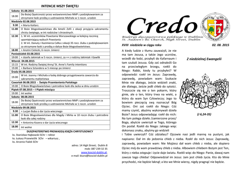 INTENCJE MSZY ŚWIĘTEJ Sobota 01.08.2015 3 Do Bożej Opatrzności przez wstawiennictwo NMP z podziękowaniem za 18.00 otrzymane łaski prośbą o uzdrowienie Michała w 1 roczn. urodzin Niedziela 02.08.2015 9.30 + Maria Kotlarz. 11.00 O Boże błogosławieństwo dla Amelii Zofii z okazji przyjęcia sakramentu chrztu świętego, w int rodziców i chrzestnych. 12.30 1. W int. uczestników Powstania Warszawskiego w kolejną rocznicę upamiętniającą wybuch Powstania 2. W int. Danuty i Kazimierza Całka z okazji 35 rocz. ślubu z podziękowaniem za otrzymane łaski z prośbą o dalsze Boże błogosławieństwo. 18.00 + Anotni Cielecki, 6 roczn. śmierci Poniedziałek 03.08.2015 19:00 + Józefa Jakimiak w 5 roczn. śmierci, za ++ z rodziny Jakimiak i Gawlik Wtorek 04.08.2015 13.15 W int. Rodziny Świętej Anny/ St. Anne’s Family intentions 19.00 + Barbara Sztandera w 5 miesiąc po śmierci Środa 05.08.2015 W int. Joanny i Michała o łaskę dobrego przygotowania zawarcia do 19.00 sakramentu małżeństwa Czwartek 06.08.2015 - Święto Przemienienia Pańskiego 19.00 O Boże Błogosławieństwo i potrzebne łaski dla Jacka w dniu urodzin Piątek 07.08.2015 – I Piątek miesiąca 19.00 Int wolna Sobota 08.08.2015 Do Bożej Opatrzności przez wstawiennictwo NMP z podziękowaniem za 18.00 otrzymane łaski prośbą o uzdrowienie Michała w 1 roczn. urodzin Niedziela 09.08.2015 9.30 + Lucjan Buba o dar życia wiecznego 11.00 O Boże Błogosławieństwo dla Magdy i Mirka w 10 roczn ślubu i potrzebne łaski dla całej rodziny 12.30 + Antonina Kozera o dar życia wiecznego 18.00 Int wolna DUSZPASTERSTWO PROWADZĄ KSIĘŻA CHRYSTUSOWCY ks. Stanisław Hajkowski SChr – rektor ks. Łukasz Przewieślik SChr – wikariusz , ks. Arcenio Fialek SChr adres: 14 High Street; Dublin 8 mob: 087 239 32 35 www.kosciol-dublin.pl, e-mail: [email protected] XVIII niedziela w ciągu roku 02. 08. 2015 A kiedy ludzie z tłumu zauważyli, że nie ma tam Jezusa, a także Jego uczniów, wsiedli do łodzi, przybyli do Kafarnaum i Z niedzielnej Ewangelii tam szukali Jezusa. Gdy zaś odnaleźli Go na przeciwległym brzegu, rzekli do Niego: Rabbi, kiedy tu przybyłeś? W odpowiedzi rzekł im Jezus: Zaprawdę, zaprawdę, powiadam wam: Szukacie Mnie nie dlatego, żeście widzieli znaki, ale dlatego, żeście jedli chleb do sytości. Troszczcie się nie o ten pokarm, który ginie, ale o ten, który trwa na wieki, a który da wam Syn Człowieczy; Jego to bowiem pieczęcią swą naznaczył Bóg Ojciec. Oni zaś rzekli do Niego: Cóż mamy czynić, abyśmy wykonywali dzieła (J 6,24-35) Boże? Jezus odpowiadając rzekł do nich: Na tym polega dzieło /zamierzone przez/ Boga, abyście uwierzyli w Tego, którego On posłał. Rzekli do Niego: Jakiego więc dokonasz znaku, abyśmy go widzieli i Tobie uwierzyli? Cóż zdziałasz? Ojcowie nasi jedli mannę na pustyni, jak napisano: Dał im do jedzenia chleb z nieba. Rzekł do nich Jezus: Zaprawdę, zaprawdę, powiadam wam: Nie Mojżesz dał wam chleb z nieba, ale dopiero Ojciec mój da wam prawdziwy chleb z nieba. Albowiem chlebem Bożym jest Ten, który z nieba zstępuje i życie daje światu. Rzekli więc do Niego: Panie, dawaj nam zawsze tego chleba! Odpowiedział im Jezus: Jam jest chleb życia. Kto do Mnie przychodzi, nie będzie łaknął; a kto we Mnie wierzy, nigdy pragnąć nie będzie. KRÓTKI KOMENTARZ DO EWANGELII „Panie, dawaj nam zawsze tego chleba” – proszą ci, którzy przekonali się na własne oczy, że Jezus naprawdę ma moc ich nakarmić i uleczyć. Dlatego wytrwale Go szukają i domagają się od Niego zaspokojenia wszystkich swoich potrzeb. My też podczas Eucharystii możemy z wiarą prosić Jezusa o to, czego nam potrzeba. Największą radość sprawimy Mu jednak wtedy, gdy zechcemy szukać także tego Chleba, którym jest On sam. Mira Majdan, „Oremus” PRZYGOTOWANIA DO SAKRAMENTÓW W DUSZPASTERSTWIE POLSKIM Przygotowania do przyjęcia sakramentu I komunii świętej oraz sakramentu bierzmowania rozpoczną się w połowie września. Wszelkich potrzebnych informacji dotyczących przygotowania do sakramentu bierzmowania udziela ks. Stanisław, który prowadzi te przygotowania. Zaś pytania dotyczące przygotowania do I komunii świętej prosimy kierować do ks. Łukasza. SPRZĄTANIE KOŚCIOŁA Prosimy o pomoc w sprzątaniu naszego kościoła w sobotę 08 sierpnia w sobotę. Zaczynamy o godz. 10.00. Każda para rąk jest potrzebna. KOLEKTA POPRZEDNIEJ ŚWIATOWE DNI NIEDZIELI MŁODZIEŻY I Kolekta 575 € II Kolekta KRAKÓW 2016 Koperty jednorazowe 290 € 130 € Koperty rejestrowane 80 € Bóg zapłać za składane ofiary Bóg zapłać za ofiary składane w kopertach, która są przeznaczone na bezpośrednie utrzymanie naszego kościoła. Są dwa rodzaje kopert – jednorazowe i rejestrowane. W zestawy kopert rejestrowanych można zaopatrzyć się w biurze duszpasterstwa. Zarejestrowana Ofiara większa niż 250 euro w ciągu roku od jednej osoby pozwoli nam ubiegać się o dodatkowe 20% od Revenue. 6 SIERPNIA ŚWIĘTO PRZEMIENIENIA PAŃSKIEGO Święto przemienienia Pańskiego przypomina, że Jezus może w każdej chwili odmienić nasz los. Ma ono jeszcze jeden, radosny, eschatologiczny aspekt: przyjdzie czas, że Pan odmieni nas wszystkich; nawet nasze ciała w tajemnicy zmartwychwstania uczyni uczestnikami swojej chwały. Dlatego ten obchód jest dniem wielkiej radości i nadziei, że nasze przebywanie na ziemi nie będzie ostateczne, że przyjdzie po nim nieprzemijająca chwała. Przemienienie to jednak nie tylko pamiątka dokonanego faktu. To nie tylko nadzieja także naszego zmartwychwstania i przemiany. To równocześnie nakaz zostawiony przez Chrystusa, to zadanie wytyczone Jego wyznawcom. Warunkiem naszego eschatologicznego przemienienia jest stała przemiana duchowa, wewnętrzne, uparte naśladowanie Chrystusa. Ta przemiana w zarodku musi mieć podstawę na ziemi, by do swej pełni mogła dojść w wieczności. W drodze ku wieczności uczeń J