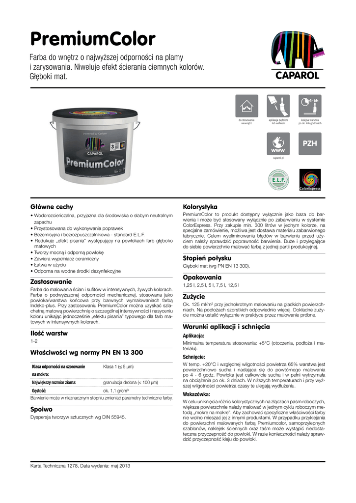 lekarskie, urzędy oraz pomieszczenia miesz lekar Właściwości PremiumColor Spoiwo Wielkość opakowań Farba do wnętrz o najwyższej odporności na plamy i zarysowania. Niweluje efekt ścierania ciemnych kolorów. Głęboki mat. Barwa ■ ■ ■ ■ ■ ■ ■ ■ Wodorozcieńczalna, przyjazna dla środow ■W Właściwości Nie zawiera składników powodujących „f ■ Ni Umożliwia wykonywanie poprawek ■ Um O podwójnej sile krycia ■O Wysoki stopień bieli ■W Lekko wypełniająca, nie żółknie ■ Le Optymalna w użyciu ■ Op Dyfuzyjna, wartość sd < 0,1 m ■ Dy Dyspersja tworzyw sztucznych wg DIN Dysp 55 94 Spoiwo ■ Standardowe: Wielkość opakowań 2,5 l, 5 l, 10 l ■ St 2, Biała. Biała Barwa Można barwić przy użyciu barwników AVA Możn Całość samodzielnie zabarwionego materiał Całoś uniknięcia możliwych różnic kolorystycznych unikn specjalne zamówienie, możliwa jest dostawa specj Farbę Indeko-plus można barwić w maszyno Farbę kolory. Aby uniknąć ewentualnych błędów ba kolor koloru. Na stykających się powierzchniach koloru stosowania slabo kryjących kolorów tj. czerw stoso gruntującej farba Indeko-plus lub Caparol-Ha grunt się także potrzeba naniesienia dodatkowej w się ta Stopień połysku Składowanie Głęboko matowy (wg PN EN 13 300) Głęb Stopień połysku Przechowywać w chłodnym miejscu w temp. Składowanie Przec normy PN EN 13 300: Włas do stosowania Dane Techniczne aplikacja pędzlem Własności kolejnawg warstwa Dane Techniczne wewnątrz lub wałkiem po ok. 4-6 godzinach W zależności od koloru w nieznacznymW stop za www PZH caparol.pl Główne cechy Kolorystyka • Wodorozcieńczalna, przyjazna dla środowiska o słabym neutralnym zapachu • Przystosowana do wykonywania poprawek • Bezemisyjna i bezrozpuszczalnikowa - standard E.L.F. • Redukuje „efekt pisania” występujący na powłokach farb głęboko matowych • Tworzy mocną i odporną powłokę • Zawiera wypełniacz ceramiczny • Łatwa w użyciu • Odporna na wodne środki dezynfekcyjne PremiumColor to produkt dostępny wyłącznie jako baza do barwienia i może być stosowany wyłącznie po zabarwieniu w systemie ColorExpress. Przy zakupie min. 300 litrów w jednym kolorze, na specjalne zamówienie, możliwa jest dostawa materiału zabarwionego fabrycznie. Celem wyeliminowania błędów w barwieniu przed użyciem należy sprawdzić poprawność barwienia. Duże i przylegające do siebie powierzchnie malować farbą z jednej partii produkcyjnej. Zastosowanie Farba do malowania ścian i sufitów w intensywnych, żywych kolorach. Farba o podwyższonej odporności mechanicznej, stosowana jako powłoka/warstwa końcowa przy barwnych wymalowaniach farbą Indeko-plus. Przy zastosowaniu PremiumColor można uzyskać szlachetną matową powierzchnię o szczególnej intensywności i nasyceniu koloru unikając jednocześnie „efektu pisania” typowego dla farb matowych w intensywnych kolorach. IloÊç warstw Głęboki mat (wg PN EN 13 300). Opakowania 1,25 l, 2,5 l, 5 l, 7,5 l, 12,5 l Zu˝ycie Ok. 125 ml/m² przy jednokrotnym malowaniu na gładkich powierzchniach. Na podłożach szorstkich odpowiednio więcej. Dokładne zużycie można ustalić wyłącznie w praktyce przez malowanie próbne. Warunki aplikacji i schni´cia Aplikacja: 1-2 WłaÊciwoÊci wg normy PN EN 13 300 Klasa odporności na szorowanie Stopieƒ połysku Klasa 1 (≤ 5 μm) na mokro: Największy rozmiar ziarna: granulacja drobna (< 100 μm) Gęstość: ok. 1,1 g/cm³ Barwienie może w nieznacznym stopniu zmieniać parametry techniczne farby. Spoiwo Dyspersja tworzyw sztucznych wg DIN 55945. Karta Techniczna 1278, Data wydania: maj 2013 Minimalna temperatura stosowania: +5°C (otoczenia, podłoża i materiału). Schnięcie: W temp. +20°C i względnej wilgotności powietrza 65% warstwa jest powierzchniowo sucha i nadająca się do powtórnego malowania po 4 - 6 godz. Powłoka jest całkowicie sucha i w pełni wytrzymała na obciążenia po ok. 3 dniach. W niższych temperaturach i przy wyższej wilgotności powietrza czasy te ulegają wydłużeniu. Wskazówka: W celu uniknięcia różnic kolorystycznych na złączach pasm roboczych, większe powierzchnie należy malować w jednym cyklu roboczym metodą „mokre na mokre”. Aby zachować specyficzne właściwości farby nie wolno mieszać jej z innymi produktami. W przypadku przyklejania do powierzchni malowanych farbą Premiumcolor, samoprzylepnych szablonów, naklejek ściennych oraz taśm może wystąpić niedostateczna przyczepność do powłoki. W razie konieczności należy sprawdzić przyczepność kleju do powłoki. Sposób aplikacji Czyszczenie narz´dzi Malować pędzlem lub wałkiem. Narzędzia po użyciu myć wodą. STOSOWANIE Ogólne wymagania dotyczàce podło˝a Układ warstw Podłoże musi być nośne, suche, czyste oraz pozbawione substancji zmniejszających przyczepność. Kryjącą warstwę pośrednią wykonać farbą Indeko-plus zabarwiona na kolor identyczny jak kolor powłoki końcowej wykonanej farbą PremiumColor (przestrzegać zaleceń podanych w karcie techniczno-informacyjnej farby Indeko-plus). Warstwę końcową wykonać 1 – 2 x nie rozcieńczoną farbą PremiumColor. Przy stosowaniu farby na bardzo dużych powierzchniach w razie konieczności można rozcieńczyć dodając maks. 3% wody. Przygotowanie podło˝a Sposób przygotowania podłoża jest zależny od jego rodzaju i właściwości. Należy przestrzegać wytycznych zawartych w karcie technicznej farby Indeko-plus. Zalecenia odnośnie czyszczenia: Do okresowego czyszczenia nadają się domowe wodne niebarwione środki czystości w połączeniu z czystymi ściereczkami z mikrofazy. Przed pierwszym czyszczeniem należy przetestować na mało widocznej powierzchni oddziaływanie środka czyszczącego na powłokę farby. Stosować się do odpowiedniego dozowania środka czystości i nie stosować środków szorujących. W przypadku barwnych powłok, w zal