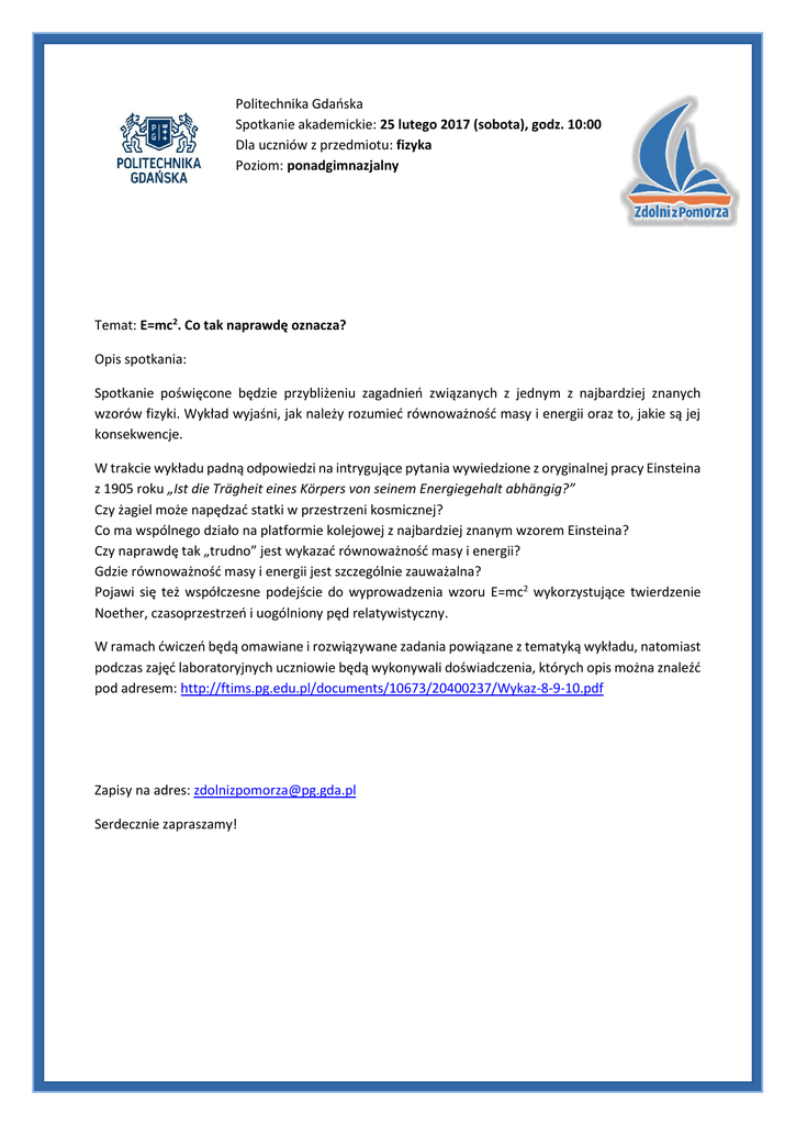 Politechnika Gdańska Spotkanie akademickie: 25 lutego 2017 (sobota), godz. 10:00 Dla uczniów z przedmiotu: fizyka Poziom: ponadgimnazjalny Temat: E=mc2. Co tak naprawdę oznacza? Opis spotkania: Spotkanie poświęcone będzie przybliżeniu zagadnień związanych z jednym z najbardziej znanych wzorów fizyki. Wykład wyjaśni, jak należy rozumieć równoważność masy i energii oraz to, jakie są jej konsekwencje. W trakcie wykładu padną odpowiedzi na intrygujące pytania wywiedzione z oryginalnej pracy Einsteina z 1905 roku „Ist die Trägheit eines Körpers von seinem Energiegehalt abhängig?” Czy żagiel może napędzać statki w przestrzeni kosmicznej? Co ma wspólnego działo na platformie kolejowej z najbardziej znanym wzorem Einsteina? Czy naprawdę tak „trudno” jest wykazać równoważność masy i energii? Gdzie równoważność masy i energii jest szczególnie zauważalna? Pojawi się też współczesne podejście do wyprowadzenia wzoru E=mc2 wykorzystujące twierdzenie Noether, czasoprzestrzeń i uogólniony pęd relatywistyczny. W ramach ćwiczeń będą omawiane i rozwiązywane zadania powiązane z tematyką wykładu, natomiast podczas zajęć laboratoryjnych uczniowie będą wykonywali doświadczenia, których opis można znaleźć pod adresem: http://ftims.pg.edu.pl/documents/10673/20400237/Wykaz-8-9-10.pdf Zapisy na adres: [email protected] Serdecznie zapraszamy! HARMONOGRAM SPOTKANIA Szkoła Ponadgimnazjalna Godzina Rodzaj zajęć Sala 10:00 – 10:15 Rejestracja uczniów (hol przed Dziedzińcem Heweliusza w Gmachu Głównym PG) 10:15 – 11:45 Laboratorium fizyczne prowadzący: Beata Bochentyn Paweł Gdaniec Kamil Kolincio Aleksandra Mielewczyk-Gryń Tadeusz Miruszewski Bogumiła Strzelecka Sebastian Wachowski 11:45 – 12:00 Przerwa 12:00 – 13:30 Wykład E=mc2. Co tak naprawdę oznacza? 8,9,10 GG Aud. Maksimum prowadzący: Leszek Wicikowski 13:30 – 14:15 Przerwa na aktywność ruchową i posiłek 14:15 – 15:45 Ćwiczenia prowadzący: Beata Bochentyn 121 GG Ćwiczenia prowadzący: Tadeusz Miruszewski 252 GG Ćwiczenia prowadzący: Sebastian Wachowski 357 GG Mapa kampusu Politechniki Gdańskiej: http://campus.pg.gda.pl/ Zajęcia odbywają się w Gmachu Głównym (na planie kampusu budynek nr 1) Aud. Maximum – audytorium Wydziału Fizyki Technicznej i Matematyki Stosowanej na poziomie 1 w Gmachu Głównym Sale 8,9,10 GG – laboratoria Wydziału Fizyki Technicznej i Matematyki Stosowanej na poziomie 0 w Gmachu Głównym Sala 121 GG – sala na poziomie 1 w Gmachu Głównym Sala 252 GG – sala na poziomie 2 w Gmachu Głównym Sala 357 GG – sala na poziomie 3 w Gmachu Głównym