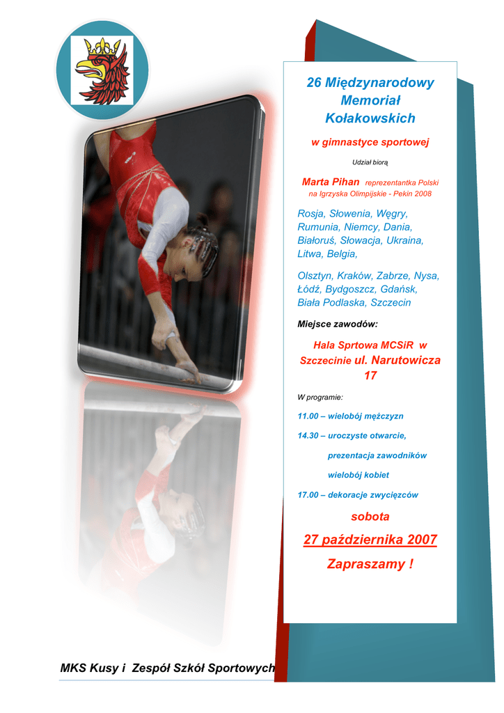 26 Międzynarodowy Memoriał Kołakowskich w gimnastyce sportowej Udział biorą Marta Pihan reprezentantka Polski na Igrzyska Olimpijskie - Pekin 2008 Rosja, Słowenia, Węgry, Rumunia, Niemcy, Dania, Białoruś, Słowacja, Ukraina, Litwa, Belgia, Olsztyn, Kraków, Zabrze, Nysa, Łódź, Bydgoszcz, Gdańsk, Biała Podlaska, Szczecin Miejsce zawodów: Hala Sprtowa MCSiR w Szczecinie ul. Narutowicza 17 W programie: 11.00 – wielobój mężczyzn 14.30 – uroczyste otwarcie, prezentacja zawodników wielobój kobiet 17.00 – dekoracje zwycięzców sobota 27 października 2007 Zapraszamy ! MKS Kusy i Zespół Szkół Sportowych