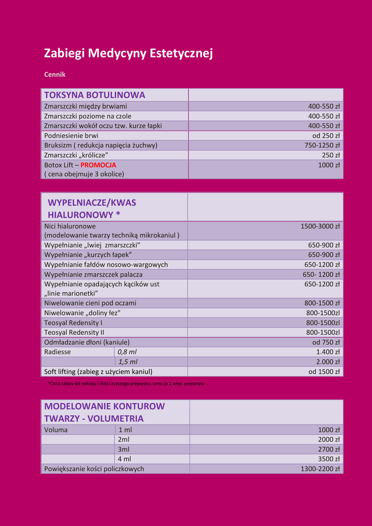 Zabiegi Medycyny Estetycznej Cennik TOKSYNA BOTULINOWA Zmarszczki między brwiami Zmarszczki poziome na czole Zmarszczki wokół oczu tzw. kurze łapki Podniesienie brwi Bruksizm ( redukcja napięcia żuchwy) Zmarszczki „królicze” Botox Lift – PROMOCJA ( cena obejmuje 3 okolice) 400-550 zł 400-550 zł 400-550 zł od 250 zł 750-1250 zł 250 zł 1000 zł WYPELNIACZE/KWAS HIALURONOWY * Nici hialuronowe (modelowanie twarzy techniką mikrokaniul ) Wypełnianie „lwiej zmarszczki” Wypełnianie „kurzych łapek” Wypełnianie fałdów nosowo-wargowych Wypełnianie zmarszczek palacza Wypełnianie opadających kącików ust „linie marionetki” Niwelowanie cieni pod oczami Niwelowanie „doliny łez" Teosyal Redensity I Teosyal Redensity II Odmładzanie dłoni (kaniule) Radiesse 0,8 ml 1,5 ml Soft lifting (zabieg z użyciem kaniul) 1500-3000 zł 650-900 zł 650-900 zł 650-1200 zł 650- 1200 zł 650-1200 zł 800-1500 zł 800-1500zl 800-1500zl 800-1500zl od 750 zł 1.400 zł 2.000 zł od 1500 zł *Cena zależy od rodzaju i ilości zużytego preparatu, cena za 1 amp. preparatu MODELOWANIE KONTUROW TWARZY - VOLUMETRIA Voluma 1 ml 2ml 3ml 4 ml Powiększanie kości policzkowych 1000 zł 2000 zł 2700 zł 3500 zł 1300-2200 zł MEZOTERAPIA I REWITALIZACJA Twarz Szyja Dekolt Oczy Regeneris (osocze bogatopłytkowe) mały zestaw duży zestaw Mezoterapia przeciw wypadaniu włosów Mezoterapia przeciw cellulitowi Hydrobalance – 1 ml Dłonie/Twarz /Dekolt 2 ml Redensity 1 ml 3 ml 300-500 zł 300 zł 300-500 zł 150 zł 750 zł 1000 zł 300 zł od 300 zł 500 zł 700 zł 800 zł 1500 zł PEELINGI LEKARSKIE Kwas glikolowy TCA chelatowe (Twarz / Dłonie) Kwas migdałowy Kwas laktobionowy Yellow Peel Peeling salicylowy Peeling Ferulowy Cosmelan (zabieg + kontrola+ preparat domowy) Dermelan (zabieg + kontrola+ preparat domowy) Peeling na bazie Retinolu 200 zł ł 300/200 zł ł 200 zł ł 200 zł ł 400 zł ł 200 zł ł 200 - 300 zł ł 1.500 zł ł 1.600 zł ł od 300 zł ł MODELOWANIE KSZTALTU UST Modelowanie/powiększanie ust Kontur ust 800-1200 zł od 600 zł ł