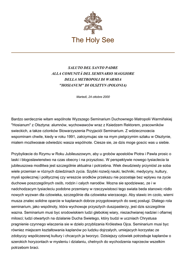 The Holy See SALUTO DEL SANTO PADRE ALLA COMUNITÀ DEL SEMINARIO MAGGIORE DELLA METROPOLI DI WARMIA "HOSIANUM" DI OLSZTYN (POLONIA) Martedì, 24 ottobre 2000 Bardzo serdecznie witam wspólnote Wyzszego Seminarium Duchownego Matropolii Warmiñskiej "Hosianum" z Olsztyna: alumnów, wychowawców wraz z Ksiedzem Rektorem, pracowników swieckich, a takze czlonków Stowarzyszenia Przyjaciól Seminarium. Z wdziecznoœcia wspominam chwile, kiedy w roku 1991, zatrzymujac sie na mym pielgrzymim szlaku w Olsztynie, mialem mozliwoœæ odwiedzic wasza wspólnote. Ciesze sie, ze dzis moge goscic was u siebie. Przybyliœcie do Rzymu w Roku Jubileuszowym, aby u grobów apostolów Piotra i Pawla prosic o laski i blogoslawienstwo na czas obecny i na przyszlosc. W perspektywie nowego tysiaclecia ta jubileuszowa modlitwa jest szczególnie aktualna i potrzebna. Wiek dwudziesty przyniósl ze soba wiele przemian w róznych dziedzinach zycia. Szybki rozwój nauki, techniki, medycyny, kultury, mysli spolecznej i politycznej czy wreszcie srodków przekazu nie pozostaje bez wplywu na zycie duchowe poszczególnych osób, rodzin i calych narodów. Mozna sie spodziewac, ze i w nadchodzacym tysiacleciu podobne przemiany w rzeczywistosci tego swiata beda stanowic ródlo nowych wyzwan dla czlowieka, szczególnie dla czlowieka wierzacego. Aby stawic im czolo, wierni musza znalec solidne oparcie w kaplanach dobrze przygotowanych do swej poslugi. Dlatego rola seminarium, jako wspólnoty, która wychowuje przyszlych duszpasterzy, jest dzis szczególnie wazna. Seminarium musi byc srodowiskiem ludzi glebokiej wiary, niezachwianej nadziei i ofiarnej milosci; ludzi otwartych na dzialanie Ducha Swietego, który budzi w uczniach Chrystusa pragnienie czynnego wlaczenia sie w dzielo przyblizania Królestwa Ojca. Seminarium musi byc równiez miejscem ksztaltowania kaplanów po ludzku dojrzalych, umiejacych korzystac ze zdobyczy wspólczesnej kultury i chcacych ja tworzyc. Dzisiejszy czlowiek potrzebuje kaplanów o szerokich horyzontach w mysleniu i dzialaniu, chetnych do wychodzenia naprzeciw wszelkim potrzebom braci. 2 Seminarium Warminskie cieszy sie dluga tradycja. W tym roku mija 435 lat od powolania przez Slugê Bozego Kardynala Stanislawa Hozjusza, tego pierwszego na polskiej ziemi Seminarium Duchownego z siedziba w Braniewie. Trudno objac w kilku zdaniach cala historie instytucji, dzieje ludzi, którzy ja tworzyli i dzielo kaplanów, którzy z niej wyszli. Niech zatem wystarczy wspomnienie ks. Wladyslawa Demskiego, którego dane mi bylo wyniesc do chwaly oltarzy posród 108 meczenników. Ten bohaterski kaplan, który wyszedl z waszego Seminarium, oddal swoje zycie za Prawde, broniac krzyza Chrystusa i wiary chrzescijanskiej. Niech jego swiadectwo bedzie dla was wszystkich wzorem i umocnieniem na drodze powolania. Modle sie, aby ten posiew krwi nieustannie wydawal owoce w postaci nowych powolan do kaplanstwa w Archidiecezji Warminskiej. Prosze Boga, aby w czasie tej jubileuszowej pielgrzymki obdarzyl was wielorakimi laskami. Chrystus, Najwyzszy i Wieczny Kaplan, niech was prowadzi w nowe tysiaclecie i niech wam blogoslawi! © Copyright - Libreria Editrice Vaticana