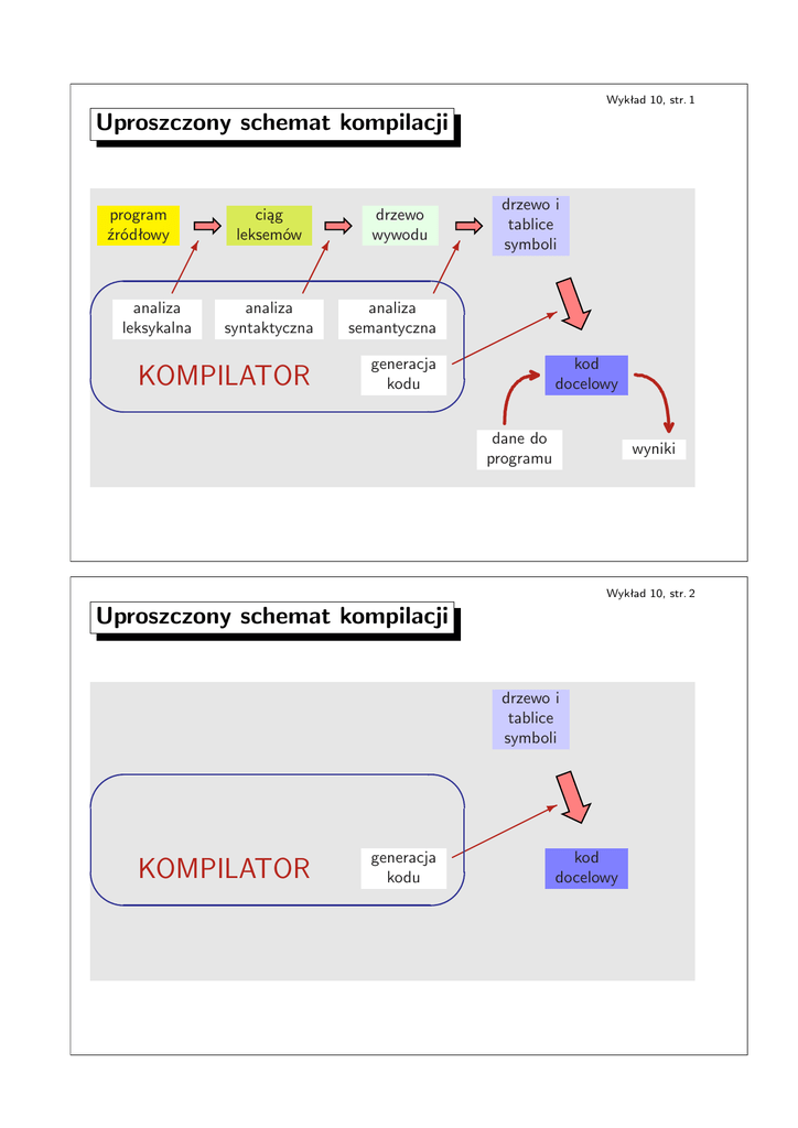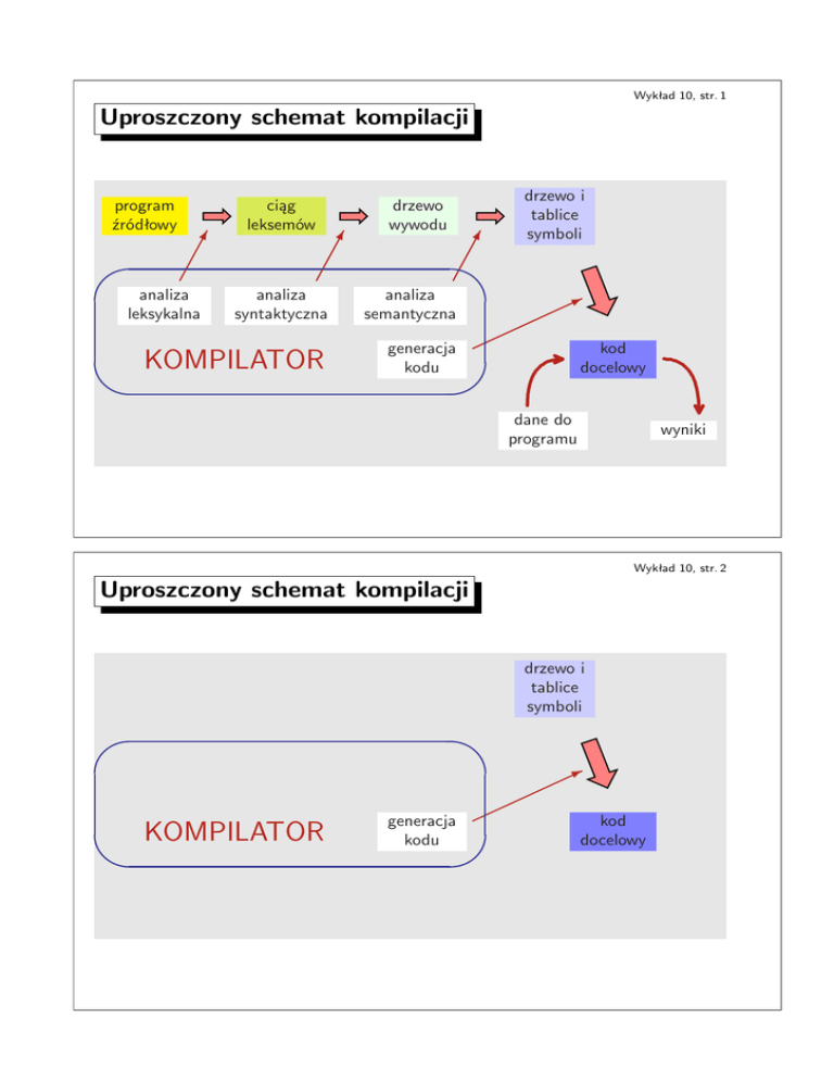 Wykład 10, str. 1 Uproszczony schemat kompilacji program źródłowy ✕ analiza leksykalna ciąg leksemów ✕ drzewo wywodu analiza syntaktyczna analiza semantyczna KOMPILATOR generacja kodu ✕ drzewo i tablice symboli ✯ kod qqqqqqqqqq qqqqq qqq qqqqq qqq docelowy qqq qq qqq qqq qqq q q dane do wyniki programu Wykład 10, str. 2 Uproszczony schemat kompilacji drzewo i tablice symboli ✯ KOMPILATOR generacja kodu kod docelowy Wykład 10, str. 3 PAMIĘĆ Programowanie niskiego poziomu rejestr arytmetyczny (akumulator) 0 1 2 3 4 5 6 7 8 9 10 11 · · · n • adresowana (czyli numerowana) pamięć złożona z komórek, z których każda może pomieścić bajt; dla uproszczenia zakładam, że nie bajt tylko liczbę całkowitą; • rejestr arytmetyczny także mogący pomieścić liczbę całkowitą; większość operacji odbywa się między rejestrem arytmetycznym a komórką pamięci; • komendy (patrz niżej) są kodowane liczbami całkowitymi i wpisywane do komórek pamięci. Wykład 10, str. 4 PAMIĘĆ Programowanie niskiego poziomu 0 1 2 3 4 5 6 7 8 9 10 11 rejestr arytmetyczny (akumulator) e r ... ✛ ...s....t....o........................... ..✒ . . . . . . . . . . . . . . . . . . ...... ..✙ ... ...... . . . . . . ......d..a KOMENDY PRZESYŁANIA: . . . . . . . . . . . . . . ......................... loa loadn n — załaduj do akumulatora liczbę n loada n — załaduj do akumulatora liczbę z komórki o adresie n store n — zapamiętaj zawartość akumulatora w kom. o adresie n · · · n loadn load = ładować store = przechowywać, magazynować Wykład 10, str. 5 PAMIĘĆ Programowanie niskiego poziomu 0 1 2 3 4 5 6 7 8 9 10 11 rejestr arytmetyczny (akumulator) ....... ... ...............✲ ..... .... .............................. .. add KOMENDY ARYTMETYCZNE: . . . .... sub .......................... add n — dodaj do akumulatora mul liczbę z kom. o adresie n; wynik w akumulatorze sub n — odejmij od akumulatora liczbę z kom. o adresie n; wynik w akumulatorze mul n — pomnóż akumulator przez liczbę z kom. o adresie n; wynik w akumulatorze add = dodawać subtract = odejmować multiply = mnożyć · · · n Wykład 10, str. 6 PAMIĘĆ Programowanie niskiego poziomu 0 1 2 3 4 5 6 7 8 9 10 11 rejestr arytmetyczny (akumulator) ....................... incr . . . . . . . . . .. .... ..... .✙ ....... ... decr ............ increment = zwiększać decrement = zmniejszać · · · n KOMENDY DZIAŁAŃ NA KOMÓRKACH: incr n — powiększ o 1 zawartość kom. o adresie n decr n — zmniejsz o 1 zawartość kom. o adresie n Wykład 10, str. 7 PAMIĘĆ Programowanie niskiego poziomu 0 1 2 3 4 5 6 7 8 9 10 11 rejestr arytmetyczny (akumulator) komenda KOMENDY SKOKÓW: komenda ......... komenda ..✛ goto n — przejdź do komórki ... goto . ... o adresie n komenda ..zergoto zergoto n — jeśli w akumul. zero, . komenda ..plsgoto . to przejdź do kom. komenda .. mingoto . . . o adresie n skok ........ plsgoto n — jeśli akum. dodatni, komenda to przejdź do kom. komenda mingoto n — stop — · · · n o adresie n jeśli akum. ujemny, to przejdź do kom. o adresie n zatrzymaj działanie go to = idź do Wykład 10, str. 8 PAMIĘĆ Programowanie niskiego poziomu 0 1 2 3 4 5 6 7 8 9 10 11 297 8 5 -3 1 loada 2 mul 1 add 3 mul 1 add 4 store 0 stop · · · n rejestr arytmetyczny (akumulator) 297 PRZYKŁAD: Obliczenie wartości wielomianu 5x2 − 3x + 1 = (5 · x − 3) · x + 1 (współczynniki w komórkach 2–4) w punkcie x = 8 (komórka 1); wynik w komórce 0. Program należy uruchomić od komórki 5. Wykład 10, str. 9 PAMIĘĆ Programowanie niskiego poziomu 0 loadn 1 1 store 10 2 loada 10 mul 9 3 4 store 10 decr 9 5 6 loada 9 7 plsgoto 2 stop 8 n 0 9 s 6 10 11 · · · rejestr arytmetyczny (akumulator) 0 PRZYKŁAD: Obliczenie silni s=1; do s=s*n; n--; while (n>0); dla początkowej wartości n = 3. Program należy uruchomić od komórki 0; wynik zostaje w kom. 10. n Wykład 10, str. 10 Programowanie niskiego poziomu Prosty adres komendy: liczba całkowita oznaczająca • albo samą liczbę, np. loadn 500 oznacza: załaduj do akumulatora liczbę 500; • albo adres komórki, której dotyczy komenda, np. loada 500 oznacza: załaduj do akumulatora liczbę z komórki 500. Modyfikowany adres komendy: postaci n+[k] — adres n modyfikowany zawartością komórki o adresie k, należy tą zawartość do adresu n dodać. Np. jeśli pod adresem 500 stoi liczba 1, to komenda add 200+[500] oznacza: dodaj do akumulatora zawartość komórki 201; a jeśli pod adresem 500 stoi liczba 5, to ta sama komenda add 200+[500] oznacza: dodaj do akumulatora zawartość komórki 205. Wykład 10, str. 11 PAMIĘĆ Programowanie niskiego poziomu decr 6 0 1 loadn 0 2 store 7+[6] 3 loada 6 4 plsgoto 0 stop 5 5 6 10 7 11 8 12 9 13 10 14 11 · · · n rejestr arytmetyczny (akumulator) PRZYKŁAD: n a0 a1 a2 a3 a4 Zerowanie n komórek: do n--; a[n]=0; while (n>0); (wielkość n obszaru zerowanego zapisana jest w komórce 6; sam obszar zaczyna się w komórce 7). Program należy uruchomić od komórki 0.