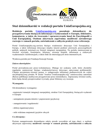 Staż dziennikarski w redakcji portalu UniaEuropejska.org Redakcja portalu UniaEuropejska.org poszukuje dziennikarzy do przygotowywania bieżących informacji o wydarzeniach w Europie, felietonów, komentarza, a także do tworzenia i opracowywania haseł do Encyklopedii o Unii Europejskiej. Osobom aktywnym zapewnimy możliwość zawodowego rozwoju w ramach portalu, zaświadczenie o odbyciu praktyk oraz referencje. Portal UniaEuropejska.org zawiera bieżące wiadomości dotyczące Unii Europejskiej i Europy, a także informacje dotyczące między innymi podstaw prawnych, poszczególnych polityk, unijnych instytucji czy historii integracji europejskiej. Na portalu zamieszczane są również wywiady, komentarze, felietony, recenzje książek, informacje o ciekawych wydarzeniach i konferencjach, a także linki do interesujących stron internetowych. Wydawcą portalu jest Fundacja Koncept Europa. Zakres obowiązków: Portal prowadzony jest przez wolontariuszy. Dlatego też szukamy osób, które chciałyby regularnie zamieszczać bieżące wiadomości/newsy dotyczące opisywanej problematyki. Chętnie przyjmiemy również pomoc w redagowaniu informacji podstawowych do części encyklopedycznej portalu. W dziale "Analiza UniaEuropejska.org" zamieszczamy natomiast dłuższe publikacje analityczne przygotowane przez dziennikarzy. Zapraszamy również osoby, które będą chciały przeprowadzać wywiady, pisać felietony czy recenzje. Wymagania: Od dziennikarzy wymagamy: -znajomości tematyki integracji europejskiej, struktur Unii Europejskiej, bieżących wydarzeń w Europie - umiejętności pisania tekstów i poprawności językowej - zaangażowania i regularności - dobrej organizacji pracy - mile widziana znajomość języków obcych Co oferujemy: Poziom zaangażowania dziennikarza zależy przede wszystkim od jego chęci, a osobom aktywnym zapewnimy możliwość rozwoju w ramach portalu, zaświadczenie o odbyciu praktyk oraz referencje. Szczegóły zaliczenia praktyk dostępne są na stronie portalu: http://www.uniaeuropejska.org/staz. Każdy dziennikarz pracuje pod opieką przydzielonego mu redaktora, który czuwa nad poziomem pisanych tekstów i udziela wszelkich wskazówek i pomocy przy pisaniu i rozwijaniu warsztatu pisarskiego. Zaletą praktyk na portalu jest możliwość odbywania ich na odległość i w dowolnym czasie – wystarczy komputer z dostępem do internetu. Staż na portalu UniaEuropejska.org da Ci szansę na to, aby przekuć swoją wiedzę o UE i Europie w praktykę i wzbogacić zawodowe portfolio. Kontakt: Osoby zainteresowane projektem prosimy o przesłanie CV oraz informacji dotyczącej preferowanej tematyki na adres: [email protected] Zachęcamy serdecznie do odwiedzenia naszego portalu.