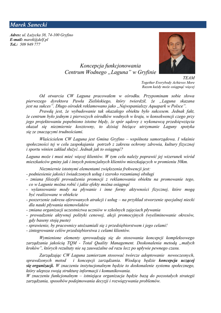 Marek Sanecki Adres: ul. Łużycka 38, 74-100 Gryfino E-mail: [email protected] Tel.: 509 949 777 Koncepcja funkcjonowania Centrum Wodnego „Laguna” w Gryfinie TEAM Together Everybody Achieves More Razem każdy może osiągnąć więcej Od otwarcia CW Laguna pracowałem w ośrodku. Przypominam sobie słowa pierwszego dyrektora Pawła Zielińskiego, który twierdził, że „Laguna skazana jest na sukces”. Długo ośrodek reklamowano jako „Najwspanialszy Aquapark w Polsce”. Prawdą jest, że wybudowanie tak okazałego obiektu było sukcesem. Jednak fakt, że centrum było jednym z pierwszych ośrodków wodnych w kraju, w konsekwencji czego przy jego projektowaniu popełniono istotne błędy, że spór sądowy z wykonawcą przedsięwzięcia okazał się niezmiernie kosztowny, to dzisiaj bieżące utrzymanie Laguny spotyka się ze znaczącymi trudnościami. Właścicielem CW Laguna jest Gmina Gryfino – wspólnota samorządowa. I właśnie społeczności tej w celu zaspokajania potrzeb z zakresu ochrony zdrowia, kultury fizycznej i sportu winien zakład służyć. Jednak jak to osiągnąć? Laguna może i musi mieć więcej klientów. W tym celu należy poprawić jej wizerunek wśród mieszkańców gminy jak i innych potencjalnych klientów mieszkających w promieniu 50km. Niezmiernie istotnymi elementami zwiększenia frekwencji jest: - podniesienie jakości świadczonych usług i szeroko rozumianej obsługi - zmiana filozofii prowadzenia promocji z reklamowania obiektu na promowanie tego, co w Lagunie można robić i jakie efekty można osiągnąć - wylansowanie mody na pływanie i inne formy aktywności fizycznej, które mogą być realizowane w obiekcie - poszerzenie zakresu oferowanych atrakcji i usług – na przykład stworzenie specjalnej niecki dla nauki pływania niemowlaków - zmiana organizacji uczestnictwa uczniów w szkolnych zajęciach pływania - prowadzenie aktywnej polityki cenowej, akcji promocyjnych (wyeliminowanie okresów, gdy baseny stoją puste) - sprawienie, by pracownicy utożsamiali się z przedsiębiorstwem i jego celami! - zintegrowanie celów przedsiębiorstwa z celami klientów. Wymienione elementy sprowadzają się do stosowania koncepcji kompleksowego zarządzania jakością TQM - Total Quality Management. Doskonalenia metodą „małych kroków”, których rezultaty nie są zauważalne od razu lecz po upływie pewnego czasu. Zarządzając CW Laguna zamierzam stosować twórcze adoptowanie nowoczesnych, sprawdzonych metod i koncepcji zarządzania. Wiodącą będzie koncepcja uczącej się organizacji. W znaczeniu instytucjonalnym będzie to doskonalenie systemu społecznego, który ulepsza swoją strukturę informacji i komunikowania. W znaczeniu funkcjonalnym – istniejąca organizacja będzie bazą do pozostałych strategii zarządzania, sposobów podejmowania decyzji i rozwiązywania problemów. Będzie to organizacja wykorzystująca sumę wiedzy kadry kierowniczej i innych pracowników. Wiedza posiadana przez wszystkich pracujących na rzecz obsługi klientów będzie stale wzbogacana i rozwijana, a następnie udostępniana przedsiębiorstwu. W organizacji nagradzał będę nowoczesne sposoby myślenia, wdrażanie w praktykę skutecznych metod rozwiązywania problemów. Reasumując: tworzył będę zakład otwarty, myślący systemowo, kreatywny, skuteczny i uczący się. Zamierzam również stosować metodę Benchmarking – uczenia się od najlepszych. Byłem w wielu ośrodkach sportowych, centrach wodnych w kraju i za granicą i wiem, że mamy się czego uczyć! Zakład budżetowy funkcjonuje w Gminie Gryfino i na tle jej spraw winno być analizowane jego zarządzanie. „Żyjemy tu i teraz”. Możliwych i potrzebnych rozwiązań jest wiele. W zakresie szeroko rozumianej kultury fizycznej i sportu należałoby stworzyć jeden silny, efektywny, prężny ośrodek, który realizowałby rolę lidera tej niezmiernie istotnej, ważnej i ciekawej dziedziny życia społecznego. Ośrodek ten mógłby funkcjonować pod nazwą: Centrum Wody i Sportu Laguna. Działania i pomysły, które chciałbym zrealizować w pierwszym okresie pełnia funkcji dyrektora CW Laguna: - odnowienie elewacji obiektu - poszerzenie oferty o usługę: „Urodziny w Lagunie”- organizacja urodzin dla dzieci - uruchomienie punktu przedszkolnego w godz. 7.00 – 16.00 z nauką pływania - uruchomienie punktu świetlicowego w godz. 16.30 – 20.00 dla rodziców, którzy chcą skorzystać z pływalni bez dzieci - uruchomienie punktu kawiarniano – bibliotecznego z dostępem do Internetu dla tych, którzy czekają na swoje pływające dzieci - prowadzenie 10 godzinnych kursów nauki pływania dla dzieci i dorosłych – różne poziomy - reorganizacja systemu ochrony obiektu – rezygnacja z usług firmy zewnętrznej. Niskonakładowe działania organizacyjne do wykonania w celu poprawy jakości obsługi klientów i zwiększenia poziomu satysfakcji po pobycie w obiekcie: - wskazanie, że parking, który do niedawna był płatny, aktualnie jest ogólnie dostępny - wykonanie przejazdu przez lewą część parkingu (skutkujące ułatwieniem parkowania i zmniejszeniem kolizji) - wdrożenie procedur udostępniania toalet i natrysków dla niepełnosprawnych - uatrakcyjnienie kolorystyki obiektu, wprowadzenie elementów podkreślających klimat wypoczynku i relaksu - modernizacja systemu dostarczania wody do natrysków, aktualnie klienci włączają kilka natrysków, aby leciała ciepła woda we właściwym - systematyczna konserwacja kranów - podniesienie czystości i poprawa zapachów występujących w toaletach i przebieralniach. Działania i pomysły, które chciałbym zrealizować w dalszej perspektywie: - likwidacja rozpadających się schodów za basenem solankowym (schody te nie posiadają połączenia z bryłą obiektu) i zagospodarowanie tego terenu z myślą o kliencie. - uruchomienie siłowni z poradami instruktorskimi do rekreacji sportowej dla klientów (oferta rozszer