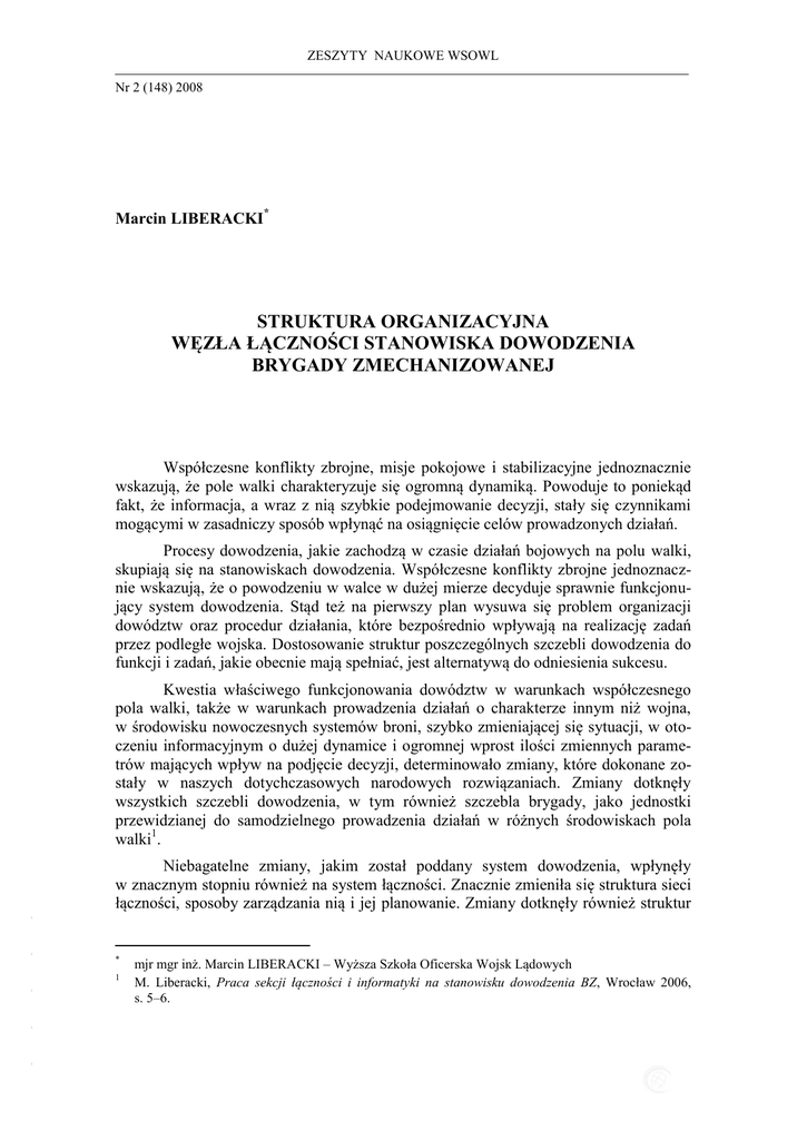 ZESZYTY NAUKOWE WSOWL Nr 2 (148) 2008 ISSN 1731-8157 Marcin LIBERACKI* STRUKTURA ORGANIZACYJNA WĘZŁA ŁĄCZNOŚCI STANOWISKA DOWODZENIA BRYGADY ZMECHANIZOWANEJ Współczesne konflikty zbrojne, misje pokojowe i stabilizacyjne jednoznacznie wskazują, że pole walki charakteryzuje się ogromną dynamiką. Powoduje to poniekąd fakt, że informacja, a wraz z nią szybkie podejmowanie decyzji, stały się czynnikami mogącymi w zasadniczy sposób wpłynąć na osiągnięcie celów prowadzonych działań. Procesy dowodzenia, jakie zachodzą w czasie działań bojowych na polu walki, skupiają się na stanowiskach dowodzenia. Współczesne konflikty zbrojne jednoznacznie wskazują, że o powodzeniu w walce w dużej mierze decyduje sprawnie funkcjonujący system dowodzenia. Stąd też na pierwszy plan wysuwa się problem organizacji dowództw oraz procedur działania, które bezpośrednio wpływają na realizację zadań przez podległe wojska. Dostosowanie struktur poszczególnych szczebli dowodzenia do funkcji i zadań, jakie obecnie mają spełniać, jest alternatywą do odniesienia sukcesu. Kwestia właściwego funkcjonowania dowództw w warunkach współczesnego pola walki, także w warunkach prowadzenia działań o charakterze innym niż wojna, w środowisku nowoczesnych systemów broni, szybko zmieniającej się sytuacji, w otoczeniu informacyjnym o dużej dynamice i ogromnej wprost ilości zmiennych parametrów mających wpływ na podjęcie decyzji, determinowało zmiany, które dokonane zostały w naszych dotychczasowych narodowych rozwiązaniach. Zmiany dotknęły wszystkich szczebli dowodzenia, w tym również szczebla brygady, jako jednostki przewidzianej do samodzielnego prowadzenia działań w różnych środowiskach pola walki1. - - Niebagatelne zmiany, jakim został poddany system dowodzenia, wpłynęły w znacznym stopniu również na system łączności. Znacznie zmieniła się struktura sieci łączności, sposoby zarządzania nią i jej planowanie. Zmiany dotknęły również struktur * - - - 1 mjr mgr inż. Marcin LIBERACKI – Wyższa Szkoła Oficerska Wojsk Lądowych M. Liberacki, Praca sekcji łączności i informatyki na stanowisku dowodzenia BZ, Wrocław 2006, s. 5–6. Marcin LIBERACKI organizacyjnych pododdziałów dowodzenia i łączności oraz komórek organizacyjnych zajmujących się planowaniem systemów łączności w dowództwach brygad2. Zapewnienie sprawności funkcjonowania systemu dowodzenia brygady zmechanizowanej i możliwości realizacji przez nią zadań jest uwarunkowane właściwym zorganizowaniem podsystemu wymiany informacji, a więc dobrego zaplanowania i wykorzystania środków dowodzenia w ramach systemu łączności. W organizowaniu systemu łączności brygady uczestniczy, wchodzący w jej skład, batalion dowodzenia. Batalion jest samodzielnym pododdziałem z określonym, stałym przeznaczeniem i niezmiennymi zadaniami, które realizuje na rzecz dowództwa i pododdziałów brygady zmechanizowanej. Od ubiegłego roku w oddziałach ogólnowojskowych wprowadzane są struktury batalionu dowodzenia o następującej konstrukcji (rys. 1): kompania dowodzenia SD; kompania dowodzenia TSD; kompania logistyczna; pluton chemiczny. DOWÓDCA BATALIONU ZASTĘPCA DOWÓDCY BATALIONU SZTAB SEKCJA PERSONALNOWYCHOWAWCZA (S-1) KOMPANIA DOWODZENIA SD KOMPANIA DOWODZENIA TSD SEKCJA OPERACYJNA (S-3) SEKCJA LOGISTYKI (S-4) KOMPANIA LOGISTYCZNA PLUTON CHEMICZNY Rys. 1. Struktura organizacyjna batalionu dowodzenia Źródło: H. Łukasiewicz, opracowanie własne Do podstawowych zadań batalionu dowodzenia należy rozwinięcie i eksploatacja stanowisk dowodzenia BZ, ich ochrona i obrona oraz zapewnienie właściwym oso- - 20 - 2 - - - Zasadniczym przeznaczeniem batalionu dowodzenia jest zapewnienie sprawnej organizacji i właściwego funkcjonowania systemu dowodzenia brygady w różnych warunkach wykonywania zadania. Tamże, s. 6. STRUKTURA ORGANIZACYJNA WĘZŁA ŁĄCZNOŚCI STANOWISKA DOWODZENIA… bom funkcyjnym łączności z przełożonym, podwładnymi i współdziałającymi oddziałami (pododdziałami). Z racji podjętego tematu publikacji autor w dalszej części poruszał będzie kwestie występującej w strukturze batalionu dowodzenia kompanii dowodzenia stanowiska dowodzenia (SD). Nie zostanie dokonana charakterystyka pozostałych pododdziałów znajdujących się w batalionie dowodzenia. Kompania dowodzenia SD (rys. 2) jest przeznaczona do rozwinięcia stanowiska dowodzenia brygady oraz zapewnienia łączności dowództwu brygady w zakresie dowodzenia, współdziałania, ostrzegania i alarmowania. KOMPANIA DOWODZENIA SD PLUTON APARATOWNI PLUTON RADIOWY OBSŁUGA APARATOWNI KOMPUTEROWEJ OBSŁUGA RADIOSTACJI OBSŁUGA MMSD DRUŻYNA RADIOTELEF. - DOWÓDCA KOMPANI - Z-CA D-CY KOMPANII - TECHNIK PODODDZIAŁU - SZEF KOMPANII PLUTON ŁĄCZNOŚCI OBSŁUGA APARATOWNI RWŁC-10/T DRUŻYNA OCHRONY OBSŁUGA WWK-10C OBSŁUGA WWK-10C PWPP ZAŁOGA WOZU DOWODZENIA ZAŁOGA WOZU PLUTON OCHR. I RR DRUŻYNA REGULACJI RUCHU STACJA ZASILANIA ZAŁOGA WOZU ZAŁOGA WOZU DOWODZENIA ZAŁOGA DOWODZENIA ZAŁOGAWOZU WOZU DOWODZENIA DOWODZENIA DOWODZENIA OBSŁUGA TERMINALA SAT. DRUŻYNA KURSÓW POCZT. Rys. 2. Struktura organizacyjna kompanii dowodzenia SD bdow - - - - - Źródło: H. Łukasiewicz, opracowanie własne Kompania dowodzenia SD wykonuje następujące zadania: rozwinięcie i eksploatacja węzłów łączności stanowisk dowodzenia (SD oraz doraźnie PDO); rozwinięcie i eksploatacja relacji łączności przy użyciu środków radiowych KF i UKF, radioliniowych oraz kablowych; rozwinięcie i eksploatacja relacji łączności przy użyciu środków poczty polowej; przygotowanie miejsc pracy organom dowodzenia na SD brygady; ochrona i obrona stanowiska dowodzenia; 21 Marcin LIBERACKI zapewnienie bezkolizyjnego przemieszczania się elementów, jak i całego stanowiska dowodzenia. W celu wykonania powyższych zadań kompania dowodzenia ulega transformacji na elementy węzła łącznoś