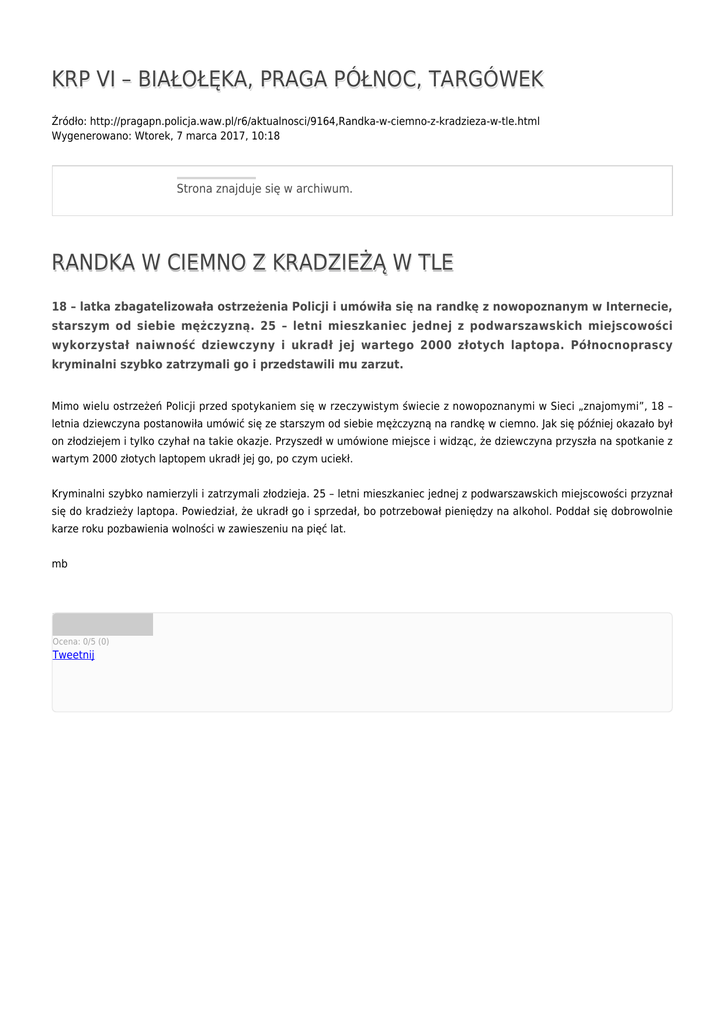 KRP VI – BIAŁOŁĘKA, PRAGA PÓŁNOC, TARGÓWEK Źródło: http://pragapn.policja.waw.pl/r6/aktualnosci/9164,Randka-w-ciemno-z-kradzieza-w-tle.html Wygenerowano: Wtorek, 7 marca 2017, 10:18 Strona znajduje się w archiwum. RANDKA W CIEMNO Z KRADZIEŻĄ W TLE 18 – latka zbagatelizowała ostrzeżenia Policji i umówiła się na randkę z nowopoznanym w Internecie, starszym od siebie mężczyzną. 25 – letni mieszkaniec jednej z podwarszawskich miejscowości wykorzystał naiwność dziewczyny i ukradł jej wartego 2000 złotych laptopa. Północnoprascy kryminalni szybko zatrzymali go i przedstawili mu zarzut. Mimo wielu ostrzeżeń Policji przed spotykaniem się w rzeczywistym świecie z nowopoznanymi w Sieci „znajomymi”, 18 – letnia dziewczyna postanowiła umówić się ze starszym od siebie mężczyzną na randkę w ciemno. Jak się później okazało był on złodziejem i tylko czyhał na takie okazje. Przyszedł w umówione miejsce i widząc, że dziewczyna przyszła na spotkanie z wartym 2000 złotych laptopem ukradł jej go, po czym uciekł. Kryminalni szybko namierzyli i zatrzymali złodzieja. 25 – letni mieszkaniec jednej z podwarszawskich miejscowości przyznał się do kradzieży laptopa. Powiedział, że ukradł go i sprzedał, bo potrzebował pieniędzy na alkohol. Poddał się dobrowolnie karze roku pozbawienia wolności w zawieszeniu na pięć lat. mb Ocena: 0/5 (0) Tweetnij
