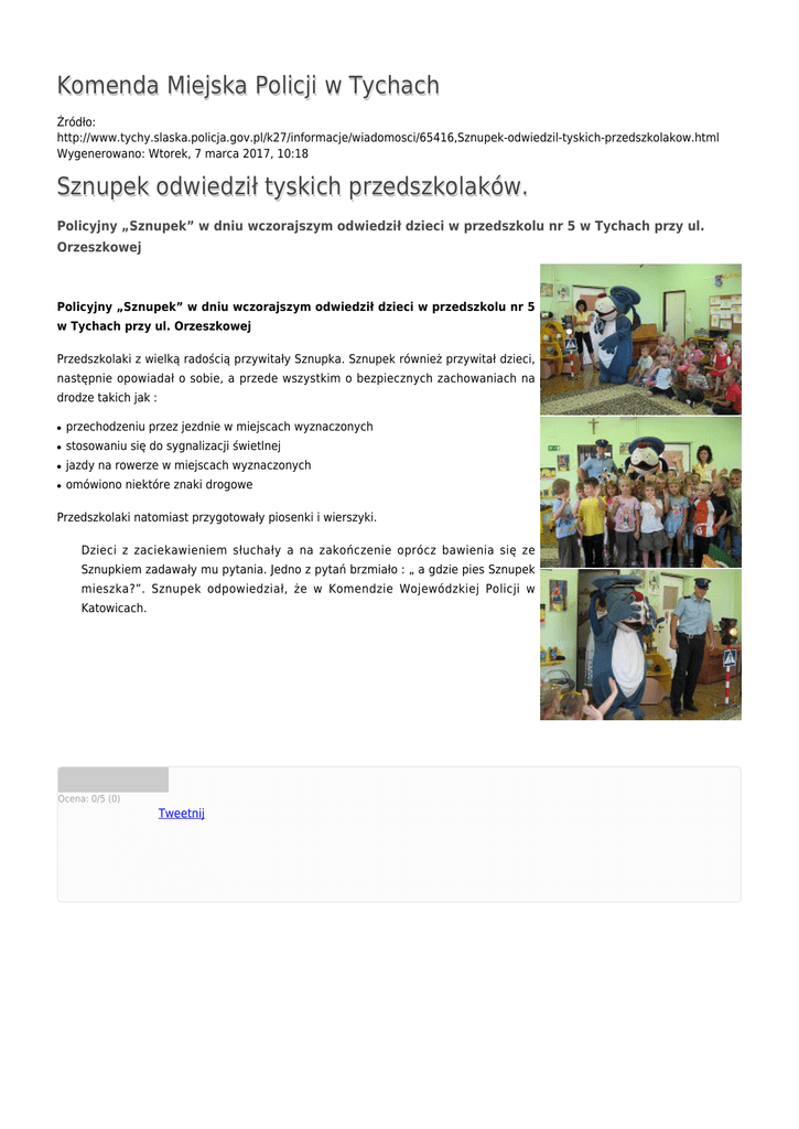 Komenda Miejska Policji w Tychach Źródło: http://www.tychy.slaska.policja.gov.pl/k27/informacje/wiadomosci/65416,Sznupek-odwiedzil-tyskich-przedszkolakow.html Wygenerowano: Wtorek, 7 marca 2017, 10:18 Sznupek odwiedził tyskich przedszkolaków. Policyjny „Sznupek” w dniu wczorajszym odwiedził dzieci w przedszkolu nr 5 w Tychach przy ul. Orzeszkowej Policyjny „Sznupek” w dniu wczorajszym odwiedził dzieci w przedszkolu nr 5 w Tychach przy ul. Orzeszkowej Przedszkolaki z wielką radością przywitały Sznupka. Sznupek również przywitał dzieci, następnie opowiadał o sobie, a przede wszystkim o bezpiecznych zachowaniach na drodze takich jak : ● przechodzeniu przez jezdnie w miejscach wyznaczonych ● stosowaniu się do sygnalizacji świetlnej ● jazdy na rowerze w miejscach wyznaczonych ● omówiono niektóre znaki drogowe Przedszkolaki natomiast przygotowały piosenki i wierszyki. Dzieci z zaciekawieniem słuchały a na zakończenie oprócz bawienia się ze Sznupkiem zadawały mu pytania. Jedno z pytań brzmiało : „ a gdzie pies Sznupek mieszka?”. Sznupek odpowiedział, że w Komendzie Wojewódzkiej Policji w Katowicach. Ocena: 0/5 (0) Tweetnij