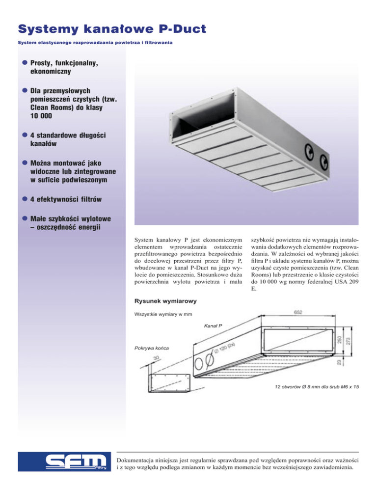 Systemy kanałowe P-Duct System elastycznego rozprowadzania powietrza i filtrowania Prosty, funkcjonalny, ekonomiczny Dla przemysłowych pomieszczeń czystych (tzw. Clean Rooms) do klasy 10 000 4 standardowe długości kanałów Można montować jako widoczne lub zintegrowane w suficie podwieszonym 4 efektywności filtrów Małe szybkości wylotowe – oszczędność energii System kanałowy P jest ekonomicznym elementem wprowadzania ostatecznie przefiltrowanego powietrza bezpośrednio do docelowej przestrzeni przez filtry P, wbudowane w kanał P-Duct na jego wylocie do pomieszczenia. Stosunkowo duża powierzchnia wylotu powietrza i mała szybkość powietrza nie wymagają instalowania dodatkowych elementów rozprowadzania. W zależności od wybranej jakości filtra P i układu systemu kanałów P, można uzyskać czyste pomieszczenia (tzw. Clean Rooms) lub przestrzenie o klasie czystości do 10 000 wg normy federalnej USA 209 E. Rysunek wymiarowy Wszystkie wymiary w mm Kanał P Pokrywa końca 12 otworów Ø 8 mm dla śrub M6 x 15 Dokumentacja niniejsza jest regularnie sprawdzana pod względem poprawności oraz ważności i z tego względu podlega zmianom w każdym momencie bez wcześniejszego zawiadomienia. Systemy kanałowe P-Duct -2- Typy/dane techniczne Znamionowe przepływy powietrza w m3/h System kanałowy P-Duct Typ Długość A mm P1 690 3 P2 1100 P3 P4 Ilość filtrów P Typ filtra P*’ blue red yellow glass (S) m3/h 300 300 300 360 5 m3/h 500 500 500 600 1500 7 m3/h 700 700 700 840 1910 9 m3/h 900 900 900 1080 Maks. szybkość wylotowa powietrza m/s 0.23 0.23 0.23 0.28 Początkowy spadek ciśnienia Pa 25 85 105 160 Efektywność początkowa wg EUROVENT 4/4 (Test płomieniem sodowym) % 70 92.3 98.6 > 99.995 Dopuszczalna wilgotność względna % 85 85 85 100 Klasa filtra wg EUROVENT 4/5, 4/4 - EU9 EU9 EU10 EU13 Klasa filtra wg EN 779, prEN 1822 - F9 H10 H11 H13 *) Szczegółowe dane techniczne patrz ulotkę Ultrafiltr P. Specyfikacje materiałowe Zespoły kanałowe P-Duct w 4 wielkościach, wykonane z blachy stalowej 1.0 i 1.5 mm, ocynkowanej lub z białą∆) powłoką proszkową epoksydową. Konstrukcja hermetyczna dla wbudowania ultrafiltrów typu P z kołnierzami skierowanymi do wewnątrz dla przyłączenia wielu zespołów i pokrywy końca. Wyposażenie dodatkowe 2 hermetyczne pokrywki mocujące i kontrolne, średnica 150 mm Pokrywka końca Element łączeniowy, o długości 80 mm, ze stali ocynkowanej lub z białą powłoką∆) proszkową epoksydową. Złącze DEHS (dla wprowadzenia sztucznych aerozoli podczas badania odbiorczego). Specjalna taśma (55 m w rolce, wystarczy dla ok. 35 filtrów). dla temperatur do 70oC: zamówienie nr 491 10 0520 dla temperatur do 135oC: zamówienie nr 491 10 0520 Standardowy kolor RAL 9010; inne kolory na żądanie. ∆) Rady dotyczące konstrukcji i planowania Maksymalna szybkość powietrza w kanale 6 m/s. Maksymalny przepływ powietrza na odgałęzienie 3500 m3/h. Maksymalna różnica temperatur (tpomieszczenia – tdoprowadzanego powietrza 6oC. Minimalna wysokość pomieszczenia 3 m. Powietrze wylotowe musi być usuwane blisko poziomu podłogi. Ostatnia część kanału P-Duct w odgałęzieniu musi być wyposażona w dwie szczelne pokrywki mocujące i kontrolne (patrz wyposażenie dodatkowe). W przypadku wymagania złącza DEHS, w każdym odgałęzieniu musi być osobne. Zespoły kanałowe P uszczelniane są wewnętrznie szczeliwem PU (np. „Sikaflex F 11”). Filtry należy instalować po wyczyszczeniu kanału P-Dukt i bezpośrednio przed uruchomieniem systemu AC. W ten sposób unika się uszkodzenia i maksymalizuje żywotność filtra. W zależności od jakości wstępnego filtrowania i generowania cząsteczek w pomieszczeniu, można osiągnąć okres żywotności od 2 do 6 lat. Filtry P uszczelniane są wewnątrz kanału P szczeliwem PU (np. „Sikaflex F 11”) lub specjalną taśmą przylepną (patrz wyposażenie dodatkowe). Przykład zastosowania Możliwości doprowadzania powietrza Normalnie powietrze doprowadzane jest z boku (patrz przypadek A) przez złącze (patrz wyposażenie dodatkowe). Powietrze można doprowadzać z góry (przypadek B) lub z boku i wyżej (przypadek C). Instalacja System kanałowy P-Duct można instalować w pomieszczeniu, zawieszony bezpośrednio z sufitu (przypadek D) lub wbudować w podwieszony sufit (przypadek E). W tym drugim przypadku, system kanałowy P-Duct może być wyposażony na żądanie w zamontowany fabrycznie sufitowy wspornik podporowy. Wymiana filtra Filtr powinien być wymieniany i następnie testowany przez odpowiednio przeszkolony i wykwalifikowany personel. Dokumentacja niniejsza jest regularnie sprawdzana pod względem poprawności oraz ważności i z tego względu podlega zmianom w każdym momencie bez wcześniejszego zawiadomienia. Systemy kanałowe P-Duct -3- Przypadek A (przypadek normalny) Doprowadzanie powietrza z boku. 0.7–2.0 G Przypadek B Doprowadzanie powietrza z góry. 1.5 –4.0 m 1.5 –4.0 m E E F A F A C E F A C D 0.7–2.0 C B B B B B B H G D H H D Powietrze doprowadzane (przy poziomie sufitu) Powietrze wylotowe (przy poziomie podłogi) Przypadek C Doprowadzanie powietrza z boku i powyżej G Przypadek D (zawieszony z sufitu) Sufit kanał P Oświetlenie Przypadek E (zintegrowany w suficie podwieszonym) Sufit Kątownik oparcia sufitu kanał P Oświetlenie Podsufitka Dokumentacja niniejsza jest regularnie sprawdzana pod względem poprawności oraz ważności i z tego względu podlega zmianom w każdym momencie bez wcześniejszego zawiadomienia.