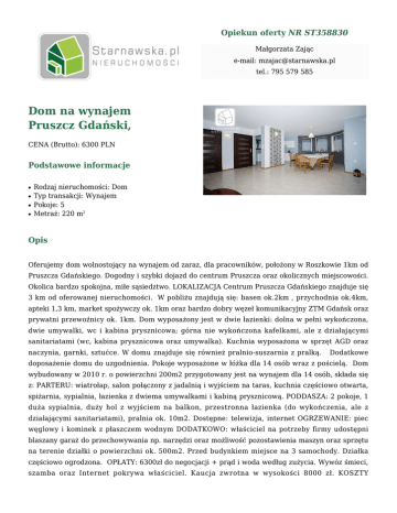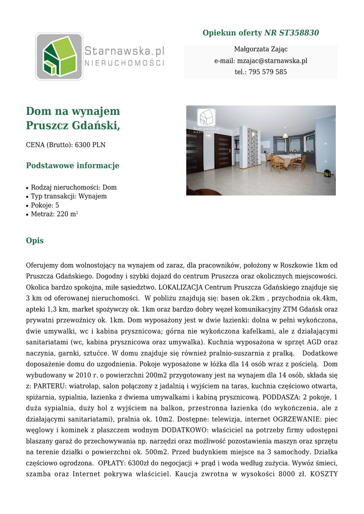 Opiekun oferty NR ST358830 Małgorzata Zając e-mail: [email protected] tel.: 795 579 585 Dom na wynajem Pruszcz Gdański, CENA (Brutto): 6300 PLN Podstawowe informacje ● ● ● ● Rodzaj nieruchomości: Dom Typ transakcji: Wynajem Pokoje: 5 Metraż: 220 m2 Opis Oferujemy dom wolnostojący na wynajem od zaraz, dla pracowników, położony w Roszkowie 1km od Pruszcza Gdańskiego. Dogodny i szybki dojazd do centrum Pruszcza oraz okolicznych miejscowości. Okolica bardzo spokojna, miłe sąsiedztwo. LOKALIZACJA Centrum Pruszcza Gdańskiego znajduje się 3 km od oferowanej nieruchomości. W pobliżu znajdują się: basen ok.2km , przychodnia ok.4km, apteki 1,3 km, market spożywczy ok. 1km oraz bardzo dobry węzeł komunikacyjny ZTM Gdańsk oraz prywatni przewoźnicy ok. 1km. Dom wyposażony jest w dwie łazienki: dolna w pełni wykończona, dwie umywalki, wc i kabina prysznicowa; górna nie wykończona kafelkami, ale z działającymi sanitariatami (wc, kabina prysznicowa oraz umywalka). Kuchnia wyposażona w sprzęt AGD oraz naczynia, garnki, sztućce. W domu znajduje się również pralnio-suszarnia z pralką. Dodatkowe doposażenie domu do uzgodnienia. Pokoje wyposażone w łóżka dla 14 osób wraz z pościelą. Dom wybudowany w 2010 r. o powierzchni 200m2 przygotowany jest na wynajem dla 14 osób, składa się z: PARTERU: wiatrołap, salon połączony z jadalnią i wyjściem na taras, kuchnia częściowo otwarta, spiżarnia, sypialnia, łazienka z dwiema umywalkami i kabiną prysznicową. PODDASZA: 2 pokoje, 1 duża sypialnia, duży hol z wyjściem na balkon, przestronna łazienka (do wykończenia, ale z działającymi sanitariatami), pralnia ok. 10m2. Dostępne: telewizja, internet OGRZEWANIE: piec węglowy i kominek z płaszczem wodnym DODATKOWO: właściciel na potrzeby firmy udostępni blaszany garaż do przechowywania np. narzędzi oraz możliwość pozostawienia maszyn oraz sprzętu na terenie działki o powierzchni ok. 500m2. Przed budynkiem miejsce na 3 samochody. Działka częściowo ogrodzona. OPŁATY: 6300zł do negocjacji + prąd i woda według zużycia. Wywóz śmieci, szamba oraz Internet pokrywa właściciel. Kaucja zwrotna w wysokości 8000 zł. KOSZTY OGRZEWANIA piecem węglowym pokrywa właściciel! Serdecznie zapraszam na prezentację domu!