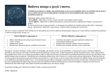 Budowa mózgu a język i mowa. Chciałabym przedstawić w pigułce, jak podział mózgu na lewą i prawą półkulę wpływa na kształtowanie się języka i mowy u ludzi. Interesować nas będą jedynie te funkcje lewej i prawej półkuli, które mają związek z komunikowaniem się. Najbardziej ogólny podział mówi nam, że: - lewa półkula - odpowiada za mowę, czytanie i pisanie (czyli ogólnie mówiąc język) - prawa półkula - odpowiada za zadania matematyczne, relacje przestrzenne, zagadnienia związane z muzyką (rytm, tempo) W dużym uproszczeniu można powiedzieć, że dominacja lewej półkuli jest charakterystyczna dla kobiet, a dominacja prawej - dla mężczyzn. Stąd Panie więcej mówią, a Panowie lepiej orientują się w przestrzeni. Jaki ma to związek z językiem? Otóż okazuje się, że obie półkule poza swoimi ogólnymi specjalizacjami mają jeszcze swoje bardziej szczegółowe specjalizacje w zakresie samego języka. Wiemy, że: LEWA PÓŁKULA odpowiada za: odbiór, identyfikację oraz różnicowanie dźwięków mowy "ciche" czytanie odnajdywanie rymów dokonywanie złożonych operacji werbalnych (słownych) PRAWA PÓŁKULA odpowiada za: rozumienie słyszanych i czytanych globalnie (całościowo) rzeczowników konkretnych kontrolowanie kierunku czytania od lewej do prawej kontrolowanie intonacji, akcentu i rytmu wypowiedzi Dlaczego te wszystkie informacje są takie ważne? W przypadku, gdy dziecko rozwija się bez problemów, a lateralizacja (o tym za chwilę) kształtuje się prawidłowo nasz mózg da sobie radę z kontrolowaniem prawidłowego rozwoju mowy. Jednak logopeda nie zajmuje się dziećmi, które "same sobie poradzą". W przypadku dzieci, które nie rozwijają się prawidłowo, bądź też mają skrzyżowaną, lewostronną lub nieustaloną lateralizację konieczne jest określenie, którą półkulę mózgu trzeba stymulować. Lateralizacja jest to dominacja jednej strony ciała. Oznacza to, że jedna strona ciała jest sprawniejsza. Większość ludzi na świecie jest praworęczna (prawooczna, prawonożna, prawouszna) co w myśl zasady, że prawą stronę ciała kontroluje lewa półkula mózgu, pozwala naturalnie na lewopółkulową specjalizację funkcji mowy. Czyli specjalizację prawidłową i pożądaną. Lateralizacja skrzyżowana, lewostronna i nieustalona może być przyczyną opóźnionego lub zaburzonego rozwoju mowy oraz dysleksji.Ustalenie lateralizacji jest czynnością niezbędną w diagnozie pozwala bowiem skonstruować taki model terapii, który będzie stymulował pożądane przez nas obszary mózgu. Na podstawie książki prof. Jadwigi Cieszyńskiej "Nauka czytania krok po kroku" Źródło: logopeda.pl