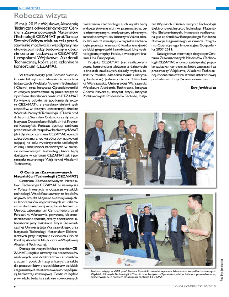 AKTUALNOŚCI Robocza wizyta W trakcie wizyty prof.T.omasz Skotnicki zwiedził wybrane laboratoria zespołów badawczych Wydziału Nowych Technologii i Chemii oraz Instytutu Optoelektroniki, w których prowadzone są prace związane z proilem działalności centrum CEZAMAT. Po wizycie odbyło się spotkanie dyrektora CEZAMAT-u z przedstawicielami tych zespołów, w których uczestniczyli dziekan Wydziału Nowych Technologii i Chemii prof. dr hab. inż. Stanisław Cudziło oraz dyrektor Instytutu Optoelektroniki płk dr inż. Krzysztof Kopczyński. Podczas dyskusji zarówno przedstawiciele zespołów badawczych WAT, jak i dyrektor centrum CEZAMAT, wyrazili zdecydowaną chęć współpracy naukowej, mającej na celu wykorzystanie unikalnych w kraju możliwości badawczych w zakresie nowoczesnych technologii, które będą dostępne w centrum CEZAMAT, jak i potencjału naukowego Wojskowej Akademii Technicznej. O Centrum Zaawansowanych Materiałów i Technologii (CEZAMAT) Centrum Zaawansowanych Materiałów i Technologii CEZAMAT to największa w Polsce inwestycja w obszarze wysokich technologii.Współinansowany ze środków unijnych projekt obejmuje budowę kompleksu laboratoriów wyposażonych w unikatowe w skali światowej urządzenia badawcze. Oprócz Laboratorium Centralnego przy ul. Poleczki w Warszawie, powstaną lub zmodernizowane zostaną cztery dodatkowe laboratoria: przy Instytucie Fizyki Doświadczalnej Uniwersytetu Warszawskiego, przy Instytucie Technologii Materiałów Elektronicznych, przy Instytucie Wysokich Ciśnień Polskiej Akademii Nauk oraz w Wojskowej Akademii Technicznej. Dostęp do wszystkich laboratoriów CEZAMAT-u będzie otwarty dla pracowników naukowych oraz doktorantów i studentów z uczelni polskich i zagranicznych, a także dla pracowników przedsiębiorstw polskich i zagranicznych zainteresowanych współpracą badawczą i rozwojową. Centrum będzie prowadziło badania z zakresu nowoczesnych 6 materiałów i technologii, a ich wyniki będą wykorzystywane m.in. w przemysłachs: teleinformatycznym, medycznym, obronnym, samochodowym czy lotniczym.Warta około 385 mln zł inwestycja w wysokie technologie pomoże wzmocnić konkurencyjność polskiej gospodarki i zmniejszyć lukę technologiczną między Polską, a wiodącymi krajami Unii Europejskiej. Projekt CEZAMAT jest realizowany przez konsorcjum złożone z dziewięciu jednostek naukowych (szkoły wyższe, instytuty Polskiej Akademii Nauk i instytuty badawcze). Jednostki te to: Politechnika Warszawska, Uniwersytet Warszawski, Wojskowa Akademia Techniczna, Instytut Chemii Fizycznej, Instytut Fizyki, Instytut Podstawowych Problemów Techniki, Insty- tut Wysokich Ciśnień, Instytut Technologii Elektronowej, Instytut Technologii Materiałów Elektronicznych. Inwestycja realizowana jest ze środków Europejskiego Funduszu Rozwoju Regionalnego w ramach Programu Operacyjnego Innowacyjna Gospodarka 2007-2013. Szczegółowe informacje dotyczące Centrum Zaawansowanych Materiałów i Technologii CEZAMAT, w tym przedsięwzięć popularyzujących centrum, na które zapraszani są pracownicy Wojskowej Akademii Technicznej, można znaleźć na stronie internetowej pod adresem http://www.cezamat.eu/. Ewa Jankiewicz Podczas wizyty w WAT prof. Tomasz Skotnicki zwiedził wybrane laboratoria zespołów badawczych Wydziału Nowych Technologii i Chemii oraz Instytutu Optoelektroniki, w których prowadzone są prace związane z proilem działalności centrum CEZAMAT GŁOS AKADEMICKI 05/2015 Fot. Ewa Jankiewicz 15 maja 2015 r.Wojskową Akademię Techniczną odwiedził dyrektor Centrum Zaawansowanych Materiałów i Technologii CEZAMAT prof.Tomasz Skotnicki.Wizyta miała na celu przedstawienie możliwości współpracy naukowej pomiędzy budowanym obecnie centrum badawczym CEZAMAT i zespołami Wojskowej Akademii Technicznej, która jest członkiem konsorcjum CEZAMAT.