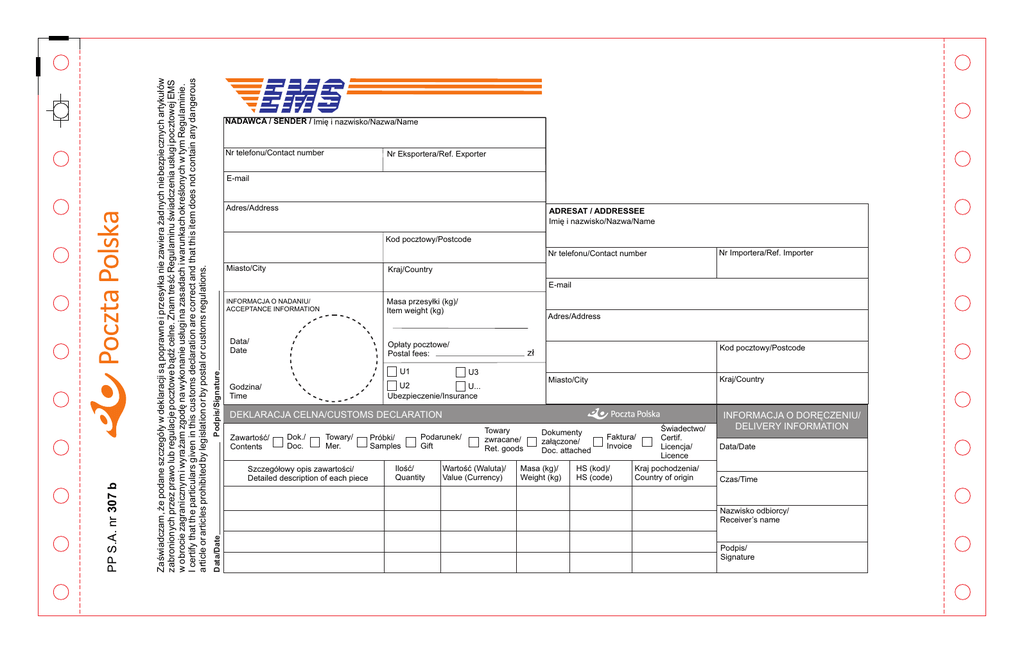 Nr telefonu/Contact number Nr Eksportera/Ref. Exporter E-mail Adres/Address ADRESAT / ADDRESSEE Imię i nazwisko/Nazwa/Name Kod pocztowy/Postcode Nr Importera/Ref. Importer Nr telefonu/Contact number Miasto/City Kraj/Country INFORMACJA O NADANIU/ ACCEPTANCE INFORMATION Masa przesyłki (kg)/ Item weight (kg) Podpis/Signature E-mail Adres/Address Data/ Date Opłaty pocztowe/ Postal fees: Godzina/ Time U2 U... Ubezpieczenie/Insurance U1 Kod pocztowy/Postcode U3 Kraj/Country Miasto/City DEKLARACJA CELNA/CUSTOMS DECLARATION Zawartość/ Contents Dok./ Doc. Towary/ Mer. Szczegółowy opis zawartości/ Detailed description of each piece Próbki/ Samples Podarunek/ Gift Ilość/ Quantity Towary zwracane/ Ret. goods Wartość (Waluta)/ Value (Currency) Dokumenty załączone/ Doc. attached Masa (kg)/ Weight (kg) Faktura/ Invoice HS (kod)/ HS (code) Świadectwo/ Certif. Licencja/ Licence Kraj pochodzenia/ Country of origin INFORMACJA O DORĘCZENIU/ DELIVERY INFORMATION Data/Date Czas/Time Nazwisko odbiorcy/ Receiver’s name Data/Date Zaświadczam, że podane szczegóły w deklaracji są poprawne i przesyłka nie zawiera żadnych niebezpiecznych artykułów zabronionych przez prawo lub regulacje pocztowe bądź celne. Znam treść Regulaminu świadczenia usługi pocztowej EMS w obrocie zagranicznym i wyrażam zgodę na wykonanie usługi na zasadach i warunkach określonych w tym Regulaminie. I certify that the particulars given in this customs declaration are correct and that this item does not contain any dangerous article or articles prohibited by legislation or by postal or customs regulations. PP S.A. nr 307 b NADAWCA / SENDER / Imię i nazwisko/Nazwa/Name Podpis/ Signature Nr telefonu/Contact number Nr Eksportera/Ref. Exporter E-mail Adres/Address ADRESAT / ADDRESSEE Imię i nazwisko/Nazwa/Name Kod pocztowy/Postcode Miasto/City Kraj/Country INFORMACJA O NADANIU/ ACCEPTANCE INFORMATION Masa przesyłki (kg)/ Item weight (kg) Podpis/Signature E-mail Adres/Address Data/ Date Opłaty pocztowe/ Postal fees: Godzina/ Time U2 U... Ubezpieczenie/Insurance U1 Kod pocztowy/Postcode U3 Kraj/Country Miasto/City DEKLARACJA CELNA/CUSTOMS DECLARATION Zawartość/ Contents Dok./ Doc. Towary/ Mer. Szczegółowy opis zawartości/ Detailed description of each piece Próbki/ Samples Podarunek/ Gift Ilość/ Quantity Towary zwracane/ Ret. goods Wartość (Waluta)/ Value (Currency) Dokumenty załączone/ Doc. attached Masa (kg)/ Weight (kg) Faktura/ Invoice HS (kod)/ HS (code) Świadectwo/ Certif. Licencja/ Licence Kraj pochodzenia/ Country of origin DOWÓD NADANIA/ PROOF OF SHIPMENT NADAWCA / SENDER Nr Importera/Ref. Importer Nr telefonu/Contact number Data/Date Zaświadczam, że podane szczegóły w deklaracji są poprawne i przesyłka nie zawiera żadnych niebezpiecznych artykułów zabronionych przez prawo lub regulacje pocztowe bądź celne. Znam treść Regulaminu świadczenia usługi pocztowej EMS w obrocie zagranicznym i wyrażam zgodę na wykonanie usługi na zasadach i warunkach określonych w tym Regulaminie. I certify that the particulars given in this customs declaration are correct and that this item does not contain any dangerous article or articles prohibited by legislation or by postal or customs regulations. NADAWCA / SENDER / Imię i nazwisko/Nazwa/Name . pocztowej W przypadku opóźnienia w doręczeniu przesyłki ‚,Document Pack'' lub przesyłki EMS o masie do 0,5 kg zawierającej wyłącznie dokumenty lub korespondencję, klient nadający ją w Polsce ma prawo do zwrotu różnicy między uiszczoną opłatą netto za przesyłkę EMS a opłatą, jaką zapłaciłby za wysyłaną do tego samego kraju priorytetową przesyłkę poleconą o tej samej masie. W przypadku opóźnienia w doręczeniu przesyłki EMS innej niż wymieniona wyżej, klient nadający ją w Polsce ma prawo do zwrotu różnicy między uiszczoną opłatą netto za przesyłkę EMS a opłatą, jaką zapłaciłby za wysyłaną do tego samego kraju paczkę priorytetową o tej samej masie. W przypadku gdy Poczta Polska S.A. nie przyjmuje paczek priorytetowych do danego kraju lub terytorium, przy obliczaniu kwoty, jaka winna być zwrócona nadawcy opóźnionej przesyłki EMS, przyjmuje się opłatę, jaką zapłaciłby klient za nadanie paczki priorytetowej do danej strefy (na dany kontynent), do której zaliczony został ten kraj lub to terytorium. 1. dla przesyłek EMS z zawartością dokumentów: 30 DTS (SDR) za jedną przesyłkę; 2. dla przesyłek.EMS z zawartością towarów: a. o masie do 5 kg - 44,10 DTS (SDR) za jedną przesyłkę; b. o masie ponad 5 do l0 kg - 65,34 DTS (SDR) za jedną przesyłkę; c. o masie ponad 10 do 15 kg - 88,21 DTS (SDR) za jedną przesyłkę; d. o masie ponad 15 do 20 kg - 111,07 DTS (SDR) za jedną przesyłkę. Klient nadający przesyłkę EMS w Polsce ma prawo do odszkodowania odpowiadającego wysokości rzeczywistej straty poniesionej wskutek zaginięcia, ograbienia lub uszkodzenia przesyłki. W żadnym jednak przypadku odszkodowanie nie może być wyższe od niżej podanych kwot: Nr Eksportera/Ref. Exporter E-mail Adres/Address ADRESAT / ADDRESSEE Imię i nazwisko/Nazwa/Name Kod pocztowy/Postcode Nr Importera/Ref. Importer Nr telefonu/Contact number Miasto/City Kraj/Country INFORMACJA O NADANIU/ ACCEPTANCE INFORMATION Masa przesyłki (kg)/ Item weight (kg) Podpis/Signature E-mail Adres/Address Data/ Date Opłaty pocztowe/ Postal fees: Godzina/ Time U2 U... Ubezpieczenie/Insurance U1 Kod pocztowy/Postcode U3 Kraj/Country Miasto/City DEKLARACJA CELNA/CUSTOMS DECLARATION Zawartość/ Contents Dok./ Doc. Towary/ Mer. Szczegółowy opis zawartości/ Detailed description of each piece Próbki/ Samples Podarunek/ Gift Ilość/ Quantity Towary zwracane/ Ret. goods Wartość (Waluta)/ Value (Currency) Dokumenty załączone/ Doc. attached Masa (kg)/ Weight (kg) Faktura/ Invoice HS (kod)/ HS (code) Świadectwo/ Certif. Licencja/ Licence Kraj pochodzenia/ Country of origin FORMA PŁATNOŚCI/ FORM OF PAYMENT go