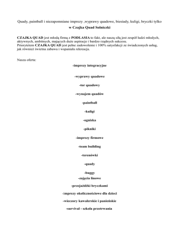 Quady, paintball i niezapomniane imprezy ,wyprawy quadowe, biesiady, kuligi, bryczki tylko w Czajka Quad Solniczki CZAJKA QUAD jest młodą firmą z PODLASIA to fakt, ale naszą siłą jest zespół ludzi młodych, aktywnych, ambitnych, mających duże aspiracje i bardzo rządnych sukcesu. Priorytetem CZAJKA QUAD jest pełne zadowolenie i 100% satysfakcji ze świadczonych usług, jak również świetna zabawa i wspaniała rekreacja. Nasza oferta: -imprezy integracyjne -wyprawy quadowe -tor quadowy -wynajem quadów -paintball -kuligi -ogniska -pikniki -imprezy firmowe -team building -terenówki -quady -buggy -zajęcia linowe -przejażdżki bryczkami -imprezy okolicznościowe dla dzieci -wieczory kawalerskie i panieńskie -survival - szkoła przetrwania -szkolenia militarne i medyczne Nic nie łączy ludzi bardziej od wspólnych wartości. Nic silniej nie kształtuje wartości od zdobywanych doświadczeń. Nic trwalej nie spaja doświadczeń od niezapomnianych przeżyć. Dlaczego warto skorzystać z usług firmy CZAJKA QUAD -pierwszym i głównym atutem firmy CZAJKA QUAD jest super lokalizacja, miejscowość SOLNICZKI -to tylko cztery kilometry za Giełdą Samochodową, a trzy minuty jazdy autem od granicy miasta BIAŁYSTOK -drugim atutem firmy CZAJKA QUAD to teren do państwa dyspozycji, czyli pięć hektarów placu plus pięć hektarów lasu w tym dwa hektary lasu z bagnem. To nie lada gratka dla amatorów i nie tylko wszelkiego rodzaju PRZEPRAWÓWEK, WSZĘDOŁAZÓW, CZTEROKOŁOWCÓW, TERENÓWEK, BUGGY i oczywiście ATV czyli QUADÓW i bardzo atrakcyjny teren do przeprowadzania wszelkiego rodzaju gier i zabaw w PAINTBALL-a, jak również doskonałe miejsce na SURVIVAL czyli SZKOŁE PRZETRWANIA i extra miejsce na IMPREZY FIRMOWE, wszelkiego rodzaju PIKNIKI, OGNISKA, WIECZORY KAWALERSKIE , PANIEŃSKIE i IMPREZY INTEGRACYJNE. Na tak dużym terenie zorganizować można bardzo dużo! -trzecim atutem firmy CZAJKA QUAD jest nasza baza czyli dom z bala, oświetlony, nagłośniony z wodą i wc w pobliżu, mogący pomieścić ok sześćdziesięciu osób plus cztery ogromne parasole z ławeczkami i stołami, mogące pomieścić kolejne czterdzieści osób oraz sklepik z mini barem dla osób indywidualnych -czwartym atutem firmy CZAJKA QUAD to własny profesjonalnie przygotowany TOR QUADOWY dla dorosłych o długości 1,5 km. plus specjalnie przygotowany prawdopodobnie pierwszy na PODLASIU TOR QUADOWY DLA DZIECI. Dla najmniejszych naszych pociech do ZABAWY mamy między innymi: PLAC ZABAW drewniany, TRAMPOLINĘ, BOISKO DO SIATKÓWKI, BADMINTONA, KOSZYKÓWKI mini BOISKO DO PIŁKI NOŻNEJ i wiele INNYCH ATRAKCJI. -piątym atutem firmy CZAJKA QUAD to położenie SOLNICZEK, gdzie wokoło znajdują się przepiękne i malownicze tereny leśne, idealnie nadające się na WYPRAWY QUADOWE jak również na PRZEJAŻDŻKI BRYCZKAMI, a w okresie zimowym na jakże popularne na PODLASIU KULIGI i zdobywające coraz większą popularność SKUTERY ŚNIEŻNE. Gwarantujemy Państwu niezapomniane widoki i wrażenia z jazdy naszymi HONDAMI -szósty atut firmy CZAJKA QUAD jest jeszcze na etapie realizacji i jesteśmy przekonani, że będzie to nasz główny atut i HIT firmowy, ale o tym napiszemy wkrótce i na pewno nasi klienci o tym bardzo szybko się dowiedzą. UWAGA! (tylko osoby indywidualne) CZAJKA QUAD ma tor quadowy otwarty dla osób indywidualnych latem od pn.-pt. Od 17.00 do 19.00( proszę dzwonić potwierdzając chęć przybycia tel. 501 612 501) jesień, zima,wiosna tor quadowy będzie otwarty tylko i wyłącznie po telefonicznej rezerwacji Latem sb.-ndz. i święta od 10.00 do 19.00 jesień, zima, wiosna (jak wyżej) W tygodniu możliwość wcześniejszego otwarcia toru, tylko i wyłącznie dla większej ilości osób i wcześniejszej rezerwacji (min. dzień wcześniej proszę o kontakt) Solniczki /k Białegostoku (4km za Giełdą Samochodową) http://mapa.targeo.pl/Solniczki,20,781663,585749?l=60851117ce518248 GPS position: 53.0357°N, 23.1216°E CZAJKA QUAD to firma jakich mało, gdzie bardzo dużo będzie się działo! +48 501 612 501 lub +48 505 50 50 90 POZDRAWIAMY i SERDECZNIE ZAPRASZAMY osoby indywidualne, grupy zorganizowane i FIRMY