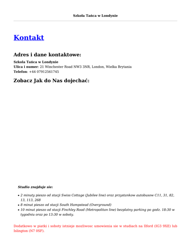 Szkoła Tańca w Londynie Kontakt Adres i dane kontaktowe: Szkola Tańca w Londynie Ulica i numer: 21 Winchester Road NW3 3NR, London, Wielka Brytania Telefon: +44 07912561745 Zobacz Jak do Nas dojechać: Studio znajduje sie: ■ ■ ■ 2 minuty pieszo od stacji Swiss Cottage (Jubilee line) oraz przystankow autobusow C11, 31, 82, 13, 113, 268 8 minut pieszo od stacji South Hampstead (Overground) 10 minut pieszo od stacji Finchley Road (Metropolitan line) bezplatny parking po godz. 18:30 w tygodniu oraz po 13:30 w soboty. Dodatkowo w piatki i soboty istnieje mozliwosc umowienia sie w studiach na Ilford (IG3 9XE) lub Islington (N7 0SF). Po wiecej informacji prosimy o kontakt telefoniczny lub za pośrednictwem poniższego formularza. Skontaktuj się z nami: Imię i nazwisko (wymagane) Adres email (wymagane) Temat Treść wiadomości Wyślij