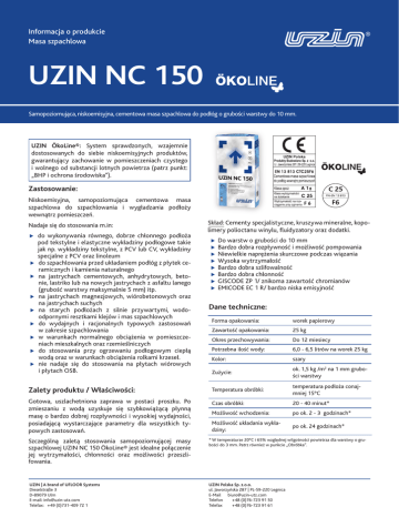 Informacja o produkcie Masa szpachlowa UZIN NC 150 Samopoziomująca, niskoemisyjna, cementowa masa szpachlowa do podłóg o grubości warstwy do 10 mm. UZIN ÖkoLine®: System sprawdzonych, wzajemnie dostosowanych do siebie niskoemisyjnych produktów, gwarantujący zachowanie w pomieszczeniach czystego i wolnego od substancji lotnych powietrza (patrz punkt: „BHP i ochrona środowiska”). Zastosowanie: Niskoemisyjna, samopoziomująca cementowa masa szpachlowa do szpachlowania i wygładzania podłoży wewnątrz pomieszczeń. Nadaje się do stosowania m.in: ÷ ÷ ÷ ÷ ÷ do wykonywania równego, dobrze chłonnego podłoża pod tekstylne i elastyczne wykładziny podłogowe takie jak np. wykładziny tekstylne, z PCV lub CV, wykładziny specjalne z PCV oraz linoleum do szpachlowania przed układaniem podłóg z płytek ceramicznych i kamienia naturalnego na jastrychach cementowych, anhydrytowych, betonie, lastriko lub na nowych jastrychach z asfaltu lanego (grubość warstwy maksymalnie 5 mm) itp. na jastrychach magnezjowych, wiórobetonowych oraz na jastrychach suchych na starych podłożach z silnie przywartymi, wodoodpornymi resztkami klejów i mas szpachlowych do wydajnych i racjonalnych typowych zastosowań w zakresie szpachlowania w warunkach normalnego obciążenia w pomieszczeniach mieszkalnych oraz rzemieślniczych do stosowania przy ogrzewaniu podłogowym ciepłą wodą oraz w warunkach obciążenia rolkami krzeseł. nie nadaje się do stosowania na płytach wiórowych i płytach OSB. Skład: Cementy specjalistyczne, kruszywa mineralne, kopolimery polioctanu winylu, fluidyzatory oraz dodatki. Do warstw o grubości do 10 mm Bardzo dobra rozpływność i możliwość pompowania ÷ Niewielkie naprężenia skurczowe podczas wiązania ÷ Wysoka wytrzymałość ÷ Bardzo dobra szlifowalność ÷ Bardzo dobra chłonność ÷ GISCODE ZP 1/ znikoma zawartość chromianów ÷ EMICODE EC 1 R/ bardzo niska emisyjność ÷ ÷ Dane techniczne: Forma opakowania: worek papierowy Zawartość opakowania: 25 kg Okres przechowywania: Do 12 miesiecy Potrzebna ilość wody: 6,0 - 6,5 litrów na worek 25 kg Kolor: szary Zużycie: ok. 1,5 kg /m2 na 1 mm grubości warstwy Zalety produktu / Właściwości: Temperatura obróbki: temperatura podłoża conajmniej 15°C Gotowa, uszlachetniona zaprawa w postaci proszku. Po zmieszaniu z wodą uzyskuje się szybkowiążącą płynną masę o bardzo dobrej rozpływności i wysokiej wydajności, posiadającą wystarczające parametry dla wszystkich typowych zastosowań. Czas obróbki: 20 - 40 minut* Możliwość wchodzenia: po ok. 2 - 3 godzinach* Możliwość układania wykładziny: po ok. 24 godzinach* ÷ ÷ ÷ ÷ Szczególną zaletą stosowania samopoziomującej masy szpachlowej UZIN NC 150 ÖkoLine® jest idealne połączenie jej wytrzymałości, chłonności oraz możliwości przeszlifowania. * W temperaturze 20°C i 65% względnej wilgotności powietrza dla warstwy o grubości do 3 mm. Patrz również w punkcie „Obróbka”. UZIN | A brand of UFLOOR Systems Dieselstraße 3 D-89079 Ulm E-mail: [email protected] Telefax: +49 (0)731-409 72 1 UZIN Polska Sp. z.o.o. ul. Jaworzyńska 287 | PL-59-220 Legnica E-Mail [email protected] Telefon +48 (0)76-723 91 50 Telefax +48 (0)76-723 91 61 UZIN NC 150 Przygotowanie podło¿a: Wa¿ne wskazówki: Podłoże musi być mocne i stabilne, bez spękań, suche, czyste i wolne od substancji mogących zmniejszać przyczepność. Jastrychy cementowe oraz anhydrytowe należy przeszlifować i odkurzyć. Czynność tę powinna wykonać albo firma układająca jastrych w ramach dodatkowo płatnej obróbki powykonawczej lub firma układająca podłogę jako płatną usługę dodatkową. Podłoże należy sprawdzić w oparciu o obowiązujące normy i odpowiednie instrukcje. W razie stwierdzenia odchyleń należy zgłosić zastrzeżenia. Warstwy niestabilne lub zmniejszające przyczepność należy usunąć poprzez szczotkowanie, szlifowanie, frezowanie lub śrutowanie. Należy dokładnie usunąć odspojone fragmenty oraz pył. Tak przygotowane podłoże należy w zależności od jego rodzaju zagruntować właściwym środkiem gruntującym z palety produktów UZIN. Zagruntowane podłoże pozostawić do wyschnięcia. Dwuskładnikowe grunty na bazie żywic, jak np. dwuskładnikowy grunt uszczelniający UZIN PE 460 należy zawsze piaskować. W wypadku wspólnego stosowania różnych produktów należy stosować się do informacji i uwag zamieszczonych w danych o produkcie użytych produktów. ÷ ÷ ÷ ÷ ÷ ÷ ÷ Obróbka: 1. 6,0 – 6,5 litra zimniej, czystej wody wlać do czystego na- czynia. Zawartość worka (25 kg) wsypywać do wody ciągle mieszając aż do uzyskania zawiesisto-płynnej masy wolnej od grudek. Należy stosować odpowiednie mieszadła do mas szpachlowych (np. firmy UZIN). Mieszanina nie może być zbyt rzadka. 2.Wylać masę na zagruntowane podłoże i równomiernie rozprowadzić za pomocą gładkiej kielni lub odpowiedniej rakli firmy UZIN do dużych powierzchni. Przy grubszych warstwach, wzgl. w wypadku stosowania rakli, można poprawić rozpływanie się masy oraz jakość powierzchni walcując ją przy pomocy kolczastego wałka odpowietrzającego UZIN. W miarę możliwości należy nanosić wymaganą grubość warstwy w ramach jednego cyklu roboczego. Pod obciążenia krzesłami na rolkach wymagana jest grubość warstwy co najmniej 1 mm. Na podłożach niechłonnych należy nanosić warstwę szpachli o grubości 2 – 3 mm. 3.Czas schnięcia do chwili, gdy możliwe będzie układanie wykładzin tekstylnych, elastycznych oraz podłóg z kamienia naturalnego wynosi ok. 24 godzin przy warstwie o grubości 3 mm*. Czas schnięcia do chwili, gdy możliwe będzie układanie podłóg z płytek ceramicznych wynosi ok. 24 godzin* (maksymalna grubość warstwy 10 mm). Przeszlifowanie za pomocą papieru ściernego o uziarnieniu 30 – 60 poprawia jakość i wygląd powierzchni oraz zwiększa jej chłonność. * W temperatu
