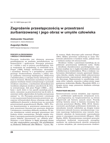Aleksander Hauziński, Augustyn Bańka doi: 10.14691/spia.sps.2.26 Zagrożenie przestępczością w przestrzeni zurbanizowanej i jego obraz w umyśle człowieka Aleksander Hauziński Uniwersytet im. Adama Mickiewicza Augustyn Bańka SWPS Wydział Zamiejscowy w Katowicach PERCEPCJA ŚRODOWISKA I WIEDZA O ŚRODOWISKU Percepcja środowiska jest złożonym procesem przebiegającym na poziomie metabolicznym, informacyjnym i społecznym. Percepcja przestrzeni i wiedza o niej to procesy psychologiczne, które wzajemnie się uzupełniają, co stwierdził m.in. Piaget (1966) badając mechanizmy akomodacji i asymilacji. Procesy te z perspektywy psychologicznego strukturalizmu stanowią z jednej strony podstawę równowagi fizjologicznej, afektywnej i intelektualnej, a z drugiej strony równowagi w relacji ze światem. Mechanizm asymilacji wyraża się poprzez wcielanie świata zewnętrznego w powstałe struktury umysłowe, a mechanizm akomodacji jest wynikiem adaptacji struktur umysłowych do świata zewnętrznego. Jak pisze Piaget (1960) „...działanie i myśl, które w ten sposób asymilują przedmioty, zmuszone są przystosowywać się do nich, tj. zmieniać siebie odpowiednio do każdej zewnętrznej zmiany” (s. 13). Percepcja przestrzeni i orientacja w niej są procesami konstruowania przestrzeni, począwszy od konstrukcji obrazu własnego ciała, jego najbliższych obszarów a skończywszy na szerszych przestrzeniach geograficznych (Bańka, 1997). Proces konstruowania w przestrzeni poznawczej pojęcia przestrzeni fizycznej jest procesem złożonym i związanym z rozwojem zdolności myślenia. W ujęciu rozwojowym rozwój percepcji przestrzeni jest funkcją wieku rozwojowego. Związki między wiekiem a percepcją przestrzeni kształtują się na podstawie efektów „pierwotnych” czy „efektów pola”. Niektóre z tych efektów to błędy percepcji zwane też jako nieprawdziwe percepcje. Ich przykładami są złudzenia Delboeufa albo Müllera – Lyera, błę- 26 dy wzorca, błędy dotyczące pola centracji (Piaget, 1991). Efekty pierwotne zachowują te same właściwości jakościowe w każdym wieku, jednak wraz z wiekiem maleje ich intensywność. Struktury wiedzy o przestrzeni kształtują się na podstawie przestrzennej mobilności osoby. Osoba o określonej charakterystyce psychologicznej i społecznej znajduje się w ciągłej interakcji subiektywnej i obiektywnej ze środowiskiem. Wraz z wiekiem i nabywaniem doświadczeń wzrasta sprawność lokomocyjna dziecka, między innymi dzięki sukcesywnemu skonstruowaniu reprezentacji mentalnych środowiska fizycznego. Reprezentacje te umożliwiając realizację celów i planów, stanowią z jednej strony mapy poznawcze środowiska (Bańka, Hauziński 2003), a z drugiej strony mapy poznawcze działania celowego (Bańka, 2013). PRZESTRZEŃ MIEJSKA Zainteresowania życiem miejskim, jego organizacją i problemami społecznymi związanymi m.in. z przestępczością czy bezpieczeństwem są równie długotrwałe jak historia samych miast. Prawdę mówiąc historia miast to historia tworzenia bezpiecznej przestrzeni (Bańka, 2002, 2013). Zainteresowanie psychologii problemami środowiska zamieszkania wzrosło radykalnie po drugiej wojnie światowej wskutek kryzysu mieszkaniowego i rozwoju masowego budownictwa oraz wzrostu świadomości odnośnie do konieczności wprowadzenia zmian w otaczającej rzeczywistości (Huguet, 1983; Banka, 2003). Dynamicznemu rozwojowi procesów urbanizacji środowisk towarzyszyło szczególne nasilenie się niekorzystnych zjawisk związanych z życiem miejskim, jak zanieczyszczenie środowi- Zagrożenie przestępczością w przestrzeni zurbanizowanej i jego obraz... ska, wzrost bezrobocia i przestępczości, nasilenie bezdomności i wreszcie przestępczość. Potrzeba przeciwstawienie się owym niekorzystnym zjawiskom obniżającym jakość życia zrodziła silne nurty teoretyczno-badawcze, a w szczególności nurt środowiskowy i ekologiczny (Bańka, 2008). Ich przedstawiciele byli zainteresowani badaniem zjawisk w ich naturalnym otoczeniu (Proshansky, 1970) oraz szeroko rozumianą współpracą z reprezentantami innych dyscyplin naukowych (Sanoff, 1997, 2013)). Przykładem stanowiska rozwijającego współpracę psychologów, urbanistów i architektów jest m.in. Kevina Lyncha The Image of the city (1960). Praca Lyncha stanowi moment przełomowy w poszukiwaniu integrującej teorii przestrzeni fizycznej i umysłowej pozwalających na tworzenie praktycznych programów budowania bezpiecznej przestrzeni i zapobiegania przestępczości. Innym przykładem teorii integrującej problem fizycznej przestrzeni i przestrzeni umysłowej jest teoria przestępczości Pyle’a i współpracowników (1974). Ma ona dużą wartość dla psychologów, jak i urbanistów, kryminologów i reprezentantów innych dyscyplin zainteresowanych uwarunkowaniami przestrzennego rozkładu przestępczości w mieście oraz systemowym ujęciem przestępczości umożliwiającym porównanie tego zjawiska na poziomie mikro, mezo i dużej skali. PRZESTRZEŃ MIEJSKA JAKO ŚRODOWISKO ZAMIESZKANIA I ZACHOWANIA Zachowania zawsze wyrażają się w jakiejś przestrzeni. Jeżeli interakcja między zachowaniem a przestrzenią ma trwały i powtarzalny charakter, to wskazuje ona na istnienie wzoru zachowania. W przestrzeniach o stałych bądź zmiennych cechach (Bańka, 2002) typy wzorów zachowania wyznaczane są przez właściwości społeczne i fizykalne przestrzeni oraz przez właściwości jednostki. Z jednej więc strony zachowania są wynikiem interakcji właściwości osoby oraz właściwości środowiska, w którym ona żyje, spostrzega i w stosunku do którego posiada określone postawy, nastawienia i oceny. Z drugiej strony, środowisko wyzwala a niekiedy wymusza zachowania jednostki przez różnorodne wymagania, właściwości, swą organizację i funkcje. W tym ujęciu pojęcie zachowania odnosi się do aktywności jednostki w przestrzeni a pojęcie d