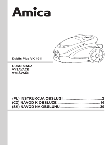 Dublis Plus VK 4011 ODKURZACZ VYSAVAČE VYSÁVAČE (PL) INSTRUKCJA OBSŁUGI......................................2 (CZ) NÁVOD K OBSLUZE..........................................16 (SK) NÁVOD NA OBSLUHU.......................................29 SZANOWNY KLIENCIE, Odkurzacz Amica to połączenie wyjątkowej łatwości obsługi i doskonałej efektywności. Po przeczytaniu niniejszej instrukcji, obsługa odkurzacza nie będzie problemem. Prosimy Państwa o uważną lekturę instrukcji obsługi przed uruchomieniem urządzenia. Przestrzeganie zawartych w niej wskazówek uchroni Państwa przed niewłaściwym użytko waniem. Instrukcję należy zachować i przechowywać tak, aby mieć ją zawsze pod ręką. Należy dokładnie przestrzegać instrukcji obsługi w celu uniknięcia nieszczęśliwych wypadków. Uwaga! Odkurzacz przeznaczony jest wyłącznie do użytku domowego. Producent zastrzega sobie możliwość dokonywania zmian niewpływających na dzia łanie urządzenia. Odkurzacz uruchamiać dopiero po przeczytaniu tej instrukcji Masz wątpliwości? Nie wszystko, co przeczytałeś w instrukcji jest zrozumiałe? - zadzwoń do Centrum Serwisowego, gdzie uzyskasz wszechstronną pomoc. tel.0-801 801 800 2 spis treści Podstawowe informacje.......................................................................................2 Wskazówki dotyczące bezpieczeństwa użytkowania........................................4 Opis wyrobu..........................................................................................................7 Obsługa................................................................................................................10 Czyszczenie i konserwacja...................................................................................11 Dane techniczne..................................................................................................14 Gwarancja, obsługa posprzedażna...................................................................15 3 WSKAZÓWKI DOTYCZĄCE BEZPIECZEŃSTWA UŻYTKOWANIA Uwaga! Aby zminimalizować ryzyko powstania pożaru, porażenia prądem lub uszkodzenia ciała: l Nie pozostawiaj odkurzacza włączonego do prądu. Wyciągaj wtyczkę z gniazdka kiedy nie używasz odkurzacza. l Nie używaj odkurzacza na zewnątrz lub na mokrych powierzchniach. l Nie pozwalaj, aby odkurzacz traktowano jak zabawkę. Szczególna uwaga jest niezbędna, kiedy odkurzacz jest używany przez dzieci lub w pobliżu dzieci. l Używaj odkurzacza tylko tak jak opisano w niniejszej instrukcji. Używaj tylko części wyposażenia zalecane przez producenta. l Nie używaj odkurzacza z uszkodzonym przewodem zasilającym lub wtyczką. Jeżeli odkurzacz nie działa tak jak powinien, został upuszczony, uszkodzony, pozostawiony na świeżym powietrzu lub wpadł do wody, oddaj go do punktu serwisowego. l Nie ciągnij odkurzacza ani nie przenoś go trzymając za przewód, nie używaj przewodu jako uchwytu, nie zamykaj drzwi przytrzaskując przewód i nie przeciągaj przewodu nad ostrymi krawędziami. Uważaj, aby odkurzacz nie przejeżdzał po przewodzie. Trzymaj przewód zasilający z daleka od nagrzanych powierzchni. l Nie wyłączaj odkurzacza ciągnąc za przewód. Aby wyjąć wtyczkę z gnazdka sieciowego, chwytaj za wtyczkę, nie za przewód. l Nie dotykaj wtyczki lub odkurzacza mokrymi rękoma. l Nie wkładaj żadnych przedmiotów w otwory w odkurzaczu. Nie używaj odkurzacza, kiedy jakikolwiek otwór jest zablokowany, pozbywaj się kurzu, kłaczków, włosów i wszystkiego, co może zredukować przepływ powietrza. l Trzymaj włosy, luźne części ubrania, palce i inne części ciała z daleka od otworów i części ruchomych. l Nie używaj odkurzacza do zbierania łatwopalnych substancji, takich jak benzyna i nie używaj go w takich miejscach, gdzie podobne substancje mogą być obecne. l Trzymaj za wtyczkę przy zwijaniu się kabla. Nie pozwól, aby wtyczka była puszczona luzem podczas zwijania. l Nie zbieraj żadnych przedmiotów, które palą się lub dymią, takich jak papierosy, zapałki, lub gorące popioły. l Nie używaj odkurzacza bez założonego worka do kurzu i/lub filtrów. 4 WSKAZÓWKI DOTYCZĄCE BEZPIECZEŃSTWA UŻYTKOWANIA l Jeżeli otwór, który zasysa powietrze,wąż ssący lub rura teleskopowa są zatkane, powinieneś natychmiast wyłączyć odkurzacz. Przed ponownym włączeniem odkurzacza usuń najpierw blokujący przedmiot. l Nie używaj odkurzacza zbyt blisko grzejników, kaloryferów, niedopałków papierosów itp. l Zanim włączysz wtyczkę do gniazdka sieciowego, upewnij się, czy masz suche ręce. l Zanim zaczniesz używać odkurzacz, usuń ostre przedmioty z podłogi, aby uniknąć uszkodzenia worka na kurz. l Nie odkurzaj drobnych pyłów jak: mąka, gips, tonery drukarek itp., gdyż może to doprowadzić do zapchania filtrów i uszkodzenia odkurzacza. l Kiedy chcesz wyłączyć wtyczkę z gniazdka sieciowego, rób to zawsze trzymając za wtyczkę, a nie za przewód elektryczny. l Ten odkurzacz jest wyposażony w zwijacz przewodu przyłączeniowego. l Niniejszy sprzęt nie jest przeznaczony do użytkowania przez osoby (w tym dzieci) o ograniczonej zdolności fizycznej, czuciowej lub psychicznej, lub osoby o braku doświadczenia lub znajomości sprzętu, chyba że odbywa się to pod nadzorem lub zgodnie z instrukcją użytkowania sprzętu, przekazanej przez osoby odpowiadające za ich bezpieczeństwo. Należy zwracać uwagę na dzieci, aby nie bawiły się okurzaczem. Wymagania elektryczne Należy sprawdzić, czy napięcie podane na tabliczce znamionowej odpowiada parametrom zasilania elektrycznego w domu, przy czym zasilanie to musi być oznaczone jako ~ (prąd przemienny). Uwaga! Jeżeli przewód zasilający nieodłączalny ulegnie uszkodzeniu, to powinien on być wymieniony w specjalistycznym zakładzie naprawczym. 5 ROZPAKOWANIE Wycofanie z eksploatacji Urządzenie na czas transportu zostało zabezpieczone przed uszkodzeniem. Po r