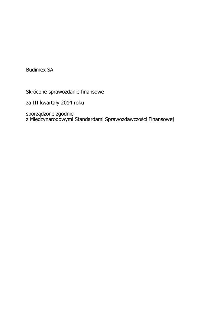 Budimex SA Skrócone sprawozdanie finansowe za III kwartały 2014 roku sporządzone zgodnie z Międzynarodowymi Standardami Sprawozdawczości Finansowej BUDIMEX SA Skrócone sprawozdanie finansowe za III kwartały 2014 roku sporządzone zgodnie z MSSF Sprawozdanie z sytuacji finansowej 30.09.2014 31.12.2013 1.01.2013 (tys. zł) (tys. zł) (tys. zł) 61 070 62 713 84 079 Nieruchomości inwestycyjne 1 836 3 124 3 368 Wartości niematerialne 3 782 2 886 1 210 712 940 712 940 763 401 9 796 9 796 18 596 Aktywa trwałe (długoterminowe) Rzeczowe aktywa trwałe Inwestycje w podmiotach zależnych Inwestycje w podmiotach stowarzyszonych Inne aktywa finansowe 12 421 8 445 21 498 Kaucje z tytułu umów o budowę 32 844 29 813 25 919 Długoterminowe rozliczenia międzyokresowe Aktywa z tytułu odroczonego podatku dochodowego Aktywa trwałe (długoterminowe) ogółem 5 400 4 392 4 096 329 829 320 564 293 757 1 169 918 1 154 673 1 215 924 80 105 84 850 118 793 696 381 461 292 332 423 Aktywa obrotowe (krótkoterminowe) Zapasy Należności z tytułu dostaw i usług oraz pozostałe należności Kaucje z tytułu umów o budowę Kwoty należne od obiorców z tytułu umów o budowę Należności z tytułu bieżącego podatku dochodowego Pochodne instrumenty finansowe Inwestycje w jednostkach podporządkowanych 18 388 29 850 67 211 322 990 137 441 222 889 - - 651 477 29 1 460 - 238 600 - 15 705 3 164 - 883 260 1 112 254 1 038 436 10 434 12 820 8 255 Aktywa obrotowe (krótkoterminowe) ogółem 2 027 740 2 080 300 1 790 118 SUMA AKTYWÓW 3 197 658 3 234 973 3 006 042 Inne aktywa finansowe Środki pieniężne i ich ekwiwalenty Krótkoterminowe rozliczenia międzyokresowe Warszawa, 29 października 2014 roku Komisja Nadzoru Finansowego 1 BUDIMEX SA Skrócone sprawozdanie finansowe za III kwartały 2014 roku sporządzone zgodnie z MSSF 30.09.2014 31.12.2013 1.01.2013 (tys. zł) (tys. zł) (tys. zł) Kapitał własny Kapitał podstawowy 145 848 145 848 145 848 Nadwyżka ze sprzedaży akcji powyżej ich wartości nominalnej 80 199 80 199 227 835 Pozostałe kapitały rezerwowe 59 869 58 867 56 899 5 486 5 486 5 492 99 198 297 435 (42 573) 390 600 587 835 393 501 Różnice kursowe z przeliczenia oddziałów zagranicznych Zyski/ (straty) zatrzymane Kapitał własny ogółem Zobowiązania Zobowiązania długoterminowe Kredyty, pożyczki i inne zewnętrzne źródła finansowania 12 630 17 044 27 740 Kaucje z tytułu umów o budowę 156 570 152 294 155 387 Rezerwy na zobowiązania długoterminowe i inne obciążenia 156 031 125 307 113 930 Zobowiązania z tytułu świadczeń emerytalnych i podobnych 3 264 3 264 2 542 328 495 297 909 299 599 19 601 18 165 17 695 Zobowiązania długoterminowe ogółem Zobowiązania krótkoterminowe Kredyty, pożyczki i inne zewnętrzne źródła finansowania Zobowiązania z tytułu dostaw i usług oraz pozostałe zobowiązania 1 158 139 1 115 719 1 202 122 Kaucje z tytułu umów o budowę 188 721 179 697 218 454 Kwoty należne odbiorcom z tytułu umów o budowę 716 957 688 159 549 447 90 538 59 346 55 341 103 257 115 746 106 757 9 565 15 478 - Zobowiązania z tytułu świadczeń emerytalnych i podobnych 879 879 741 Pochodne instrumenty finansowe 216 440 243 185 747 150 194 156 005 4 943 5 406 6 137 Zobowiązania krótkoterminowe ogółem 2 478 563 2 349 229 2 312 942 Zobowiązania ogółem 2 807 058 2 647 138 2 612 541 SUMA KAPITAŁU WŁASNEGO I ZOBOWIĄZAŃ 3 197 658 3 234 973 3 006 042 Otrzymane zaliczki Rezerwy na zobowiązania krótkoterminowe i inne obciążenia Zobowiązania z tytułu bieżącego podatku dochodowego Krótkoterminowe rozliczenia międzyokresowe kosztów Krótkoterminowe rozliczenia międzyokresowe przychodów Warszawa, 29 października 2014 roku Komisja Nadzoru Finansowego 2 BUDIMEX SA Skrócone sprawozdanie finansowe za III kwartały 2014 roku sporządzone zgodnie z MSSF Rachunek zysków i strat Okres 9 miesięcy zakończony Okres 3 miesięcy zakończony Okres 9 miesięcy zakończony 30 września 2014 roku (tys. zł) Okres 3 miesięcy zakończony 30 września 2013 roku (tys. zł) (tys. zł) (tys. zł) 3 383 116 1 503 123 2 903 010 1 189 335 (3 133 562) (1 405 006) (2 694 042) (1 107 586) 249 554 98 117 208 968 81 749 Działalność kontynuowana Przychody netto ze sprzedaży produktów i usług oraz towarów i materiałów Koszty sprzedanych produktów i usług oraz towarów i materiałów Zysk brutto ze sprzedaży Koszty sprzedaży Koszty ogólnego zarządu (7 793) (2 625) (7 356) (2 687) (116 383) (38 336) (102 848) (35 658) Pozostałe przychody operacyjne Pozostałe koszty operacyjne 40 235 21 680 23 693 10 005 (27 762) (9 073) (30 487) (14 505) (181) 70 (629) 8 137 670 69 833 91 341 38 912 Zysk (strata) z pochodnych instrumentów finansowych Zysk z działalności operacyjnej Przychody finansowe 17 922 6 004 60 033 4 371 (23 520) (9 106) (16 771) (6 047) 132 072 66 731 134 603 37 236 (27 778) (13 657) (20 498) (7 993) Zysk netto z działalności kontynuowanej 104 294 53 074 114 105 29 243 Zysk netto za okres 104 294 53 074 114 105 29 243 2,08 4,47 1,15 Koszty finansowe Zysk brutto Podatek dochodowy Podstawowy i rozwodniony zysk przypadający akcjonariuszom na akcję (w zł.) 4,09 Warszawa, 29 października 2014 roku Komisja Nadzoru Finansowego 3 BUDIMEX SA Skrócone sprawozdanie finansowe za III kwartały 2014 roku sporządzone zgodnie z MSSF Sprawozdanie z całkowitych dochodów Okres 9 miesięcy zakończony Okres 3 miesięcy zakończony Okres 9 miesięcy zakończony 30 września 2014 roku (tys. zł) Zysk netto wykazany poprzednio 30 września 2013 roku (tys. zł) (tys. zł) (tys. zł) 104 294 53 074 113 059 28 693 - - 1 046 550 104 294 53 074 114 105 29 243 0 9 28 (58) - - - - - - - - - - - - - 9 28 (58) 104 294 53 083 114 133 29 191 Korekty MSSF Zysk netto za okres wg MSSF Okres 3 miesięcy zakończony Inne całkowite dochody, które: Zostaną następnie przeklasyfikowane na zyski lub straty po spełnieniu określonych warunków: Różnice kursowe z wyceny oddz