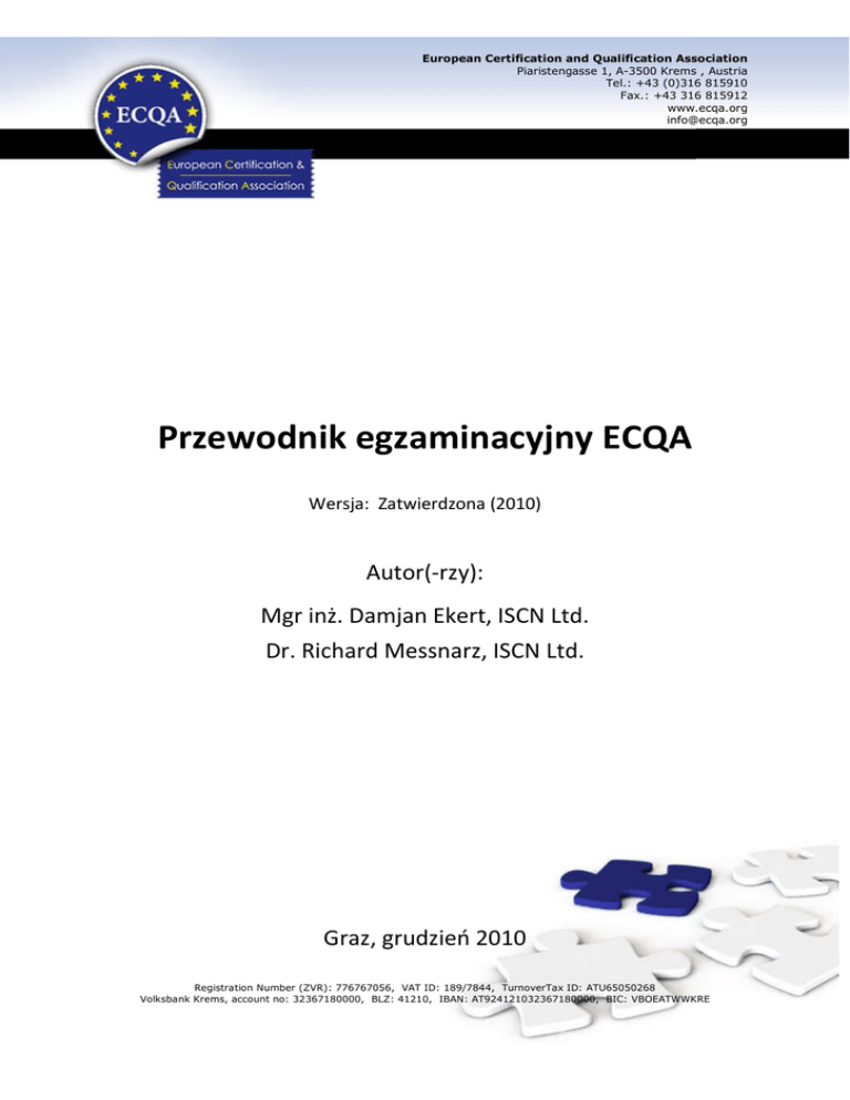European Certification and Qualification Association Piaristengasse 1, A-3500 Krems , Austria Tel.: +43 (0)316 815910 Fax.: +43 316 815912 www.ecqa.org [email protected] Przewodnik egzaminacyjny ECQA Wersja: Zatwierdzona (2010) Autor(-rzy): Mgr inż. Damjan Ekert, ISCN Ltd. Dr. Richard Messnarz, ISCN Ltd. Graz, grudzień 2010 Registration Number (ZVR): 776767056, VAT ID: 189/7844, TurnoverTax ID: ATU65050268 Volksbank Krems, account no: 32367180000, BLZ: 41210, IBAN: AT924121032367180000, BIC: VBOEATWWKRE European Certification and Qualification Association www.ecqa.org Przeprowadzenie Egzaminu 1. Przejdź do: www.ecqa.org 2. Wybierz Certification and Examination – Exam Registration z lewego menu. 3. Jeśli wcześniej się zarejestrowałeś, wystarczy tylko zalogować się jako Uczestnik i przejść do punktu nr 8. 4. Jeśli nie posiadasz jeszcze konta, prosimy kliknąć na Register/Zarejestruj. 5. Najpierw należy wybrać profesję zawodową, na którą chciałbyś się zapisać (na przykład Manager ds. Innowacji) i kliknąć Next/Dalej 6. Wybierz instytucję egzaminacyjną (na przykład ISQI) i kliknij Next/Dalej. 7. Wybierz opcję „I am a new user and would like to create an account”(„Jestem nowym użytkownikiem i chciałbym założyć konto”). 8. …aby zdobyć formularz rejestracji. Prosimy wypełnić formularz w całości i kliknąć Finish/Koniec. Zostaną Państwo przekierowani do Systemu Egzaminacyjnego ECQA. WAŻNE: Prosimy upewnić się, czy wprowadzone dane są poprawne, ponieważ będą one wykorzystywane do dalszego kontaktu z Państwem. Nazwisko i imię (w rubryce “Dane do kontaktu”) pojawią się na certyfikacie. ECQA Exam Guide, Version: Approved (2010) 2 European Certification and Qualification Association www.ecqa.org 9. Po zalogowaniu się do Systemu Egzaminacyjnego ECQA należy wybrać z menu Exam/Egzamin a następnie Perform/Wykonaj. 10. Rozpocznij egzamin klikając na przycisk Start. 11. Zakończ egzamin klikając na przycisk Finisz/Koniec. ECQA Exam Guide, Version: Approved (2010) 3 European Certification and Qualification Association www.ecqa.org Wyświetlenie wyników To display the results select Exam and then Results from the menu: Aby wyświetlić wyniki należy wybrać Exam/Egzamin a następnie Results/Wyniki z menu: Zasady egzaminu 1. Początek i czas trwania egzaminu jest ustanowiony przez instytucję egzaminacyjną. 2. Użytkownik może przystąpić do egzaminu w dowolnym momencie po rozpoczęciu egzaminu i przed jego zakończeniem. 3. Podczas egzaminu uczestnik może logować się i wylogować się z systemu. Odpowiedzi są przechowywane w bazie danych. 4. Jeśli wystąpi przerwa w dostępie do sieci internet (spadnie sygnał zasięgu bezprzewodowego, internet przestanie działać itd.) wyświetli się ostrzeżenie. Użytkownik powinien się wylogować. Gdy połączenie zostanie przywrócone, użytkownik może się zalogować i jest zobowiązany ponownie upewnić się, czy ostatnie odpowiedzi zostały poprawnie zachowane. W przypadku jakichkolwiek problemów należy poinformować osobę nadzorującą przebieg egzaminu. 5. Wyniki egzaminu zostaną podane po zakończeniu egzaminu przez instytucję egzaminacyjną. Jeśli użytkownik ukończy test wcześniej nie będzie mógł zobaczyć wyników. 6. Wyniki będą obliczane i podawane w podziale na element nauczania. 7. Aby zaliczyć dany element nauczania należy zdobyć przynajmniej 66% ogólnej punktacji przypadającej na ten element. 8. Z każdego elementu nauczania zostaje wybranych losowo 10 pytań. 9. Na każde pytanie istnieje przynajmniej jedna prawidłowa odpowiedź. 10. Jeśli uczestnik wybierze nieprawidłową odpowiedź, pytanie jest punktowane liczbą zero (0%) 11. Wszystkie pytania mają jednakową wagę; wyniki obliczane są jako średnia arytmetyczna (suma punktów otrzymanych ze wszystkich pytań na element / liczba pytań przypadających na element). ECQA Exam Guide, Version: Approved (2010) 4 European Certification and Qualification Association www.ecqa.org Kryteria oceny Jeśli uczestnik nie wybrał wszystkich prawidłowych odpowiedzi to nie otrzyma 100% za pytanie lecz: Total number of correct answers in the exam pool 1 2 3 3 4 4 4 Correct answers selected by the user 0 1 1 2 1 2 3 Suma prawidłowych odpowiedzi w puli pytań egzaminacyjnych 1 2 3 3 4 4 4 Prawidłowe odpowiedzi wybrane przez użytkownika 0 1 1 2 1 2 3 ECQA Exam Guide, Version: Approved (2010) Score per question 0% 50% 33% 66% 25% 50% 75% Punktacja za pytanie 0% 50% 33% 66% 25% 50% 75% 5