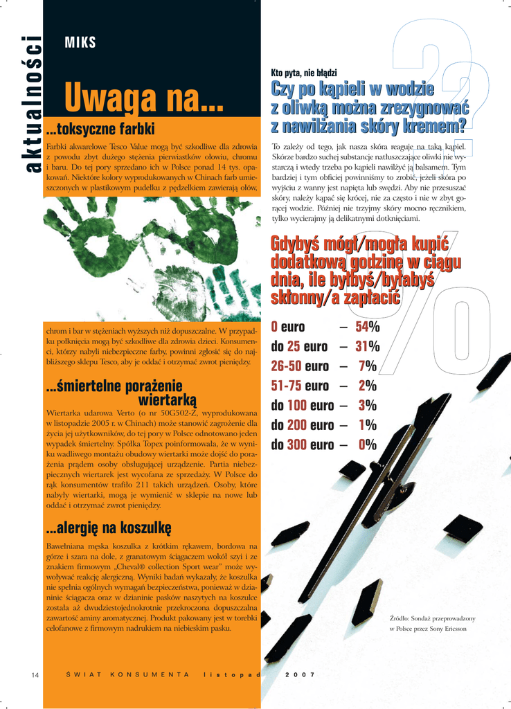 aktualnoÊci MIKS Kto pyta, nie b∏àdzi Uwaga na... ...toksyczne farbki Farbki akwarelowe Tesco Value mogà byç szkodliwe dla zdrowia z powodu zbyt du˝ego st´˝enia pierwiastków o∏owiu, chromu i baru. Do tej pory sprzedano ich w Polsce ponad 14 tys. opakowaƒ. Niektóre kolory wyprodukowanych w Chinach farb umieszczonych w plastikowym pude∏ku z p´dzelkiem zawierajà o∏ów, Czy po kàpieli w wodzie z oliwkà mo˝na zrezygnowaç z nawil˝ania skóry kremem? To zale˝y od tego, jak nasza skóra reaguje na takà kàpiel. Skórze bardzo suchej substancje nat∏uszczajàce oliwki nie wystarczà i wtedy trzeba po kàpieli nawil˝yç jà balsamem. Tym bardziej i tym obficiej powinniÊmy to zrobiç, je˝eli skóra po wyjÊciu z wanny jest napi´ta lub sw´dzi. Aby nie przesuszaç skóry, nale˝y kàpaç si´ krócej, nie za cz´sto i nie w zbyt goràcej wodzie. Póêniej nie trzyjmy skóry mocno r´cznikiem, tylko wycierajmy jà delikatnymi dotkni´ciami. GdybyÊ móg∏/mog∏a kupiç dodatkowà godzin´ w ciàgu dnia, ile by∏byÊ/by∏abyÊ sk∏onny/a zap∏aciç chrom i bar w st´˝eniach wy˝szych ni˝ dopuszczalne. W przypadku po∏kni´cia mogà byç szkodliwe dla zdrowia dzieci. Konsumenci, którzy nabyli niebezpieczne farby, powinni zg∏osiç si´ do najbli˝szego sklepu Tesco, aby je oddaç i otrzymaç zwrot pieni´dzy. ...Êmiertelne pora˝enie wiertarkà Wiertarka udarowa Verto (o nr 50G502-Z, wyprodukowana w listopadzie 2005 r. w Chinach) mo˝e stanowiç zagro˝enie dla ˝ycia jej u˝ytkowników, do tej pory w Polsce odnotowano jeden wypadek Êmiertelny. Spó∏ka Topex poinformowa∏a, ˝e w wyniku wadliwego monta˝u obudowy wiertarki mo˝e dojÊç do pora˝enia pràdem osoby obs∏ugujàcej urzàdzenie. Partia niebezpiecznych wiertarek jest wycofana ze sprzeda˝y. W Polsce do ràk konsumentów trafi∏o 211 takich urzàdzeƒ. Osoby, które naby∏y wiertarki, mogà je wymieniç w sklepie na nowe lub oddaç i otrzymaç zwrot pieni´dzy. 0 euro do 25 euro 26-50 euro 51-75 euro do 100 euro do 200 euro do 300 euro – – – – – – – 54% 31% 7% 2% 3% 1% 0% ...alergi´ na koszulk´ Bawe∏niana m´ska koszulka z krótkim r´kawem, bordowa na górze i szara na dole, z granatowym Êciàgaczem wokó∏ szyi i ze znakiem firmowym „Cheval® collection Sport wear” mo˝e wywo∏ywaç reakcj´ alergicznà. Wyniki badaƒ wykaza∏y, ˝e koszulka nie spe∏nia ogólnych wymagaƒ bezpieczeƒstwa, poniewa˝ w dzianinie Êciàgacza oraz w dzianinie pasków naszytych na koszulce zosta∏a a˝ dwudziestojednokrotnie przekroczona dopuszczalna zawartoÊç aminy aromatycznej. Produkt pakowany jest w torebki celofanowe z firmowym nadrukiem na niebieskim pasku. 14  W I A T K O N S U M E N T A l i s t o p a d èród∏o: Sonda˝ przeprowadzony w Polsce przez Sony Ericsson 2 0 0 7 Niebezpieczne zwiàzki Trucizna z nakr´tki W nakr´tkach do s∏oików mogà znajdowaç si´ niebezpieczne zmi´kczacze. Poniewa˝ rozpuszczajà si´ w t∏uszczach, z ∏atwoÊcià mogà przedostawaç si´ do ˝ywnoÊci przechowywanej w s∏oiku. Te groêne dla zdrowia ludzi substancje mogà znajdowaç si´ w nakr´tkach s∏oików z d˝emami, sosami, gotowymi daniami i innymi produktami sprzedawanymi w s∏oikach. Niemiecka Fundacja Warentest przebada∏a niedawno azjatyckie sosy. SpoÊród 25 testowanych produktów 18 zawiera∏o wysokie st´˝enia zmi´kczaczy. Zwiàzki te sà tym groêniejsze, ˝e nie czuç ich zapachu, smaku, ani nie widaç. Co wi´c robiç, aby zminimalizowaç zagro˝enie? * Przechowywaç s∏oiki z ˝ywnoÊcià w ten sposób, aby te sta∏y i zwracaç uwag´ na to, ˝eby ich zawartoÊç nie mia∏a stycznoÊci z pokrywkà. * Zu˝yç produkt jak najszybciej. * Olej zbierajàcy si´ u góry dania, najlepiej zebraç i wyrzuciç, bo zmi´kczacze przedostajà si´ naj∏atwiej do t∏uszczu. * ˚ywnoÊç ze s∏oików nale˝y jeÊç w ma∏ych iloÊciach, poniewa˝ zmi´kczacze znajdujàce si´ w ró˝nych Êrodkach spo˝ywczych kumulujà si´ w organizmie. * Je˝eli jest taka mo˝liwoÊç, wybierajmy sosy i inne dania nie w s∏oikach, lecz w butelkach czy tubkach. aktualnoÊci MIKS BezsennsoÊç Muzyka na sen Cierpisz na bezsennoÊç? Zamiast leków na sen, warto wypróbowaç nowà metod´ – muzyk´. fot. Dormeo W badaniach przeprowadzonych na Tajwanie wzi´∏o udzia∏ 60 osób w wieku od 60 do 83 lat cierpiàcych na bezsennoÊç, której przyczynà nie by∏o jednak zbyt wysokie spo˝ycie kofeiny, depresja ani choroby Alzheimera czy Parkinsona. Ochotników podzielono na dwie grupy – pierwsza przez 45 minut s∏ucha∏a wygodnie siedzàc muzyki zachodniej, a druga – chiƒskiej, przy czym wszyscy wybrali sobie swoje ulubione utwory. Okaza∏o si´, ˝e z tygodnia na tydzieƒ sen ochotników stawa∏ si´ d∏u˝szy i dawa∏ lepszy wypoczynek. Co wi´cej, muzyka pozytywnie oddzia∏ywa∏a tak˝e na rytm serca i oddech. Kiedy b´dziemy wypróbowywaç t´ metod´, pami´tajmy, ˝e zadzia∏aç mo˝e muzyka wolna – o 60-80 taktach na minut´.  W I A T K O N S U M E N T A l i s t o p a d 2 0 0 7 15