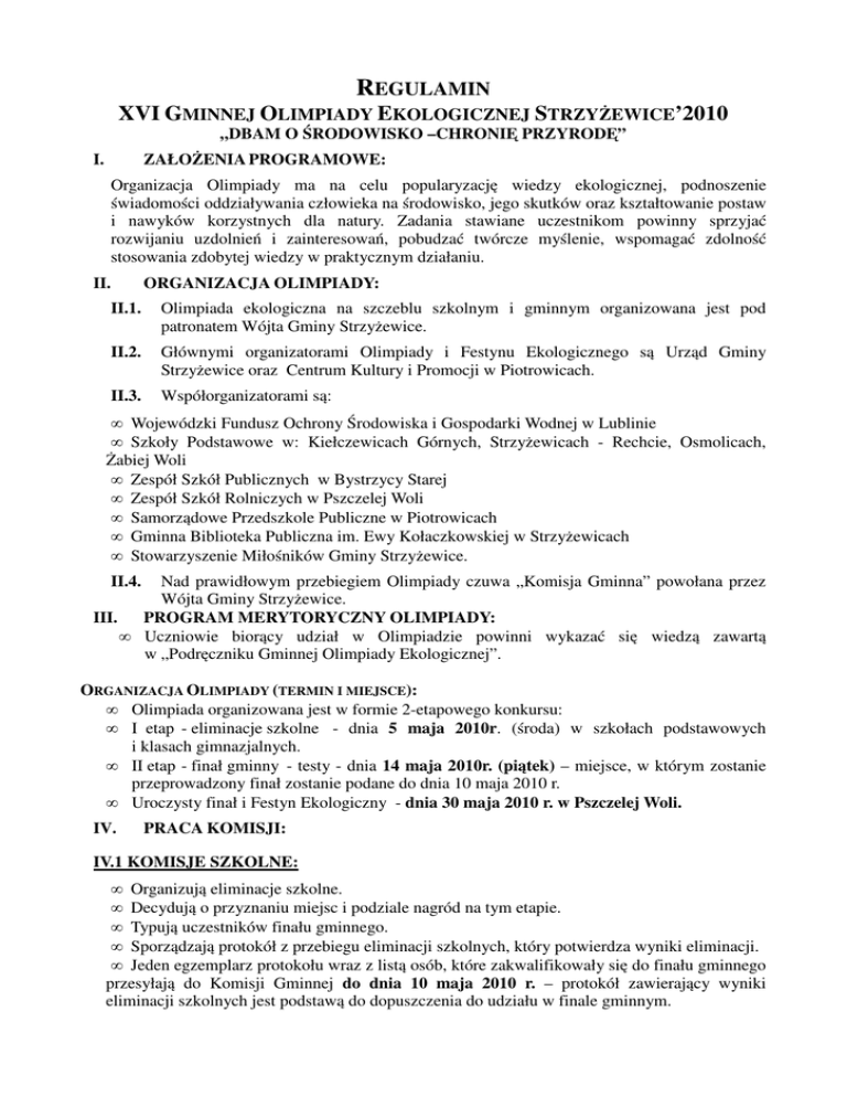 REGULAMIN XVI GMINNEJ OLIMPIADY EKOLOGICZNEJ STRZYŻEWICE’2010 „DBAM O ŚRODOWISKO –CHRONIĘ PRZYRODĘ” I. ZAŁOŻENIA PROGRAMOWE: Organizacja Olimpiady ma na celu popularyzację wiedzy ekologicznej, podnoszenie świadomości oddziaływania człowieka na środowisko, jego skutków oraz kształtowanie postaw i nawyków korzystnych dla natury. Zadania stawiane uczestnikom powinny sprzyjać rozwijaniu uzdolnień i zainteresowań, pobudzać twórcze myślenie, wspomagać zdolność stosowania zdobytej wiedzy w praktycznym działaniu. II. ORGANIZACJA OLIMPIADY: II.1. Olimpiada ekologiczna na szczeblu szkolnym i gminnym organizowana jest pod patronatem Wójta Gminy Strzyżewice. II.2. Głównymi organizatorami Olimpiady i Festynu Ekologicznego są Urząd Gminy Strzyżewice oraz Centrum Kultury i Promocji w Piotrowicach. II.3. Współorganizatorami są: • Wojewódzki Fundusz Ochrony Środowiska i Gospodarki Wodnej w Lublinie • Szkoły Podstawowe w: Kiełczewicach Górnych, Strzyżewicach - Rechcie, Osmolicach, Żabiej Woli • Zespół Szkół Publicznych w Bystrzycy Starej • Zespół Szkół Rolniczych w Pszczelej Woli • Samorządowe Przedszkole Publiczne w Piotrowicach • Gminna Biblioteka Publiczna im. Ewy Kołaczkowskiej w Strzyżewicach • Stowarzyszenie Miłośników Gminy Strzyżewice. II.4. Nad prawidłowym przebiegiem Olimpiady czuwa „Komisja Gminna” powołana przez Wójta Gminy Strzyżewice. III. PROGRAM MERYTORYCZNY OLIMPIADY: • Uczniowie biorący udział w Olimpiadzie powinni wykazać się wiedzą zawartą w „Podręczniku Gminnej Olimpiady Ekologicznej”. ORGANIZACJA OLIMPIADY (TERMIN I MIEJSCE): • Olimpiada organizowana jest w formie 2-etapowego konkursu: • I etap - eliminacje szkolne - dnia 5 maja 2010r. (środa) w szkołach podstawowych i klasach gimnazjalnych. • II etap - finał gminny - testy - dnia 14 maja 2010r. (piątek) – miejsce, w którym zostanie przeprowadzony finał zostanie podane do dnia 10 maja 2010 r. • Uroczysty finał i Festyn Ekologiczny - dnia 30 maja 2010 r. w Pszczelej Woli. IV. PRACA KOMISJI: IV.1 KOMISJE SZKOLNE: • Organizują eliminacje szkolne. • Decydują o przyznaniu miejsc i podziale nagród na tym etapie. • Typują uczestników finału gminnego. • Sporządzają protokół z przebiegu eliminacji szkolnych, który potwierdza wyniki eliminacji. • Jeden egzemplarz protokołu wraz z listą osób, które zakwalifikowały się do finału gminnego przesyłają do Komisji Gminnej do dnia 10 maja 2010 r. – protokół zawierający wyniki eliminacji szkolnych jest podstawą do dopuszczenia do udziału w finale gminnym. • Są odpowiedzialne za rozliczenie finansowe eliminacji szkolnych, które w terminie do dnia 18 maja 2010 r. wraz z protokołem należy złożyć w Urzędzie Gminy Strzyżewice faktury VAT oraz listę osób nagrodzonych wraz potwierdzeniem odbioru nagród. IV.2 KOMISJE GMINNE: • Jej członkami są nauczyciele szkół, które biorą udział w GOE oraz przedstawiciele Urzędu Gminy Strzyżewice. • Czuwają nad prawidłowym przebiegiem Olimpiady. • Organizują finał gminny. • Podczas finału gminnego Komisja Gminna przeprowadza konkursy oraz decyduje o przyznaniu miejsc oraz podziale nagród. • Sporządza protokół, który potwierdza wyniki Olimpiady i jest podstawą do wydania nagród uczestnikom. • Do Komisji Gminnej należy ostateczna interpretacja regulaminu i wyjaśnienie wątpliwości. • Jest odpowiedzialna za rozliczenie finansowe finału gminnego. V. KONKURSY WIEDZOWE: V.1. KONKURS NA „NAJLEPSZEGO EKOLOGA GMINY STRZYŻEWICE” - TEST WIEDZY Z ZAKRESU OCHRONY PRZYRODY, OCHRONY POWIETRZA I GLEBY ORAZ ZAGADNIEŃ DOTYCZĄCYCH MIODU I ROŚLIN MIODODAJNYCH: V.1 ELIMINACJE SZKOLNE: • Uczestnikami testu są wszyscy chętni uczniowie klas IV-VI szkół podstawowych i klas gimnazjalnych. • Ilość uczestników nieograniczona – Komisje Szkolne zgłoszą Komisji Gminnej do dnia 27 kwietnia 2010r. liczbę osób - uczestników eliminacji szkolnych. • Uczniowie klas IV-VI piszą test jednokrotnego wyboru składający się z 30 pytań, czas trwania 30 minut. Za każdą prawidłową odpowiedź można uzyskać 1 punkt. Maksymalna ilość możliwych do uzyskania punktów wynosi 30. • Uczniowie klas gimnazjalnych piszą test wielokrotnego wyboru składający się z 30 pytań, czas trwania 30 minut. Udzielenie odpowiedzi na pytanie, zawarte w teście, polega na wyborze z trzech zaproponowanych odpowiedzi oznaczonych literami : a, b, c wszystkich odpowiedzi prawidłowych. Każde pytanie zawarte w teście posiada jedną, dwie lub trzy odpowiedzi prawidłowe, przy czym jeżeli uczeń nie wybrał dla określonego pytania wszystkich prawidłowych odpowiedzi lub zaznaczył niewłaściwą odpowiedź, to należy uznać, że udzielił na dane pytanie błędnej odpowiedzi. Za każdą prawidłową odpowiedź można uzyskać 1 punkt. Maksymalna ilość możliwych do uzyskania punktów wynosi 30. • Test będzie obejmował zakres wiedzy zawartej w „Podręczniku Gminnej Olimpiady Ekologicznej”. • Testy dostarcza do szkół na 1 dzień przed eliminacjami przedstawiciel Urzędu Gminy Strzyżewice. • Do finału gminnego Komisje Szkolne kwalifikują uczniów, którzy uzyskali największą ilość punktów – min. 80 % prawidłowych odpowiedzi. V.2. FINAŁ GMINNY: • Organizacją Olimpiady na tym etapie zajmuje się Komisja Gminna powołana przez Wójta Gminy Strzyżewice. • Finaliści z klas IV-VI piszą test jednokrotnego wyboru składający się z 30 pytań. Za każdą prawidłową odpowiedź można uzyskać 1 punkt. Maksymalna ilość możliwych do uzyskania punktów wynosi 30. • Finaliści z klas gimnazjalnych piszą test wielokrotnego wyboru składający się z 30 pytań. Udzielenie odpowiedzi na pytanie, zawarte w teście, polega na wyborze z trzech zaproponowanych odpowiedzi oznaczonych literami : a, b, c wszystkich odpowiedzi prawidłowych. Każde pytanie zawarte w teście posiada