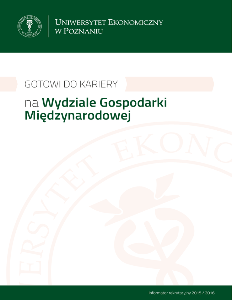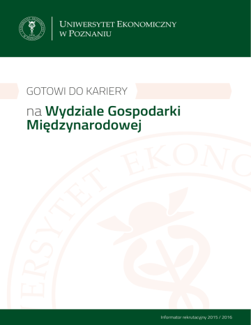 GOTOWI DO KARIERY na Wydziale Gospodarki Międzynarodowej Informator rekrutacyjny 2015 / 2016 1. KANDYDACI Masz otwarty umysł? Rynek Polski to dla Ciebie za mało i chcesz swobodnie poruszać się po gospodarce zglobalizowanego świata, odnosząc w nim sukcesy? Wydział Gospodarki Międzynarodowej to Twoje miejsca na studia! Oferujemy Ci 7 praktycznych i unikatowych specjalności na 2 kierunkach studiów o najwyższej jakości kształcenia potwierdzanej co roku przez Komitet Badań Naukowych Państwowej Akademii Nauk. Znajdź właściwy kierunek! Informator rekrutacyjny 2015 / 2016 1. KIERUNKI I SPECJALNOŚCI Kierunek: gospodarka turystyczna zarządzanie przedsiębiorstwem turystycznym Specjalności: Jeśli chcesz odbyć praktyki za granicą w międzynarodowej korporacji turystycznej, uważasz, że najlepiej uczyć się od praktyków, by dogłębnie poznać sposób funkcjonowania biznesu turystycznego, a do tego chcesz w przyszłości nim zarządzać, to właśnie odkryłaś/odkryłeś swój kierunek na ciekawe studia... i życie. zarządzanie turystyką w regionie Satysfakcja i zadowolenie turystów w danym regionie zależy od współpracy wielu podmiotów (m.in. samorządy, przedsiębiorstwa, miejscowa społeczność). Jeśli chcesz wiedzieć, jak skutecznie powiązać działania wszystkich tych podmiotów, aby skutecznie, czyli z sukcesem, zarządzać turystyką w regionie i cieszyć się satysfakcjonującą pracą nie tylko w Polsce, to zapraszamy Cię na naszą i Twoją specjalność. międzynarodowy biznes turystyczny (studia drugiego stopnia) Wraz z globalizacją zniknęły granice turystyki, powstały olbrzymie międzynarodowe koncerny turystyczne, które świadczą profesjonalne usługi na wszystkich kontynentach. Jak nimi zarządzać, jak prowadzić zintegrowane działania marketingowe i biznesowe? Wszystkiego tego dowiesz się właśnie u nas. Zapraszamy! Informator rekrutacyjny 2015 / 2016 1. KIERUNKI I SPECJALNOŚCI Kierunek: międzynarodowe stosunki gospodarcze biznes międzynarodowy Specjalności: Jeśli chcesz poznać i zrozumieć relacje oraz możliwe strategie zachodzące między dwoma i więcej podmiotami znajdującymi się w różnych państwach, aby być najlepszym menedżerem działającym w biznesie międzynarodowym, lepszej specjalności dla siebie nie znajdziesz! logistyka międzynarodowa to specjalność odpowiadająca na jedną z najszybciej rozwijających się gałęzi gospodarki. Jeśli więc chcesz dobrze przygotować się do pracy w obszarze logistyki, zaopatrzenia, produkcji i dystrybucji, nie trać czasu i wybierz naszą specjalność. przedsiębiorstwo i dyplomacja gospodarcza w Europie uczy niezbędnej znajomości zasad dyplomacji gospodarczej (ekonomicznej), czyli zabiegów mających na celu skuteczne forsowanie interesów przedsiębiorstw na poziomie instytucji unijnych i wspieranie przedsiębiorstw na arenie międzynarodowej. Specjalność tych wszystkich, którzy wyposażeni w praktyczną wiedzę dotyczącą Unii chcą w przyszłości kompetentnie poruszać się w świecie gospodarki unijnej i z sukcesem na nią wpływać. International Business (specjalność realizowana w języku angielskim, studia płatne) Informator rekrutacyjny 2015 / 2016 2. STUDENCI Od blisko 90 lat kształcimy najlepszych specjalistów w zakresie ekonomii, co potwierdzają rankingi uczelni, liczne certyfikaty, krajowe i zagraniczne sukcesy naszych studentów, absolwentów i wykładowców. Teraz czas na Ciebie! Najwyższa jakość kształcenia to dla nas standard Każdemu z blisko 11 tysięcy naszych studentów zapewniamy edukację wg wzorców kształcenia menedżerskiego w oparciu o aktualny stan badań naukowych oraz najefektywniejsze metody prowadzenia zajęć. Każdego dnia nauki nasi studenci korzystają z wiedzy i doświadczenia około 500 nauczycieli akademickich, w tym 140 profesorów - ludzi pełnych pasji, zaangażowania i otwartości. Nastawienie na praktyczny wymiar nauki, staże studenckie Czysty zysk! oraz stała współpraca z biznesem i zagranicznymi ośrodkami akademickimi dają naszym studentom możliwość pewnego wejścia na rynek pracy z dyplomem prestiżowej uczelni. Spośród naszych studentów rekrutuje się najlepsza kadra menedżerska kraju zarówno w administracji państwowej, biznesie, jak i przedsiębiorstwach państwowych i prywatnych. Informator rekrutacyjny 2015 / 2016 Studenci dają słowo “Sama uwielbiam podróże i podróżuję, więc tematyka jest mi bliska. Choć, z drugiej strony, nie przypuszczałam, że zarządzanie w turystyce, czyli spojrzenie od wewnątrz, może być tak pasjonujące. Duża w tym zasługa naszych wykładowców, którzy są w swojej dziedzinie prawdziwymi ekspertami i potrafią zaszczepić w nas chęć samodzielnego mierzenia się z biznesem turystycznym”. Paulina Próchnik studentka II roku zarządzania przedsiębiorstwem turystycznym na Wydziale Gospodarki Międzynarodowej “W swojej specjalności najbardziej cenię praktyczną wartość zajęć i kompetencje wykładowców, przez co czuję, że dobrze zainwestowałem czas. Poza tym jest to specjalność perspektywiczna, ponieważ, mimo że do Unii weszliśmy blisko 10 lat temu, to wciąż i coraz bardziej potrzebni są dobrze przygotowani specjaliści od logistyki”. Jan Matuszczak student III roku logistyki międzynarodowej na Wydziale Gospodarki Międzynarodowej Właściwi ludzie na właściwych miejscach poznaj władze wydziału Prof. dr hab. Tomasz Rynarzewski, prof. zw. UEP – dziekan Wydziału Gospodarki Międzynarodowej. Na co dzień zajmuje się m.in. teorią i polityką handlu międzynarodowego czy ekonomiką krajów rozwijających się. Autor wielu cenionych publikacji w języku polskim i angielskim, m.in. monografii: Międzynarodowa stabilizacja cen surowców a dochody eksportowe krajów rozwijających się, Poznań 1992. Zapalony miłośnik fotografii. Informator rekrutacyjny 2015 / 2016 Dr hab. Maciej Szymczak, prof. nadzw. UEP – prodziekan Wy