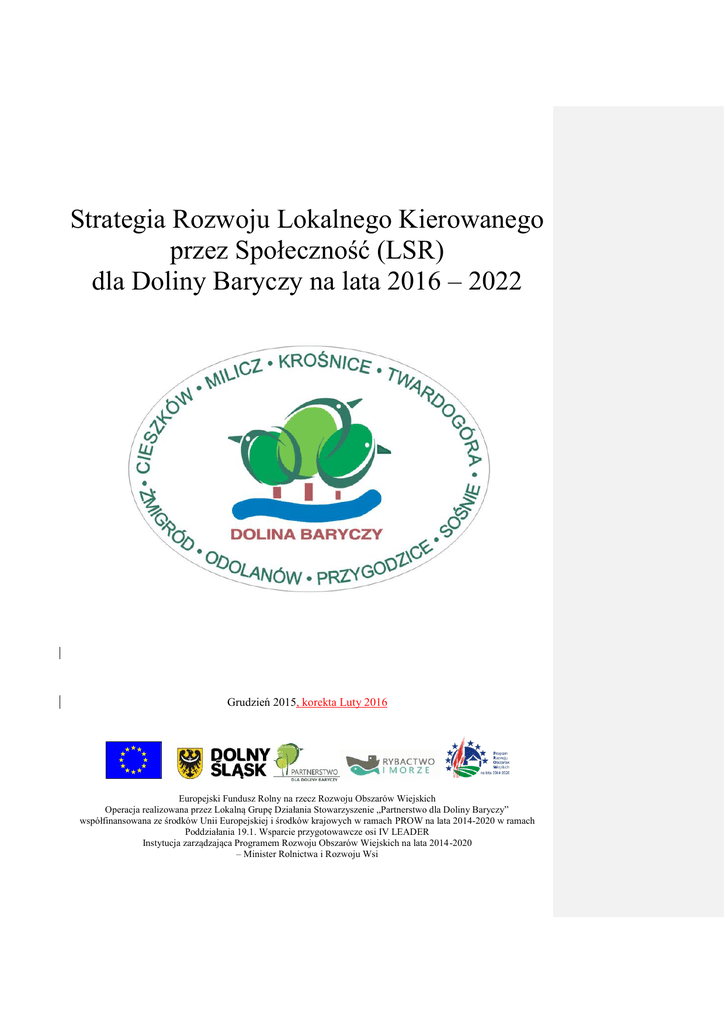 Strategia Rozwoju Lokalnego Kierowanego przez Społeczność (LSR) dla Doliny Baryczy na lata 2016 – 2022 Grudzień 2015, korekta Luty 2016 Europejski Fundusz Rolny na rzecz Rozwoju Obszarów Wiejskich Operacja realizowana przez Lokalną Grupę Działania Stowarzyszenie „Partnerstwo dla Doliny Baryczy” współfinansowana ze środków Unii Europejskiej i środków krajowych w ramach PROW na lata 2014-2020 w ramach Poddziałania 19.1. Wsparcie przygotowawcze osi IV LEADER Instytucja zarządzająca Programem Rozwoju Obszarów Wiejskich na lata 2014-2020 – Minister Rolnictwa i Rozwoju Wsi Spis treści I. CHARAKTERYSTYKA OBSZARU OBJĘTEGO LSR ..................................................................... 3 1. Forma prawna i nazwa stowarzyszenia ............................................................................................. 3 2. Obszar LSR ....................................................................................................................................... 3 3. Opis procesu tworzenia partnerstwa .................................................................................................. 4 4. Reprezentatywność LGD .................................................................................................................. 7 5. Organ decyzyjny Rada LGD ............................................................................................................. 8 6. Zasady funkcjonowania LGD............................................................................................................ 9 II. PARTYCYPACYJNY CHARAKER LSR ......................................................................................... 13 III. DIAGNOZA ........................................................................................................................................ 21 1. Grupy szczególnie istotne z punktu widzenia realizacji LSR oraz problemy i obszary interwencji odnoszące się do tych grup. ............................................................................................................. 21 2. Charakterystyka gospodarki/przedsiębiorczości (w tym przedsiębiorczości społecznej), branż z potencjałem rozwojowym (informacja o branżach gospodarki mających kluczowe znaczenie dla rozwoju obszaru). ...................................................................................................................... 21 3. Opis rynku pracy (poziom zatrudnienia i stopa bezrobocia – liczba bezrobotnych do liczby osób w wieku produkcyjnym, charakterystyka grup pozostających poza rynkiem pracy). ............ 27 4. Przedstawienie działalności sektora społecznego, w tym integracja/rozwój społeczeństwa obywatelskiego. ............................................................................................................................... 28 5. Wskazanie problemów społecznych, ze szczególnym uwzględnieniem problemów ubóstwa i wykluczenia społecznego oraz skali tych zjawisk (np. dostęp do miejscowej infrastruktury i kultury, liczba osób objętych opieką społeczną). .......................................................................... 30 6. Wykazanie wewnętrznej spójności obszaru LSR (innej niż spójność przestrzenna). ..................... 34 7. Charakterystyka rybactwa i rynku rybnego (liczba gospodarstw, kierunki produkcji, informacja na temat osób zatrudnionych w rybactwie) ..................................................................................... 34 8. Krótki opis dziedzictwa kulturowego/zabytków. ............................................................................ 37 9. Krótka charakterystyka obszarów atrakcyjnych turystycznie oraz wskazanie potencjału dla rozwoju turystyki, informacja dotycząca liczby gospodarstw agroturystycznych, wskaźnik Schneidera (intensywność ruchu turystycznego). ........................................................................... 38 10. Opis produktów lokalnych, tradycyjnych i regionalnych podkreślających specyfikę danego obszaru (krótki opis produktów charakterystycznych, występujących na obszarze), w tym promocji i sprzedaży takich produktów........................................................................................... 40 11. Podsumowanie najważniejszych problemów, potrzeb, zasobów i potencjału obszaru. ................... 41 IV. ANALIZA SWOT ORAZ KONSULTACJE I BADANIA - ............................................................. 43 V. CELE I WSKAŹNIKI ......................................................................................................................... 49 1. Specyfikacja i opis celów ogólnych, przypisanych im celów szczegółowych i przedsięwzięć oraz uzasadnienie ich sformułowania w oparciu o konsultacje społeczne i powiązanie z analizą SWOT i diagnozą obszaru. .............................................................................................................. 49 2. Przedstawienie przedsięwzięć oraz wskazanie sposobu ich realizacji wraz z uzasadnieniem. ....... 52 3. Wykazanie zgodności celów z celami programów, w ramach których planowane jest finansowanie LSR.. ......................................................................................................................... 61 VI. SPOSÓB WYBORU I OCENY OPERACJI ORAZ SPOSÓB USTANAWIANIA KRYTERIÓW WYBORU. ............................................................................................................................................... 79 1. Formy wsparcia operacji w ramach LSR. ........................................................................................ 79 2. Cel tworzenia procedur. ................................................................................................................... 81 3. Zakres procedur. .............................................................................................................................. 82 4. Formułowanie k