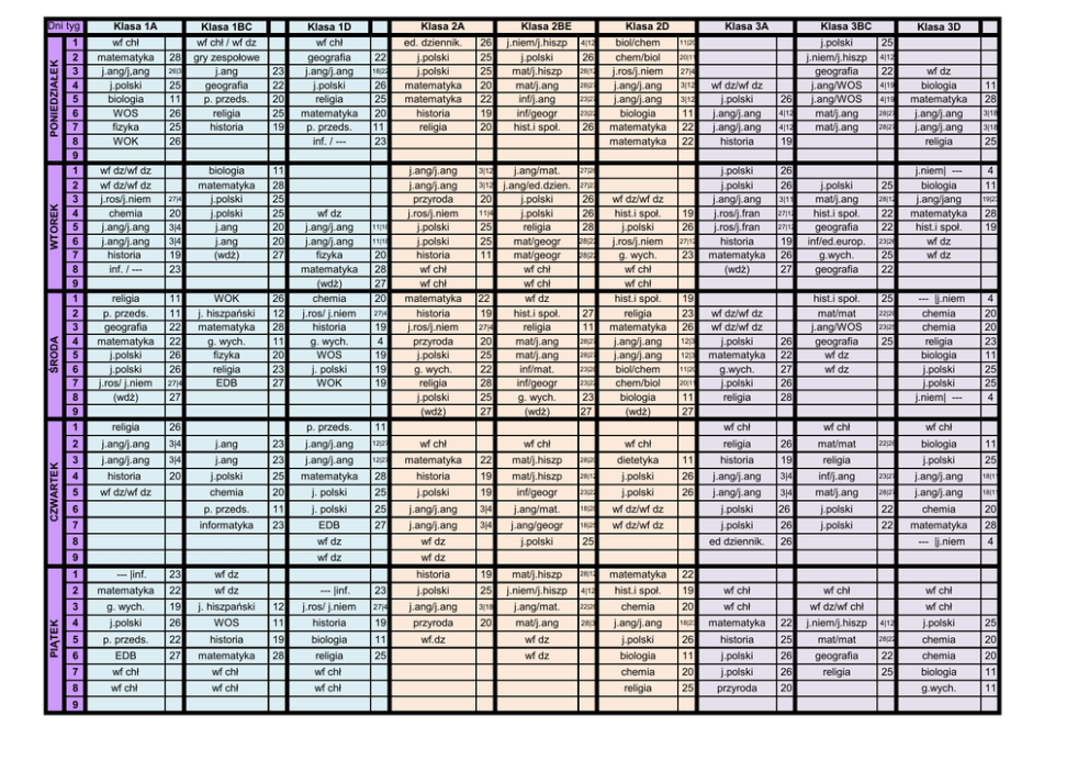 CZWARTEK ŚRODA WTOREK PONIEDZIAŁEK Dni tyg 1 2 3 4 5 6 7 8 9 1 2 3 4 5 6 7 8 9 1 2 3 4 5 6 7 8 9 wf dz/wf dz wf dz/wf dz j.ros/j.niem chemia j.ang/j.ang j.ang/j.ang historia inf. / --religia p. przeds. geografia matematyka j.polski j.polski j.ros/ j.niem (wdż) 28 26|3 25 11 26 25 26 27|4 20 3|4 3|4 19 23 11 11 22 22 26 26 27|4 Klasa 1BC Klasa 1D wf chł / wf dz gry zespołowe j.ang geografia p. przeds. religia historia wf chł geografia j.ang/j.ang j.polski religia matematyka p. przeds. inf. / --- 23 22 20 25 19 biologia matematyka j.polski j.polski j.ang j.ang (wdż) 11 28 25 25 20 20 27 WOK j. hiszpański matematyka g. wych. fizyka religia EDB 26 12 28 11 20 23 27 wf dz j.ang/j.ang j.ang/j.ang fizyka matematyka (wdż) chemia j.ros/ j.niem historia g. wych. WOS j. polski WOK Klasa 2A 22 18|22 26 25 20 11 23 11|18 11|18 20 28 27 20 27|4 19 4 19 19 19 27 ed. dziennik. j.polski j.polski matematyka matematyka historia religia j.ang/j.ang j.ang/j.ang przyroda j.ros/j.niem j.polski j.polski historia wf chł wf chł matematyka historia j.ros/j.niem przyroda j.polski g. wych. religia j.polski (wdż) Klasa 2BE 26 25 25 20 22 19 20 3|12 3|12 20 11|4 25 25 11 22 19 27|4 20 25 22 28 25 27 j.niem/j.hiszp j.polski mat/j.hiszp mat/j.ang inf/j.ang inf/geogr hist.i społ. Klasa 2D 4|12 26 28|12 28|27 23|27 23|22 26 27|28 j.ang/mat. j.ang/ed.dzien. 27|23 j.polski 26 j.polski 26 religia 28 28|22 mat/geogr 28|22 mat/geogr wf chł wf chł wf dz hist.i społ. 27 religia 11 28|27 mat/j.ang 28|27 mat/j.ang 23|28 inf/mat. 23|22 inf/geogr g. wych. 23 (wdż) 27 biol/chem chem/biol j.ros/j.niem j.ang/j.ang j.ang/j.ang biologia matematyka matematyka wf dz/wf dz hist.i społ. j.polski j.ros/j.niem g. wych. wf chł wf chł hist.i społ. religia matematyka j.ang/j.ang j.ang/j.ang biol/chem chem/biol biologia (wdż) 1 religia 26 p. przeds. 11 2 j.ang/j.ang 3|4 j.ang 23 j.ang/j.ang 12|27 wf chł 3 j.ang/j.ang 3|4 j.ang 23 j.ang/j.ang 12|27 matematyka 22 mat/j.hiszp 28|20 dietetyka 4 historia 20 j.polski 25 matematyka 28 historia 19 mat/j.hiszp 28|12 5 wf dz/wf dz chemia 20 j. polski 25 j.polski 19 inf/geogr 6 p. przeds. 11 j. polski 25 j.ang/j.ang 3|4 7 informatyka 23 EDB 27 j.ang/j.ang 3|4 wf dz wf dz 9 wf dz wf dz 23 wf dz 2 matematyka 22 wf dz 3 g. wych. 19 j. hiszpański 12 4 j.polski 26 WOS 5 p. przeds. 22 historia 6 EDB 27 matematyka 7 wf chł wf chł 8 wf chł wf chł 9 --- |inf. Klasa 3A Klasa 3BC 11|20 20|11 27|4 3|12 3|12 11 22 22 19 26 27|12 23 19 23 26 12|3 12|3 11|20 20|11 11 27 wf dz/wf dz j.polski j.ang/j.ang j.ang/j.ang historia j.polski j.polski j.ang/j.ang j.ros/j.fran j.ros/j.fran historia matematyka (wdż) wf dz/wf dz wf dz/wf dz j.polski matematyka g.wych. j.polski religia 26 4|12 4|12 wf chł wf chł j.polski j.niem/j.hiszp geografia j.ang/WOS j.ang/WOS mat/j.ang mat/j.ang 26 26 3|11 27|12 27|12 19 26 27 26 22 27 26 28 j.polski mat/j.ang hist.i społ. geografia inf/ed.europ. g.wych. geografia hist.i społ. mat/mat j.ang/WOS geografia wf dz wf dz 4|12 22 4|19 4|19 28|27 28|27 25 28|12 22 22 23|26 25 22 25 22|28 23|25 25 wf chł religia 26 mat/mat 11 historia 19 religia j.polski 26 j.ang/j.ang 3|4 inf/j.ang 23|22 j.polski 26 j.ang/j.ang 3|4 j.ang/mat. 18|28 wf dz/wf dz j.polski j.ang/geogr 18|25 wf dz/wf dz j.polski j.polski 25 ed dziennik. 26 wf dz biologia matematyka j.ang/j.ang j.ang/j.ang religia j.niem| --biologia j.ang/jang matematyka hist.i społ. wf dz wf dz --- |j.niem chemia chemia religia biologia j.polski j.polski j.niem| --- 11 28 3|18 3|18 25 4 11 19|23 28 19 4 20 20 23 11 25 25 4 wf chł 22|28 biologia 11 j.polski 25 23|27 j.ang/j.ang 18|11 mat/j.ang 28|27 j.ang/j.ang 18|11 26 j.polski 22 chemia 20 26 j.polski 22 matematyka 28 --- |j.niem 4 historia 19 mat/j.hiszp 28|12 matematyka 22 23 j.polski 25 j.niem/j.hiszp 4|12 hist.i społ. 19 wf chł wf chł j.ros/ j.niem 27|4 j.ang/j.ang 3|18 j.ang/mat. 22|28 chemia 20 wf chł wf dz/wf chł 11 historia 19 przyroda 20 mat/j.ang 28|3 19 biologia 11 wf.dz 28 religia 25 --- |inf. Klasa 3D 25 19 wf chł 8 1 PIĄTEK Klasa 1A wf chł matematyka j.ang/j,ang j.polski biologia WOS fizyka WOK wf chł wf chł j.ang/j.ang 18|23 matematyka 22 j.niem/j.hiszp 4|12 j.polski 25 wf dz j.polski 26 historia 25 mat/mat 28|22 chemia 20 wf dz biologia 11 j.polski 26 geografia 22 chemia 20 wf chł chemia 20 j.polski 26 religia 25 biologia 11 wf chł religia 25 przyroda 20 g.wych. 11