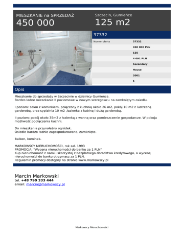 MIESZKANIE na SPRZEDAŻ 450 000 Szczecin, Gumieńce 125 m2 37332 Numer oferty 37332 450 000 PLN 125 4 091 PLN Secondary House 2001 1 Opis Mieszkanie do sprzedaży w Szczecinie w dzielnicy Gumieńce. Bardzo ładne mieszkanie II poziomowe w nowym szeregowcu na zamkniętym osiedlu. I poziom: salon z kominkiem, połączony z kuchnią około 26 m2, pokój 10 m2 z lustrzaną garderobą, oraz sypialnia 10 m2 ,łazienka z kabiną i dużą garderobą. II poziom: pokój około 35m2 z łazienką z wanną oraz pomieszczenie gospodarcze. W pokoju możliwość podłączenia kuchni. Do mieszkania przynależny ogródek. Osiedle bardzo ładnie zagospodarowane, zamknięte. Balkon, kominek. MARKOWSCY NIERUCHOMOŚCI, rok zał. 1993 PROMOCJA: "Wycena nieruchomości do banku za 1 PLN" Kup nieruchomość z nami i skorzystaj z bezpłatnego doradztwa kredytowego, a wycenę nieruchomości do banku otrzymasz za 1 PLN. Regulamin promocji dostępny na stronie www.markowscy.pl Marcin Markowski tel. +48 790 333 444 email: [email protected] Markowscy Nieruchomości Powered by TCPDF (www.tcpdf.org)