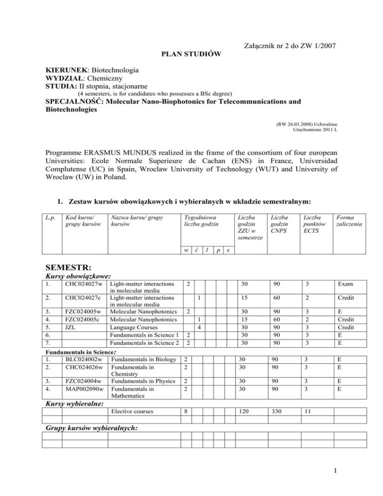 Załącznik nr 2 do ZW 1/2007 PLAN STUDIÓW KIERUNEK: Biotechnologia WYDZIAŁ: Chemiczny STUDIA: II stopnia, stacjonarne (4 semesters, is for candidates who possesses a BSc degree) SPECJALNOŚĆ: Molecular Nano-Biophotonics for Telecommunications and Biotechnologies (RW 26.03.2008) Uchwalone Uruchomione 2011 L Programme ERASMUS MUNDUS realized in the frame of the consortium of four european Universities: Ecole Normale Superieure de Cachan (ENS) in France, Universidad Complutense (UC) in Spain, Wroclaw University of Technology (WUT) and University of Wroclaw (UW) in Poland. 1. Zestaw kursów obowiązkowych i wybieralnych w układzie semestralnym: L.p. Kod kursu/ grupy kursów Nazwa kursu/ grupy kursów Tygodniowa liczba godzin w ć l p Liczba godzin ZZU w semestrze Liczba godzin CNPS Liczba punktów ECTS Forma zaliczenia s SEMESTR: Kursy obowiązkowe: 1. CHC024027w 2. CHC024027c 3. 4. 5. 6. 7. FZC024005w FZC024005c JZL Light-matter interactions in molecular media Light-matter interactions in molecular media Molecular Nanophotonics Molecular Nanophotonics Language Courses Fundamentals in Science 1 Fundamentals in Science 2 Fundamentals in Science: 1. BLC024002w Fundamentals in Biology 2. CHC024026w Fundamentals in Chemistry 3. FZC024004w Fundamentals in Physics 4. MAP002090w Fundamentals in Mathematics 2 1 2 1 4 2 2 30 90 3 Exam 15 60 2 Credit 30 15 30 30 30 90 60 90 90 90 3 2 3 3 3 E Credit Credit E E 2 2 30 30 90 90 3 3 E E 2 2 30 30 90 90 3 3 E E 8 120 330 11 Kursy wybieralne: Elective courses Grupy kursów wybieralnych: 1 Razem w semestrze: w Łączna liczba godzin ć l p s 16 Łączna liczba godzin ZZU w semestrze 330 6 Łączna liczba godzin CNPS Łączna liczba punktów ECTS 30 900 SEMESTR 1: SEGMENT OF COURSES 1 realized at Universidad Complutense in Madrid or SEGMENT OF COURSES 2 realized at University of Wroclaw Razem w semestrze: Łączna liczba godzin w ć l p s Łączna liczba godzin ZZU w semestrze 300 Łączna liczba godzin CNPS Łączna liczba punktów ECTS 30 900 SEMESTR 2: Kursy obowiązkowe: 1. FZC024006w 2. FZC024006l 3. 4. 5. FTP002090w FTP002090 l FZC024007w 6. FZC024007s 7. FZC024007 l 8. CHC024028w 9. CHC024028s 10. BTC024006w 11. BTC024006s Liquid crystals in photonics Liquid crystals in photonics Nanoscale physics Nanoscale physics Molecular electronic materials Molecular electronic materials Molecular electronic materials Methodology of experimental work Methodology of experimental work Ecological and ethical aspects of biotechnology Ecological and ethical aspects of biotechnology 30 120 4 Oral exam 1 15 60 2 Lab. reports 120 60 120 4 2 4 Oral exam 0,5 22,5 7,5 15 7,5 30 1 Presentation 7,5 30 1 Lab. reports 15 30 1 Written essay 15 60 2 Presentation 30 120 4 Oral exam 15 60 2 Presentation 2 1,5 1 0,5 0,5 1 1 2 1 Lab. reports Written essay Grupy kursów obowiązkowych: Kursy wybieralne: Elective courses 2 30 90 3 Grupy kursów wybieralnych: 2 Razem w semestrze: Łączna liczba godzin w ć l p s 9,5 2 Łączna liczba godzin ZZU w semestrze 210 2,5 Łączna liczba godzin CNPS 900 Łączna liczba punktów ECTS 30 SEMESTR 3: Kursy obowiązkowe: 1. BTC024007w 2. BTC024007s 3. BTC024008w 4. 5. CHC030003 l BTC024005s Law and protection of intelectual properties in biotechnology Law and protection of intelectual properties in biotechnology Economical perspetives of nano- and biotechnology Graduate laboratory Graduate seminar and thesis preparation 2 1 2 15 2 30 120 4 Oral exam 15 60 2 Presnetation 30 120 4 Oral exam 225 30 300 10 Written essay Written essay 300 10 Grupy kursów obowiązkowych: Kursy wybieralne: Grupy kursów wybieralnych: Razem w semestrze: Łączna liczba godzin w ć l p s 4 15 Łączna liczba godzin ZZU w semestrze 330 3 Łączna liczba godzin CNPS 900 Łączna liczba punktów ECTS 30 Lista kursów wybieralnych: 1. CHC020018w 2. CHC020018s 3. CHC020019w 4. CHC020019c 5. FTP002091w 6. FTP002091 l Bioorganic chemistry for photonics Bioorganic chemistry for photonics Bioorganic chemistry with elements of biochemistry Bioorganic chemistry with elements of biochemistry Fluorescence microscopy and imaging in life sciences Fluorescence microscopy 1 1 1 1 1,5 0,5 15 120 4 Oral exam 15 60 2 Presentation 15 120 4 Oral exam 15 60 2 Presentation 22,5 120 4 Oral exam 7,5 60 2 Lab. reports 3 7. BTC020011w 8. ETE000700w 9. ETE000700 l 10. FTP002092w 11. CHC020020w 12. ETD009953w 13. ETD009953 l 14. FTP002093w 15. FTP002093 l 16. CHC020021w 17. CHC020021 l and imaging in life sciences Genetic engineering as a tool for bio-based technology Introduction to optical telecommunications Introduction to optical telecommunications Introduction to quantum information processing and quantum cryptography Methods of structural investigations in physics, chemistry and biology Micro and nanophotonics – devices technology and applications Micro-and nanophotonics-devices technology and applications Monte-Carlo-based modelling of photonic processes in liquid crystals and azopolymers Monte-Carlo-based modelling of photonic processes in liquid crystals and azopolymers Theoretical modeling of the nonlinear optical properties of molecules and clusters Theoretical modeling of the nonlinear optical properties of molecules and clusters 2 30 180 6 Written exam 1,5 22,5 120 4 Written exam 7,5 60 2 Lab. reports 2 30 180 6 Written exam 2 30 180 6 Written exam 1,5 22,5 120 4 Written exam 7,5 60 2 Lab. reports 15 120 4 Oral exam 15 60 2 Project 22,5 120 4 Written exam 7,5 60 2 Lab. reports 0,5 0,5 1 1 1,5 0,5 2. Zestaw kursów przeznaczonych do realizacji w trybie zdalnego nauczania: Semestr 1 2 Kod kursu Nazwy kursów realizowanych lub przeznaczonych do realizacji w trybie zdalnego nauczania: 1. ..... 1. ..... 4 3. Zestaw egzaminów w układzie semestralnym: Semestr 1 Kod kursu Nazwy kursów kończących się egzaminem CHC024027w FZC024003w Light-matter interactions in molecular media Molecular Nanophotonics Fundamentals in Science 1 Fundamentals in Science 2 Courses realized at Universidad Comp