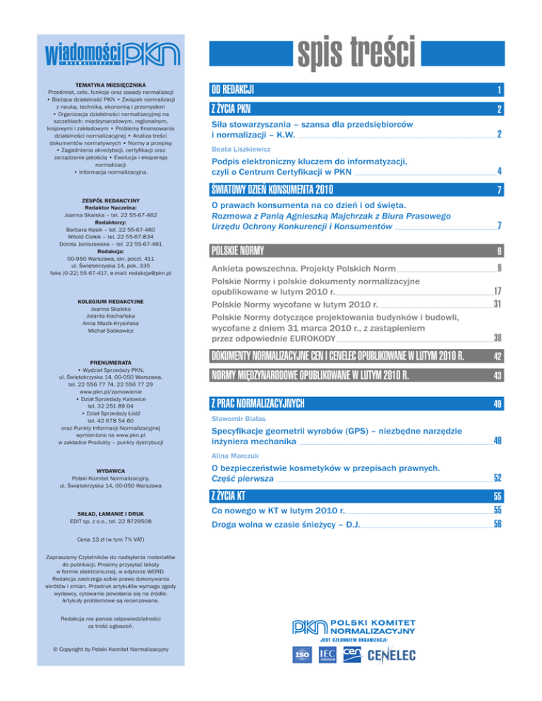 spis treści TEMATYKA MIESIĘCZNIKA Przedmiot, cele, funkcje oraz zasady normalizacji • Bieżąca działalność PKN • Związek normalizacji z nauką, techniką, ekonomią i przemysłem • Organizacja działalności normalizacyjnej na szczeblach: międzynarodowym, regionalnym, krajowymi i zakładowym • Problemy finansowania działalności normalizacyjnej • Analiza treści dokumentów normatywnych • Normy a przepisy • Zagadnienia akredytacji, certyfikacji oraz zarządzanie jakością • Ewolucja i ekspansja normalizacji • Informacja normalizacyjna. ZESPÓŁ REDAKCYJNY Redaktor Naczelna: Joanna Skalska – tel. 22 55-67-462 Redaktorzy: Barbara Kęsik – tel. 22 55-67-460 Witold Ciołek – tel. 22 55-67-834 Dorota Janiszewska – tel. 22 55-67-461 Redakcja: 00-950 Warszawa, skr. poczt. 411 ul. Świętokrzyska 14, pok. 335 faks (0-22) 55-67-417, e-mail: [email protected] OD REDAKCJI 1 Z ŻYCIA PKN 2 Siła stowarzyszania – szansa dla przedsiębiorców i normalizacji – K.W. _______________________________________________________________________________________________________________________________________________________________________________________________________________________________________________________________________________________________ Beata Liszkiewicz Podpis elektroniczny kluczem do informatyzacji, czyli o Centrum Certyfikacji w PKN 4 ŚWIATOWY DZIEŃ KONSUMENTA 2010 7 ______________________________________________________________________________________________________________________________________________________________________________________________________________ O prawach konsumenta na co dzień i od święta. Rozmowa z Panią Agnieszką Majchrzak z Biura Prasowego Urzędu Ochrony Konkurencji i Konsumentów 7 POLSKIE NORMY 9 ____________________________________________________________________________________________________________________________________________________ Ankieta powszechna. Projekty Polskich Norm Polskie Normy i polskie dokumenty normalizacyjne opublikowane w lutym 2010 r. Polskie Normy wycofane w lutym 2010 r. Polskie Normy dotyczące projektowania budynków i budowli, wycofane z dniem 31 marca 2010 r., z zastąpieniem przez odpowiednie EUROKODY 9 _______________________________________________________________________________________________________________________________________________________ ___________________________________________________________________________________________________________________________________________________________________________________________________________________________________________ KOLEGIUM REDAKCYJNE Joanna Skalska Jolanta Kochańska Anna Mazik-Krysińska Michał Sobkowicz ___________________________________________________________________________________________________________________________________________________________________________ __________________________________________________________________________________________________________________________________________________________________________________________________________________________________________ PRENUMERATA • Wydział Sprzedaży PKN, ul. Świętokrzyska 14, 00-050 Warszawa, tel. 22 556 77 74, 22 556 77 29 www.pkn.pl/zamowienie • Dział Sprzedaży Katowice tel. 32 251 89 04 • Dział Sprzedaży Łódź tel. 42 678 54 60 oraz Punkty Informacji Normalizacyjnej wymienione na www.pkn.pl w zakładce Produkty – punkty dystrybucji 2 17 31 38 DOKUMENTY NORMALIZACYJNE CEN I CENELEC OPUBLIKOWANE W LUTYM 2010 R. 42 NORMY MIĘDZYNARODOWE OPUBLIKOWANE W LUTYM 2010 R. 43 Z PRAC NORMALIZACYJNYCH 49 Sławomir Białas Specyfikacje geometrii wyrobów (GPS) – niezbędne narzędzie inżyniera mechanika 49 _________________________________________________________________________________________________________________________________________________________________________________________________________________________________________________________________________________________ Alina Marczuk WYDAWCA Polski Komitet Normalizacyjny, ul. Świętokrzyska 14, 00-050 Warszawa SKŁAD, ŁAMANIE I DRUK EDIT sp. z o.o., tel. 22 8729508 Cena 13 zł (w tym 7% VAT) Zapraszamy Czytelników do nadsyłania materiałów do publikacji. Prosimy przysyłać teksty w formie elektronicznej, w edytorze WORD. Redakcja zastrzega sobie prawo dokonywania skrótów i zmian. Przedruk artykułów wymaga zgody wydawcy, cytowanie powołania się na źródło. Artykuły problemowe są recenzowane. Redakcja nie ponosi odpowiedzialności za treść ogłoszeń. © Copyright by Polski Komitet Normalizacyjny O bezpieczeństwie kosmetyków w przepisach prawnych. Część pierwsza 52 Z ŻYCIA KT 55 _________________________________________________________________________________________________________________________________________________________________________________________________________________________________________________________________________________________________________________________ Co nowego w KT w lutym 2010 r. 55 ______________________________________________________________________________________________________________________________________________________________________________________________________________________ Droga wolna w czasie śnieżycy – D.J. 56 ________________________________________________________________________________________________________________________________________________________________________________________________