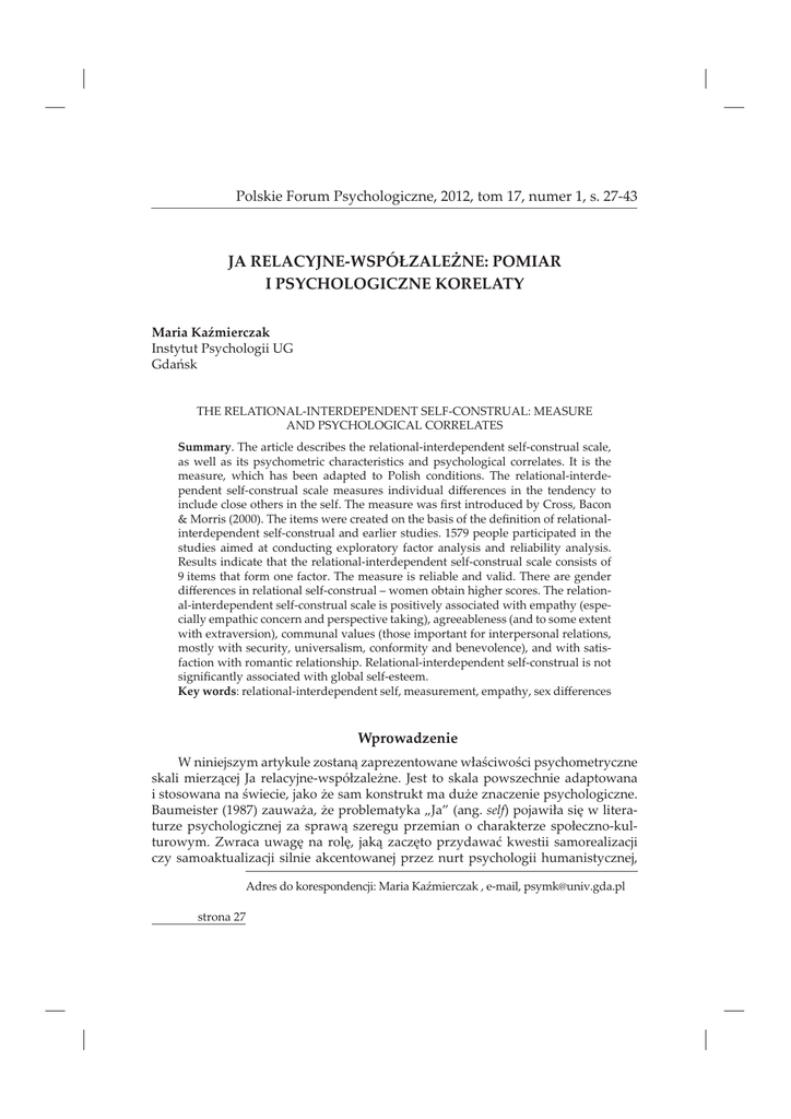 ȱȱ¢£ǰȱŘŖŗŘǰȱȱŗŝǰȱȱŗǰȱǯȱŘŝȬŚř ȱȬXR DZȱȱ ȱ ȱȱ ȱĊ£ Instytut Psychologii UG Ú ȱȬȱȬDZȱȱ ȱ ȱ SummaryǯȱȱȱȱȱȬȱȬȱǰȱ as well as its psychometric characteristics and psychological correlates. It is the ǰȱ ȱ ȱ ȱ ȱ ȱ ȱ ǯȱ ȱ ȬȬ ȱ Ȭȱ ȱ ȱ ȱ ěȱ ȱ ȱ ¢ȱ ȱ ȱȱȱȱȱǯȱȱȱ ȱęȱȱ¢ȱǰȱȱ ǭȱȱǻŘŖŖŖǼǯȱȱȱ ȱȱȱȱȱȱȱęȱȱȬ ȱȬȱȱȱǯȱŗśŝşȱȱȱȱȱ ȱ ȱ ȱ ȱ ¡¢ȱ ȱ ¢ȱ ȱ ¢ȱ ¢ǯȱ ȱȱȱȱȬȱȬȱȱȱȱ şȱȱȱȱȱǯȱȱȱȱȱȱǯȱȱȱȱ ěȱȱȱȬȱȮȱ ȱȱȱǯȱȱȬ ȬȱȬȱȱȱ¢ȱȱ ȱ¢ȱǻȬ ¢ȱȱȱȱȱǼǰȱȱǻȱȱȱ¡ȱ ȱ¡Ǽǰȱȱȱǻȱȱȱȱǰȱ ¢ȱ ȱ¢ǰȱǰȱ¢ȱȱǼǰȱȱ ȱȬ ȱ ȱȱǯȱȬȱȬȱȱȱ ę¢ȱȱ ȱȱȬǯ Key wordsDZȱȬȱǰȱǰȱ¢ǰȱ¡ȱě Wprowadzenie ȱ£¢ȱ¢ȱ£ȱ££ ȱ Ùï ïȱ¢¢£ȱ ȱ £ȱ ȱ ¢Ȭ àÙ£Čǯȱ ȱ ȱ ȱ £ȱ ȱ ȱ ȱȱï ǰȱȱČȱȱȱȱČȱ££ȱ¢£ǯȱ ȱǻŗşŞŝǼȱ£ ČǰȱČȱ¢ȱǮȄȱǻǯȱǼȱ Ùȱ¿ȱ ȱȬ £ȱ ¢£ȱ £ȱ ȱ £ȱ £ȱ ȱ £ȱ Ù£ȬȬ ¢ǯȱ ȱ ¿ȱ ȱ ¿ǰȱ ȱ ££¿ȱ £¢ °ȱ ȱ £ȱ £¢ȱ £ȱ ȱ ȱ ££ȱ ȱ ¢ȱ ¢£ǰȱ ȱȱDZȱȱĊ£ȱǰȱȬǰȱ¢ȓǯǯ ȱŘŝ ȱ ȱ¿ȱÙ£¢ȱ£ ȱ¿ȱ ȱ¢£ȱ £ȱ£ȱȱȬ ££ȱ ¿ȱ Ùï°ȱ ȱ à£ȱ ¿ǯȱ Ùȱ ȱ àÙ£ȱ ÙȬ £Ú ȱȱȱ£ȱČȱ¢ȱ£ȱï¢ȱČï°ȱȱ ¢ ȱǻȱ£¢ȱï £¢ȱ°¢ȱ£ȱ££ȱ£ȱÙ£Ǽǰȱ ȱȱę ȱ ÙȱǮȄȱȱ¿ȱ£ïȱČ¢ ȱȱ ¢ȱ£¿Ȭ ȱ Ǯȱ ¿£¢ȱ ¢à ȱ ȱ ££ȱ ȱ £ǰȱ ȱ ££ȱ ȱ ¢ Ȅȱ ǻǰȱ ŗşŞŝǰȱ ǯȱ ŗŝřǼǯȱ ȱ ïǰȱ Čȱ ȱ ȱ£¢ȱ¢ȱȱ Ùȱ ȱ¢ȱÙ£ȱȱȱǮȄȱČȱ¢°ȱ ȱàČ¢ȱ ȱę ȱȱ ȱǰȱ ȱȱàȱȱ£ȱ££ȱȬ ¢ǯȱ ȱ à Čȱ ȱ £Ùǰȱ Čȱ ¢ȱ ȱ ǮȄȱ ǻȱ ï Ȭ ïȱ Ě¢ȱ ȱ ȱ ¢ £ȱ ǮȄǼȱ ȱ ¢ȱ £ȱ £ȱ Ùà ¢ȱ à ȱǮȄȱǻ£DZȱǰȱŘŖŖŖǼǯ ȱ£¢ȱ¢ȱ ȱ¿ȱȱǮȄǰȱȱČ¢ȱ £°ȱȱ ¿ȱ£Ȭ àČȱ¿°ȱ i Ȭȱ ȱ¿£¢ȱǰȱȱČȱ£ ȱȱȱȱ ££°ȱȱǮȱ¢Ȭ àÙ£ČȄǯȱȱȬ wprowaȬ £ȱȱ¢ȱ£ȱȱȱ¢ȱǻŗşşŗǼǯȱȱïȱȱǻŘŖŖşǼȱ ȱ¿ȱȱȱǰȱ ȱȱ£ȱǮęȱȱȱ££ȱȄȱǻǯȱǰȱ ǰȱȬ ǰȱ ȱǼ ȱ ÙȱȱÙ£¢ȱȱ£ȱ¢ǰȱȱ£Ȭ my siebie w relacjach i jakie nadajemy znaczenie tym relacjom. ȱ£ȱ£ȱ£ȱȱ£àČȱ¿£¢ȱ£Č¢ȱȱ àÙȬ £Č¢ȱȱ£ ȱ££ȱȱȱ¢¿ȱǻŗşşŗǼǯȱȱȱ£Čȱ ȱ¿ȱȱ ¿£¢ǰȱ¢ȱȱ£¢ȱ££ȱ¿ȱȱ àČ¢ȱȱȱ¢ǯȱȱ£ȱȱ àÙ£Č¢ȱ£ȱȱ££ȱ ¢£ȱ ¢Ù¢ȱàȱȱ£ÚȱÙ£¢ǯȱÙȱà ȱȱȱ £à ȱȱ àÙ£Čǰȱȱȱ£Čǰȱȱ£¿ȱ Ù¢ ȱ ¢ȱȱ £ ȱȱ£ȱǯȱ¢ȱ££ ȱ££ȱȱȱ¢¿ȱ¢Ȭ ę ȱ ȱ £ȱ àČ ȱ ȱ ȱ ¢ ¢£ȱ ȱ¢ ¢£ǯȱ ǰȱ ȱ ȱ ȱ ǻŘŖŖŘǼȱ Čȱ ǰȱ Čȱ Č¢ȱ àȰȱ ȱ àÙ£Čȱ ę ȱ ȱ£ȱ¢¢£ȱǻǯȱ££ȱÚ£¢Ǽȱȱȱ àÙ£ČȬ ȱ£ ȱ££ȱ£ ȱ¢ȱǯȱȱÙ£Ú ȱ àÙ£ȱȱ£¢Čï°ȱȱïȱ¢ȱÙ£ȱȱȱ ¢Ȭ ȱȱ¢ȱǰȱ£ȱȱ£ȱÙ°ȱïȱ ïȱ ȱ ČȬ ¢ȱȱȱǯȱǰȱȱ àÙ£Čȱ ȱ£ȱȱ¿£ȱ£ȱ£Ȭ £Ùȱ Ù£ȱ ȱ £ȱ Č¢ȱ ȱ ȱ ȱ ǻǯȱ ǰȱ ÙČǼȱ ȱȱǻǰȱǰȱǰȱŘŖŖŘǰȱǯȱřşşǼǯȱȱ ȱȱ£¢ȱ£¢ ȱȱȬ ¢¢Ȭ àÙ£Č¢ǰȱ¢ȱï°ȱ¢£¢ȱȱȱ Ù£¢ȱ ȱǯȱČ¢ȱ£¢ȱ¢ȱ£££¢°ǰȱČȱ ¢ȱ¢ £Ȭ¢ £ȱ Č¢ ¢ȱȱ¢ ȱ ȱȱȱǰȱ£ïȱȱȬȱȱ¿ȱ ȱàǯȱȱÙ£Ú ȱȱ ȱàȱ£¢ ¢ȱȱȱ¢¢¿ȱ ȱ £Ùà ǰȱ ïàȱ à¢ȱ ȱ ȱ £¢¢ȱ £ȱ £ °ȱ ȱ ¿ȱ ȱȱ£ °ȱȱ ȱàČ¢ȱȱǻǰȱ ǰȱȬ ǰȱ ȱȬ Ǽǯȱȱȱ àÙ ¢ȱïȱ£¢ȱ¢ǰȱČȱ¢Ȭ àÙ£Čȱȱ ȱȱȱČ¢ȱ£ȱàïǰȱ£¿¢ȱ ȱà ȱȱ¢Ȭ £¢ȱ££à¢ȱ¢ ¢ȱǯȱȱȱȱ ȱĊàȬ strona 28 Ùȱ¢ ȱȱ£ ȱȱȱ¢ȱǻǰȱǰȱǰȱ ŘŖŖŘǰȱǯȱŚŖŗǼǯȱȱǻŘŖŖşǼȱ£àČȱ¢ȱ¢ȱ¿£¢ȱ¿ȱȱ¢Ȭ Ȭ àÙ£Čȱȱ¢ȱȱ¢ȱ¿ȱȱ£Ù ȱȬ ¢ȱ£ £à ȱ¢ǰȱ ¢ȱ££ȱǯǯȱȱǻȱ ȱǯǰȱŗşşŗǼȱ£¢ȱȱǻǰȱǰȱŘŖŖŘǼǯȱ matka ojciec X X X X X X X przyjaciel X JA X X X X X X X X X X X brat / siostra X X X XX ZVSyáSUDFRZQLN przyjaciel ¢ȱŗǯȱȱ¢£ȱ¿ȱȱ àÙ£Čȱ Ùȱȱȱ¢¢ȱǻŗşşŗǰȱ ǯȱŘŘŜǼ ȱȱ ¿ȱ ¢Č£ȱ£¢ǰȱ ȱ£ °ȱ¿ȱȱȱȬ ȱ ȱ ¢Ȭ àÙ£Čǯȱ ȱ £¢ȱ ¢ȱ ȱ ¿ȱ ȱ ¢ ¢ȱ £¿£ȱ ȱ ȱ ȱ ¢Ȭ àÙ£Čȱ ǻRelaȬ ȬȱȬȱǰȱǼȱ£ ¢ȱ££ȱǰȱȬ ȱ ȱ ȱ ǻŘŖŖŖǼǰȱ ȱ àȱ £ȱ ȱ ¢Ù¢ȱ ȱ ȱ ęȬ ȱȱ¢Ȭ àÙ£Čȱȱ£ȱ £ï£¢ȱÚǯȱ£¿£ȱ ȱ¢ȱÙȱ¿ȱ£ȱȱ £Úǰȱȱ£ȱȱȱǻǰȱǰȱ ǰȱŘŖŖŖǼǯȱȱȱȱȱ ȱȱ£ȱ££ ¢ȱ ȱ£¿ïȱ¢£ȱ¢Ùǯȱȱ£ £ȱ£ȱ¢ǰȱČȱ ȱ£ȱ£ȱȬ £ȱČ¢ ȱ¿ȱàȱȱȱȱȱ ȱǰȱà Čȱ ȱȬ szym artykule zostanie on zachowany. Z racji prezentowanej metody do pomiaru ȱ¢Ȭ àÙ£Čǰȱ ȱ£ȱ£¿ïȱ¢Ùȱ¿ȱ£ȱ £¢ȱ ¢ ȱȱ £ȱȱȱȱȱ£¿£ǯ ȱ£ȱ£ȱïȱ¿ȱȱ¢ȱ£ £ȱȱ¢Ȭ àÙȬ £Čȱ£ȱ£¢ȱ ¢ǰȱȱȱ£ȱÙȱǻǰȱǰȱŗşşŝǼǯȱ¢ȱ ȱ¿ȱ ¢Č£¢ȱ£ȱȱ¢ȱČȱ¿Č£¢ĊȱǻǰȱǰȱȬ ǰȱŘŖŖŖǼǯȱȱ£ȱÚȱȱȱȱǻŗşşŝǼȱǰȱČȱĊàÙȱ ¢ȱ àČȱ Ù ¢ȱ Č¢ȱ £°ȱ ȱ ȱ Ȭ¢ ¢¢ǰȱ £ £¢ǰȱ ï ȱǰȱ£¢ȱ¢ ¢ȱȱȱȱ¿ČȬ £¢£ǯȱȱČȱ£¢ȱ¢ȱ°ȱ Ù¢ ȱ£ ÚȱÙ£¢ȱ£ £¢ȱ £ȱȱ£ ¢ǯȱàČȱÙ ȱȱȱ ȱ ȱȱȬ £ǰȱ£ȱàȱȱÙà ȱ£ ȱ¿ȱ£Č¢ȱ¢ȱ¢ïȱȱ£ Úǰȱ ȱ£ £¢ȱ£¢ȱ¿ȱ£ ȱ ȱȱȱȱ ȱ¢ïǰȱȬ £ ȱȱ£ ǯȱȱ ǰȱ ȱČ¢ȱÙ¢ȱ¢ȱȱ¿Č£¢Ċȱ strona 29 Č¢ȱ ȱ àȱ ï ȱ Ȯȱ £Čïȱ ȱ àÙ£Čïȱ ǻǰȱ ǰȱ ŗşşŝǼǯȱ ȱǻŗşŞŝǼȱ£ ČȱǰȱČȱàČȱÙ ȱ ȱ¿ȱÙà ȱ ȱȬ ïȱȱ£ £à ȱȱȱ¢°ȱȱ Ù¢ à ȱ£¢¢ǰȱȱ ȱČȱ ȱ£¢ȱ ¢ïȱ ¢Č£¢ȱ Ċà ȱ¢£ïȱ £¢ȱ ïàȱȱǻǰȱǰȱŗşŞřǼǯȱȱ£ȱ ǰȱ Čȱ¢ȱȱČȱ£ȱ¢£ȱǻĊ£ǰȱŘŖŖŞǼǯȱȱ£ȱ£ ¢ȱ Ù ¢ȱȱȱ£¢ ȱ£ȱ¢ ¢ǯȱȱ Ùïȱ £¿Ȭ ȱȱ £ȱ¢ȱàȱȱ ȱ ¢ȱ¢ȱȱ ¢ȱ¿Čȱ ȱ¢ǯȱȱȱȱǻŗşşŝǼȱǰȱČȱ¢ǰȱ£ȱ££ȱ£ȱ¢Ȭ ¢ȱȱǮàȱ¢¢Ȅȱ£ ǰȱàȱ£¢¢ °ȱȱ£ ¢ °ȱ ¢ïǰȱ£¢ȱȱȱ¢ȱȱ ȱȱ£ȱǯȱǰȱ¢ȱȬ ȱȱ¢ȱ£ȱ ¢ȱ¿Čȱȱ¢ǰȱïȱǰȱČ¢ ȱ ¢à ȱÙ£¢ȱ£ȱǰȱ ¿ȱ¢ïȱȱ Ù¢ȱ£ £ȱ£ȱ¢ȱȱȱ 