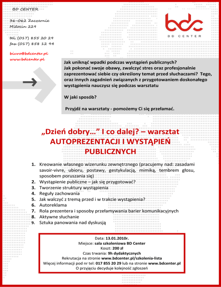 BD CENTER 36-062 Zaczernie Miłocin 229 tel. (017) 855 20 29 fax (017) 858 12 94 [email protected] www.bdcenter.pl Jak uniknąć wpadki podczas wystąpień publicznych? Jak pokonać swoje obawy, zwalczyć stres oraz profesjonalnie zaprezentować siebie czy określony temat przed słuchaczami? Tego, oraz innych zagadnień związanych z przygotowaniem doskonałego wystąpienia nauczysz się podczas warsztatu W jaki sposób? Przyjdź na warsztaty - pomożemy Ci się przełamać. „Dzień dobry…” I co dalej? – warsztat AUTOPREZENTACJI I WYSTĄPIEŃ PUBLICZNYCH 1. Kreowanie własnego wizerunku zewnętrznego (pracujemy nad: zasadami savoir-vivre, ubioru, postawy, gestykulacją, mimiką, tembrem głosu, sposobem poruszania się) 2. Wystąpienie publiczne – jak się przygotować? 3. Tworzenie struktury wystąpienia 4. Reguły zachowania 5. Jak walczyć z tremą przed i w trakcie wystąpienia? 6. Autoreklama 7. Rola prezentera i sposoby przełamywania barier komunikacyjnych 8. Aktywne słuchanie 9. Sztuka panowania nad dyskusją Data: 13.01.2010r. Miejsce: sala szkoleniowa BD Center Koszt: 200 zł Czas trwania: 9h dydaktycznych Rekrutacja na stronie www.bdcenter.pl/szkolenia-lista Więcej informacji pod nr tel: 017 855 20 29 lub na stronie www.bdcenter.pl O przyjęciu decyduje kolejność zgłoszeń