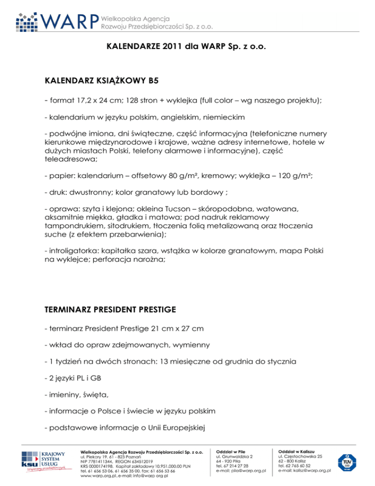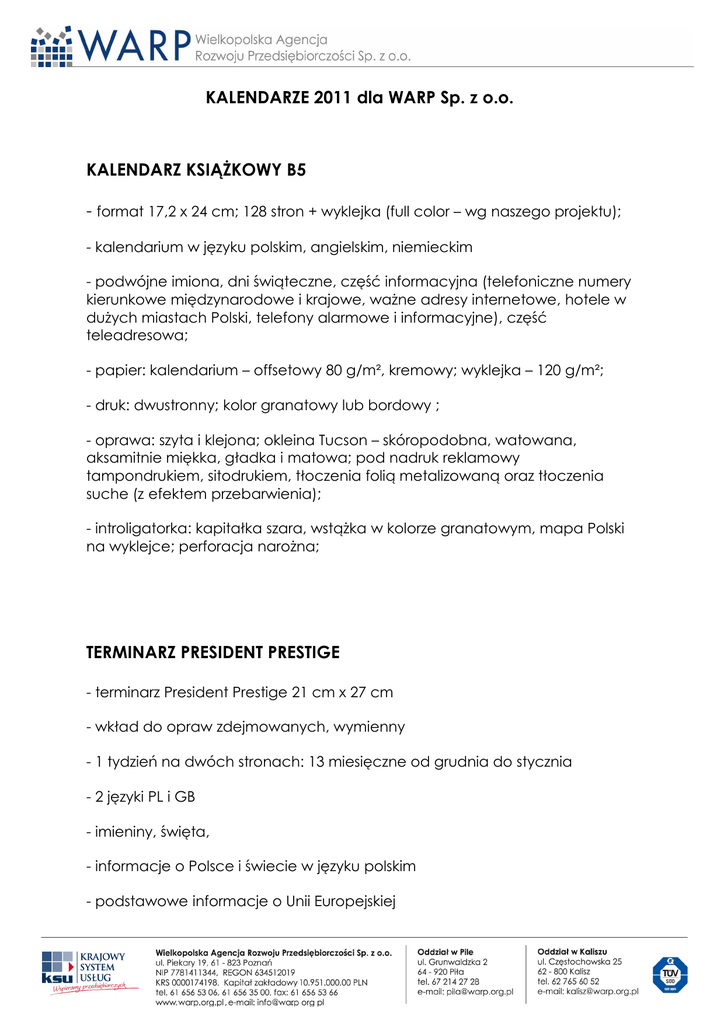 KALENDARZE 2011 dla WARP Sp. z o.o. KALENDARZ KSIĄŻKOWY B5 - format 17,2 x 24 cm; 128 stron + wyklejka (full color – wg naszego projektu); - kalendarium w języku polskim, angielskim, niemieckim - podwójne imiona, dni świąteczne, część informacyjna (telefoniczne numery kierunkowe międzynarodowe i krajowe, ważne adresy internetowe, hotele w dużych miastach Polski, telefony alarmowe i informacyjne), część teleadresowa; - papier: kalendarium – offsetowy 80 g/m², kremowy; wyklejka – 120 g/m²; - druk: dwustronny; kolor granatowy lub bordowy ; - oprawa: szyta i klejona; okleina Tucson – skóropodobna, watowana, aksamitnie miękka, gładka i matowa; pod nadruk reklamowy tampondrukiem, sitodrukiem, tłoczenia folią metalizowaną oraz tłoczenia suche (z efektem przebarwienia); - introligatorka: kapitałka szara, wstążka w kolorze granatowym, mapa Polski na wyklejce; perforacja narożna; TERMINARZ PRESIDENT PRESTIGE - terminarz President Prestige 21 cm x 27 cm - wkład do opraw zdejmowanych, wymienny - 1 tydzień na dwóch stronach: 13 miesięczne od grudnia do stycznia - 2 języki PL i GB - imieniny, święta, - informacje o Polsce i świecie w języku polskim - podstawowe informacje o Unii Europejskiej - atlas z kolorowymi mapami - registry (odrywane narożniki) - papier chamois - druk dwa kolory bordowy 187 U, szary 430 U - wnętrze kremowe - okładka granatowa (materiał do uzgodnienia) - nakład 300 sztuk - granatowa wstążka z białym nadrukiem do 50mm www.warp.org.pl - logo (WARP) naszyte na front okładki wykonane z brązowej skóry ekologicznej o rozm.95mm x 35mm - dodatkowo wklejka wielkości strony terminarza full color KALENDARZ TRÓJDZIELNY 30 cm X 79 cm (po rozłożeniu) - podkład/plecy kalendarza karton 350 - kolor 4+0 CMYK - główka kaszerowana - wybiórczo lakier UV - całość podkładu i główki lakier dyspersja mat - kalendaria standard pl/GB, kolor zadruku szaro – czerwony (lub bordowy), offset - imieniny + przezroczysta taśma z granatowym lub czerwonym okienkiem + dodatkowo koperta do kalendarza